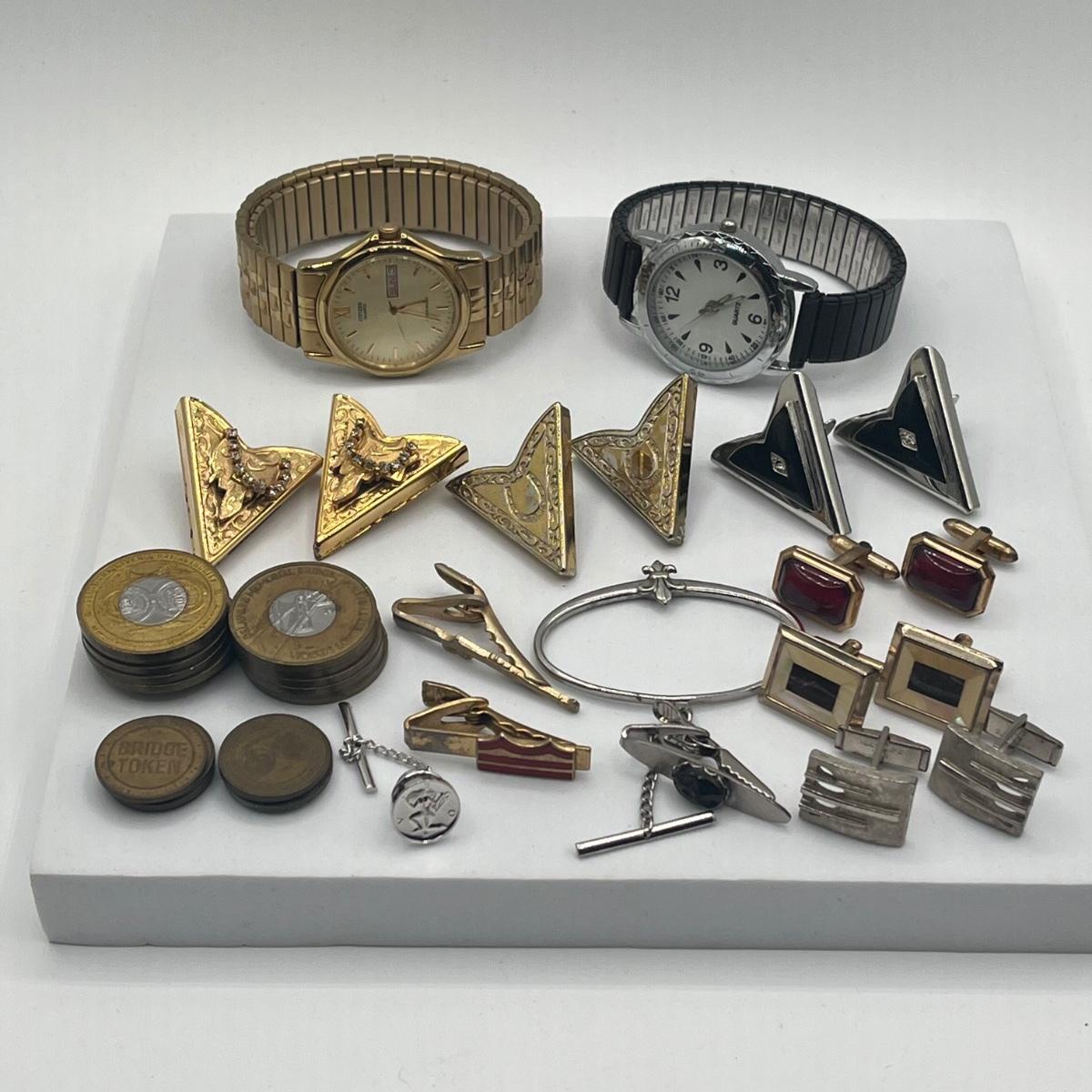 LOT 293J: Men's Lot - Cuff Links, Tie Tacks / Clips, Collar Tips, Watches, Vintage Delaware Bridge Tokens