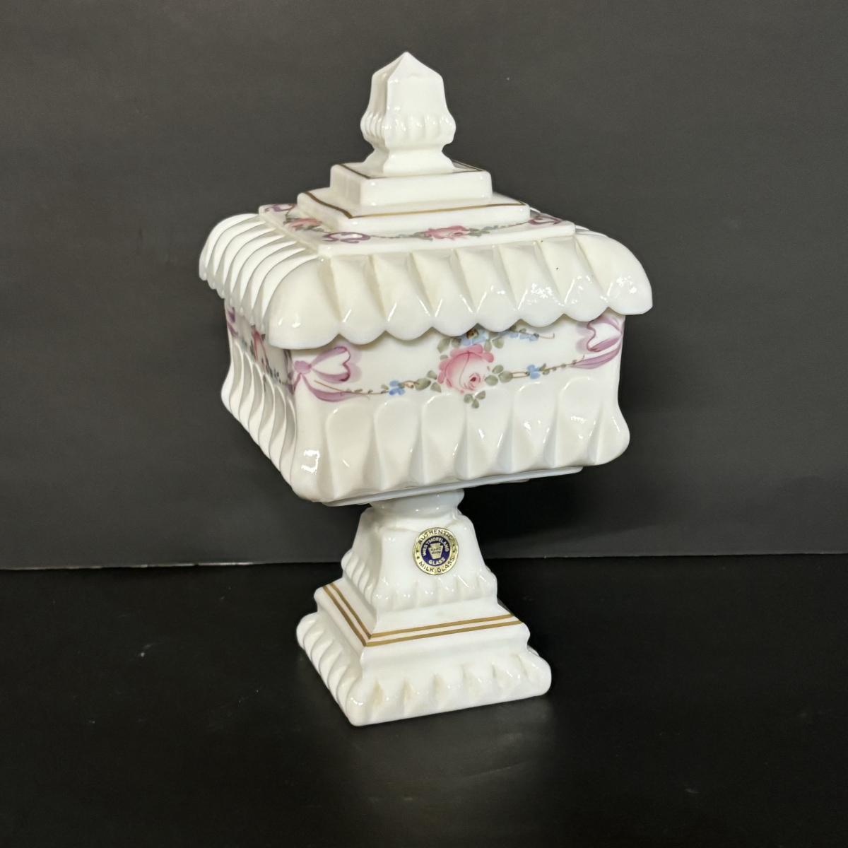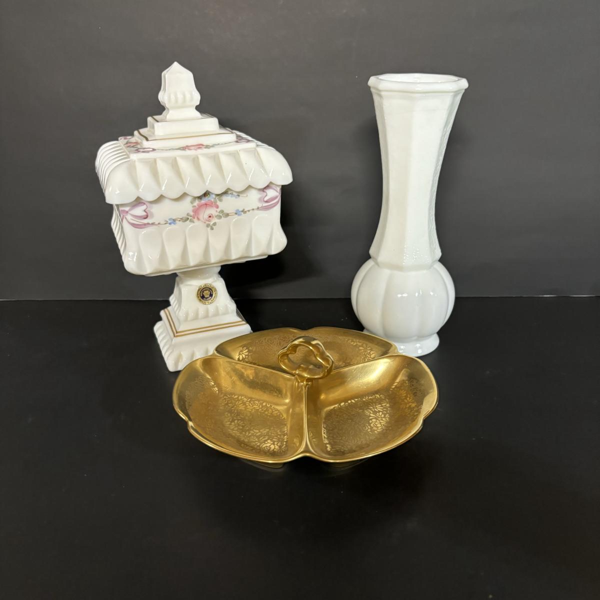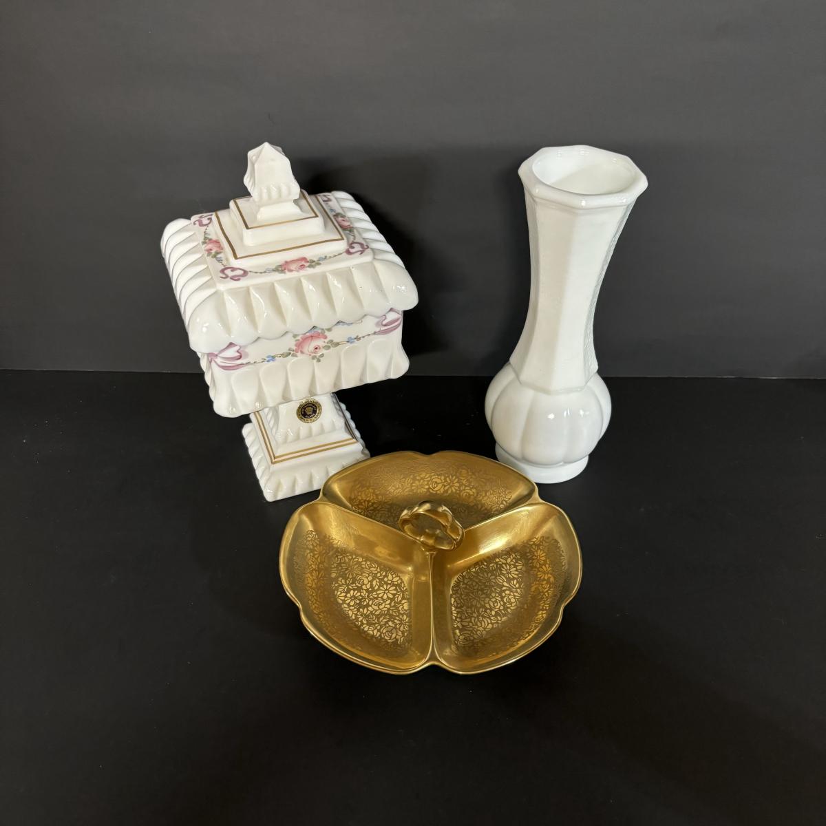 LOT 12: Westmorland Milk Glass Candy Dish, Pickard Gold China Dish & Milk Glass Vase