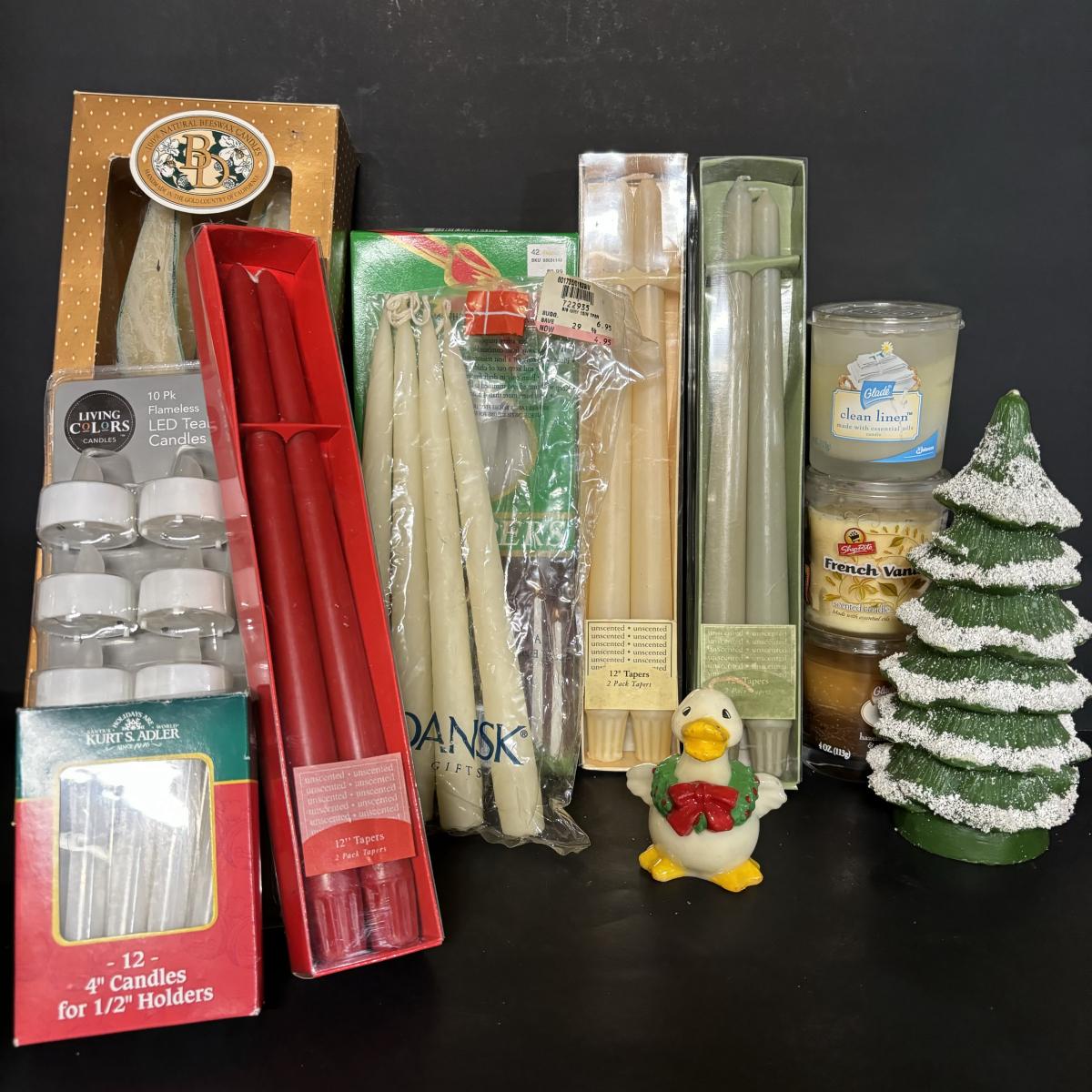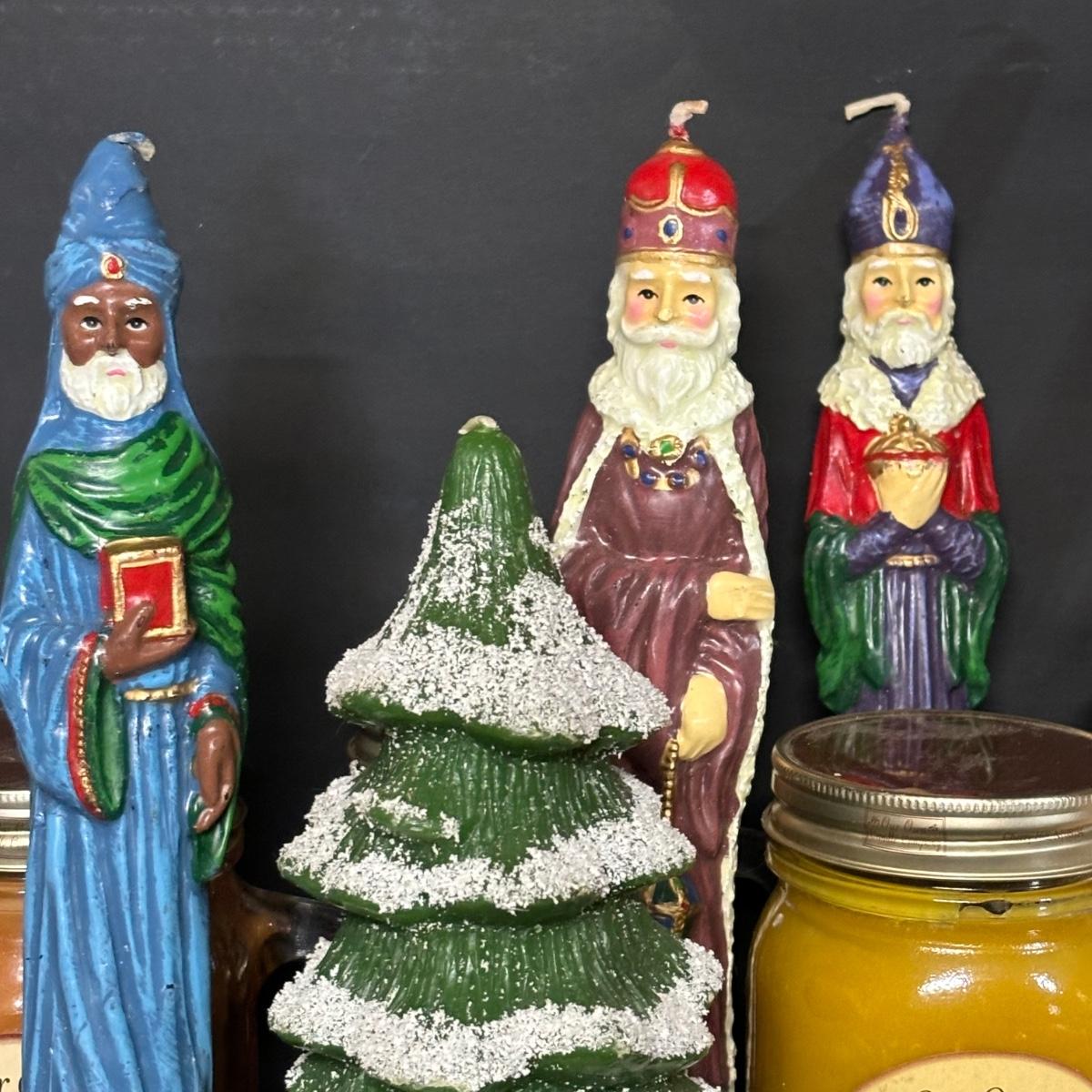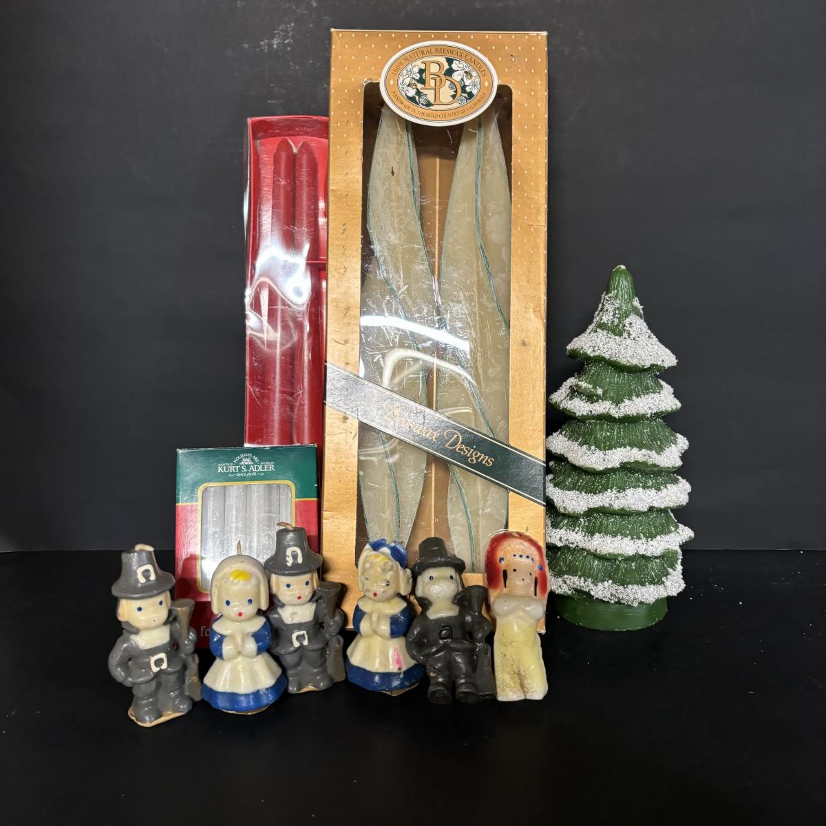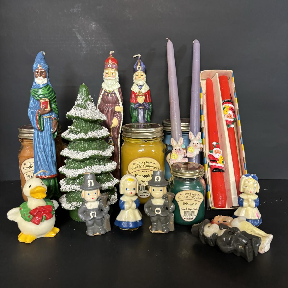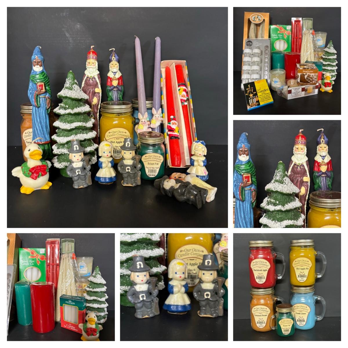 LOT 19: Candle Collection: Holiday Tapers, Vintage Pilgrims, Our Own Candle Co., Three King Tapers, Beeswax & More