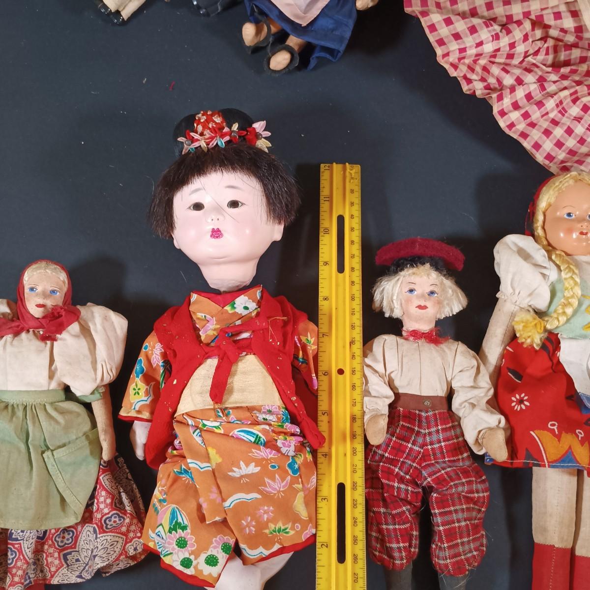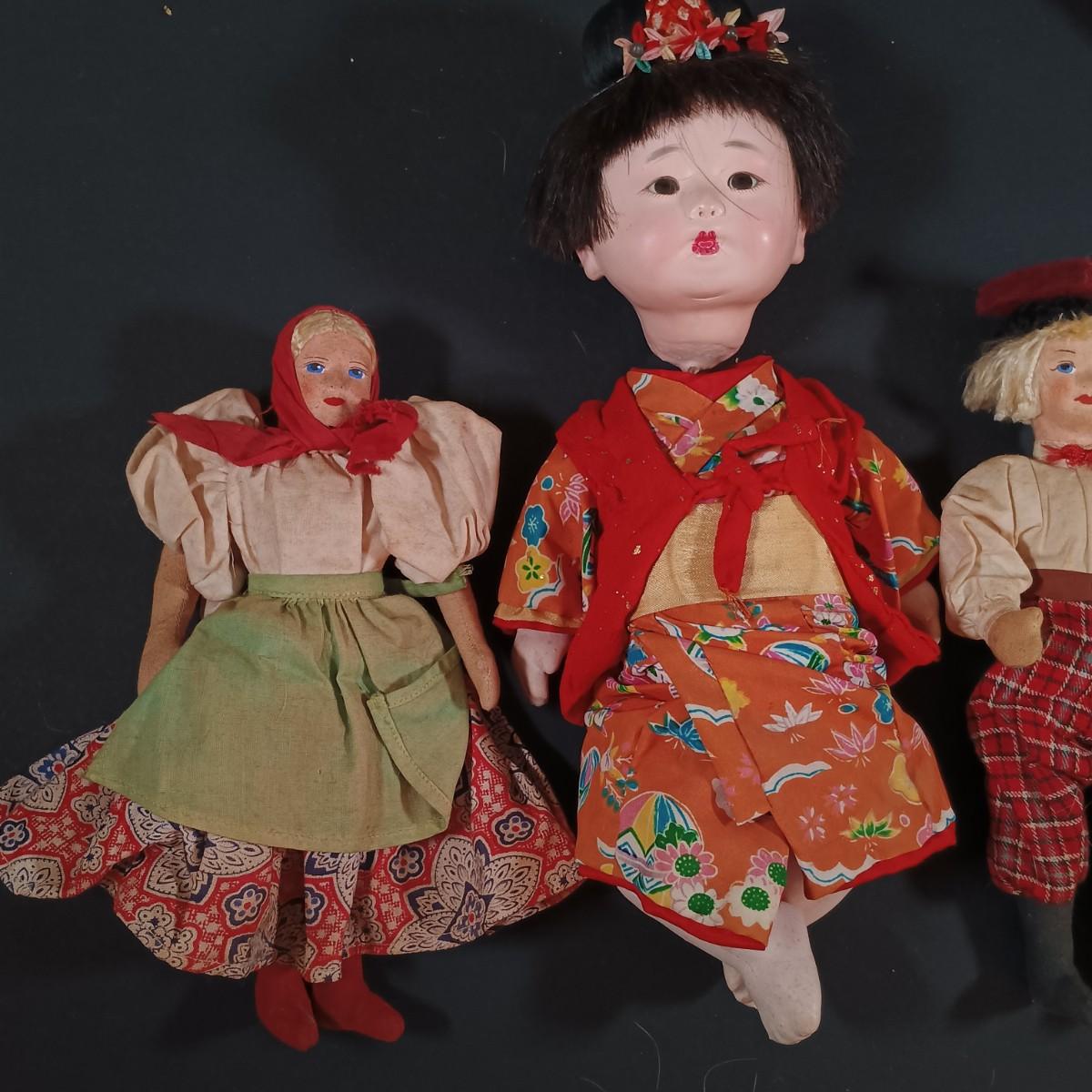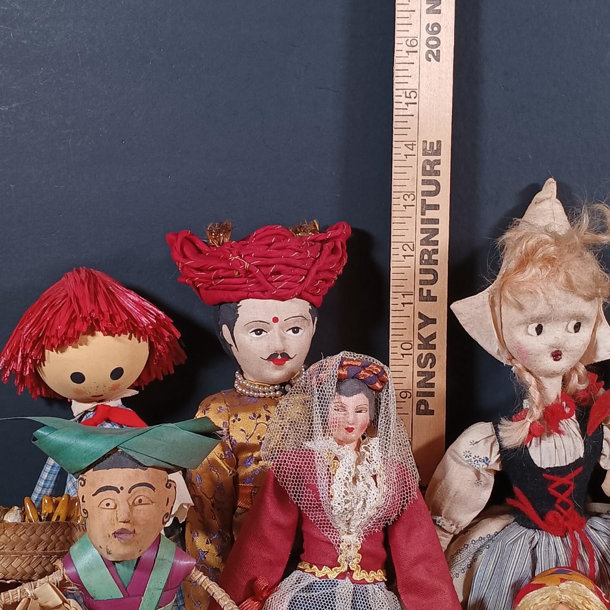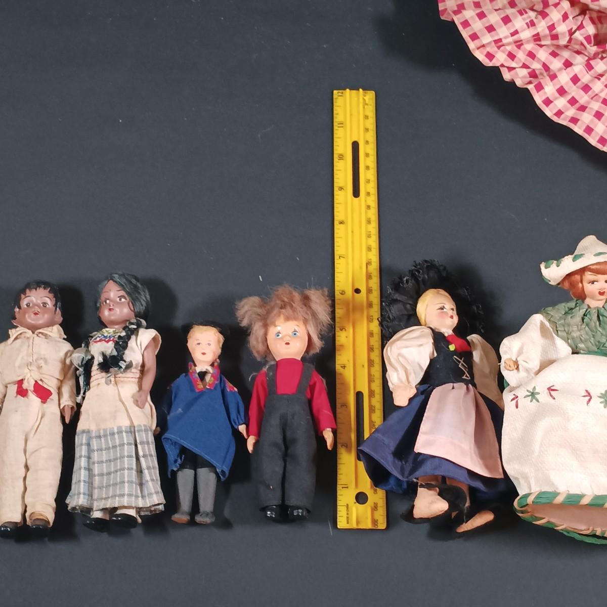 LOT 28: Vintage Handmade Dolls From Around the World- Italian Wrist Purse Doll, Japanese Ichimatsu Gofun Doll, Polish Celluloid Face Rag Doll & More