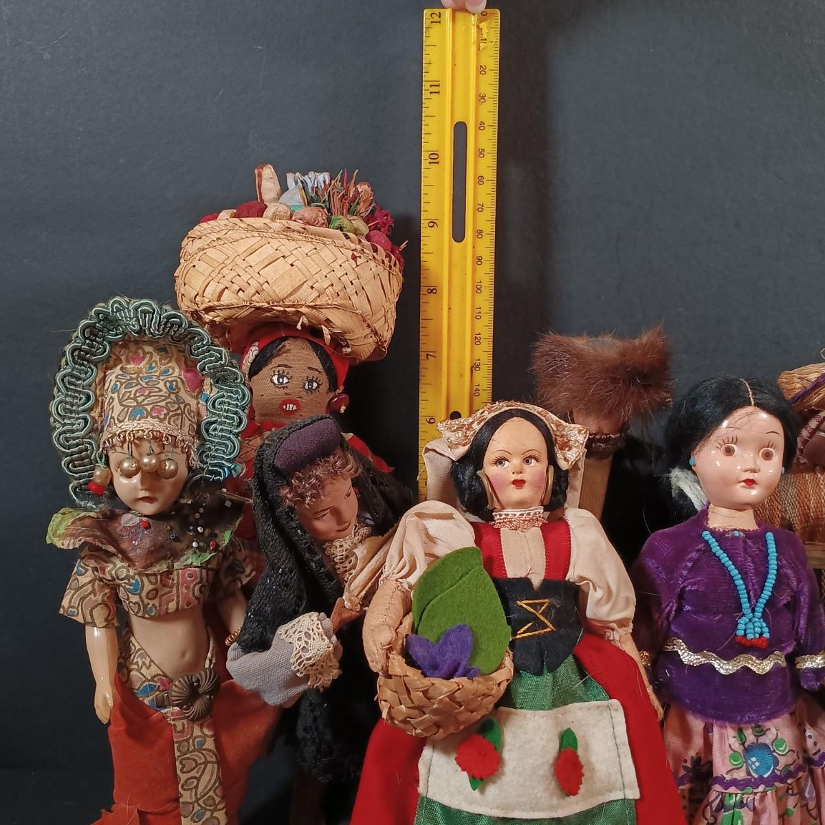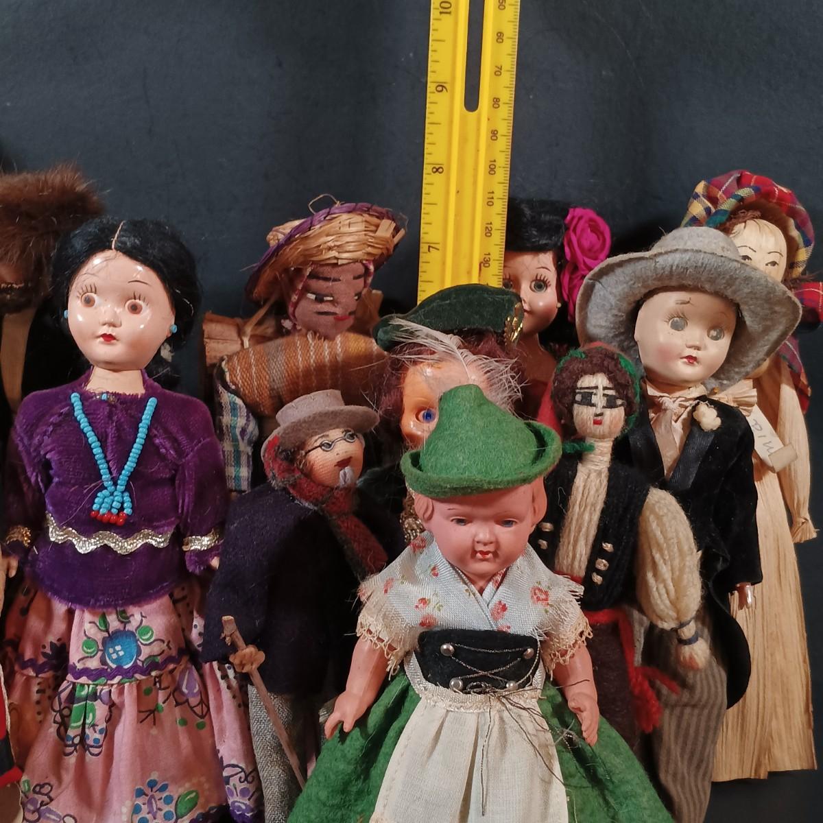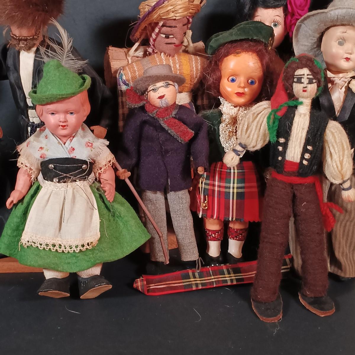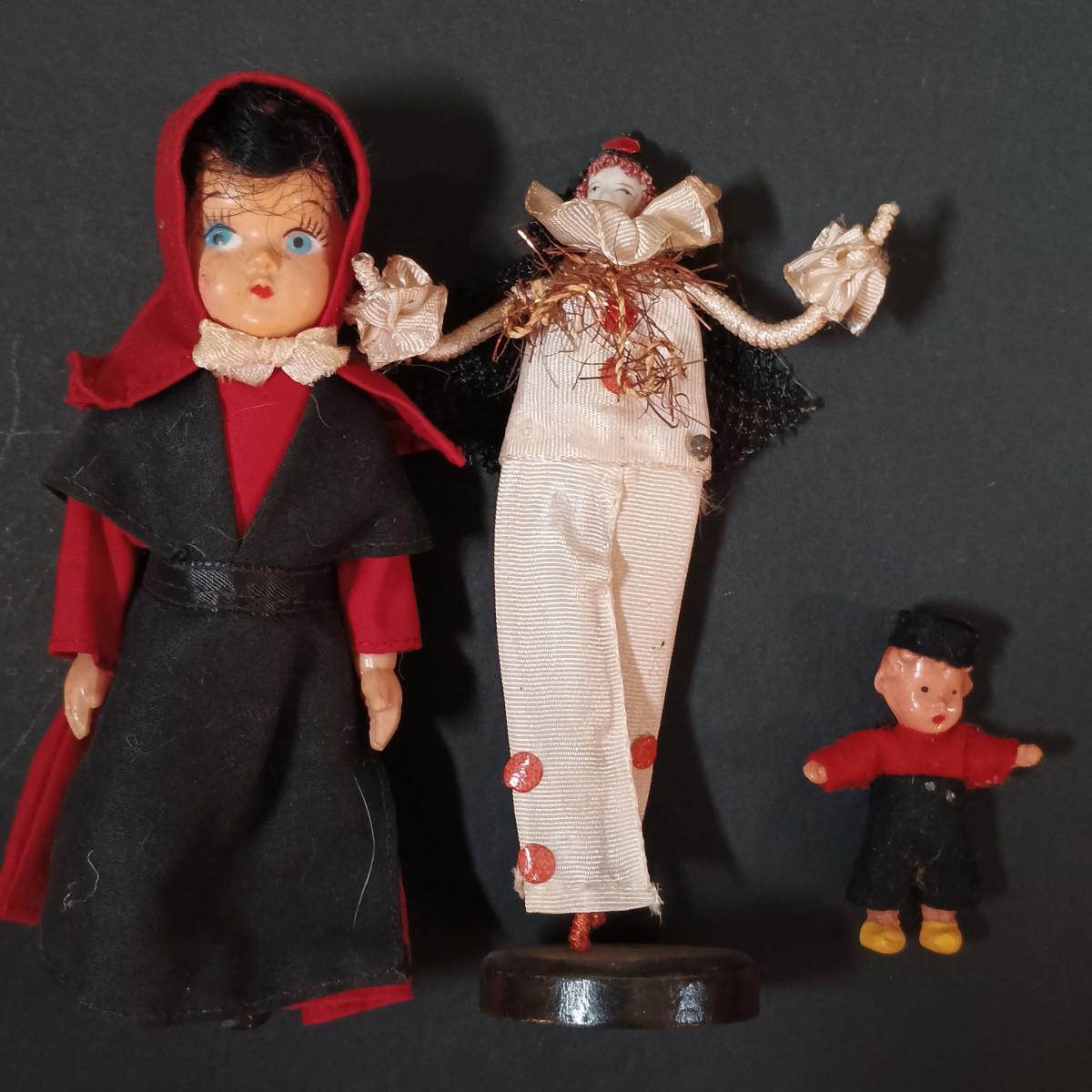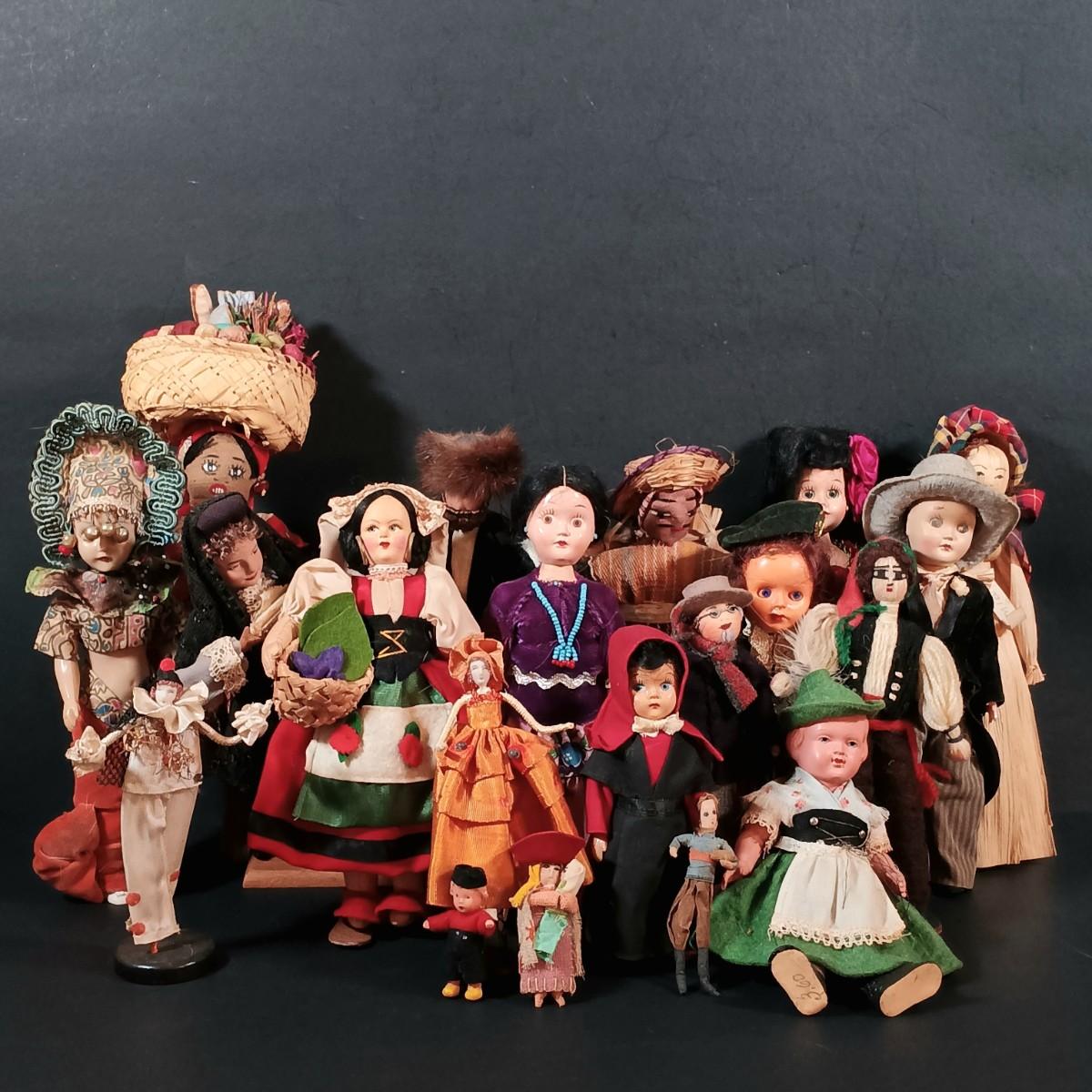 LOT 29: Vintage Handmade Tourist Dolls- Pierrot Jester, Lancaster Amish Girl, Navajo Composition Doll & More