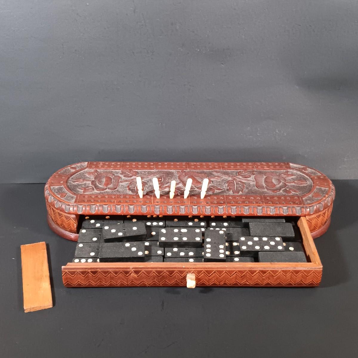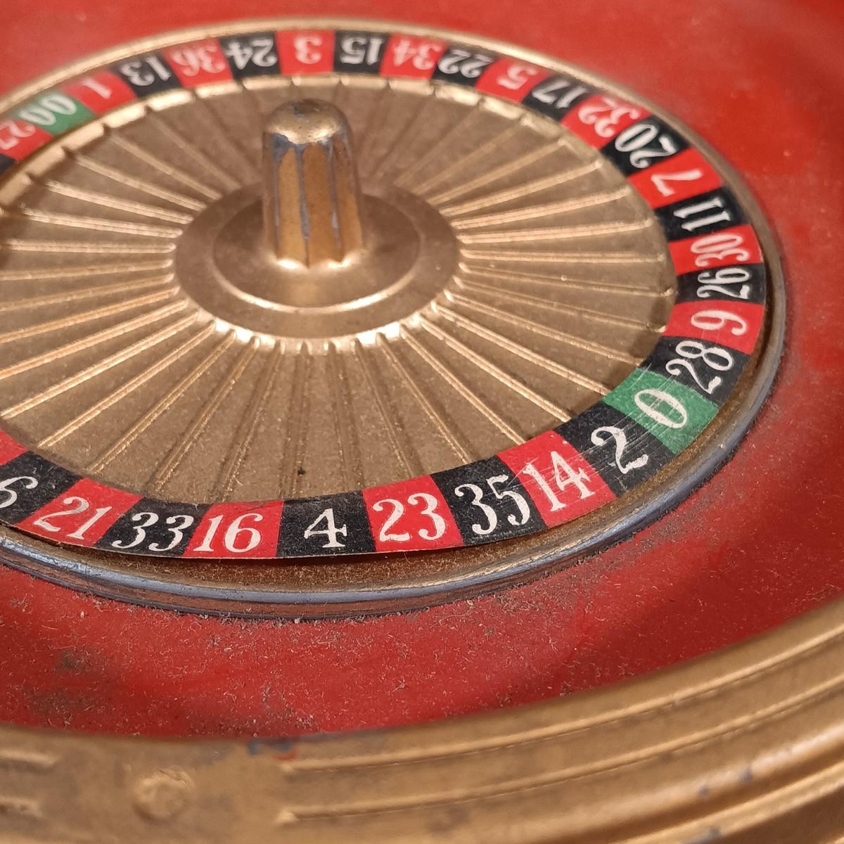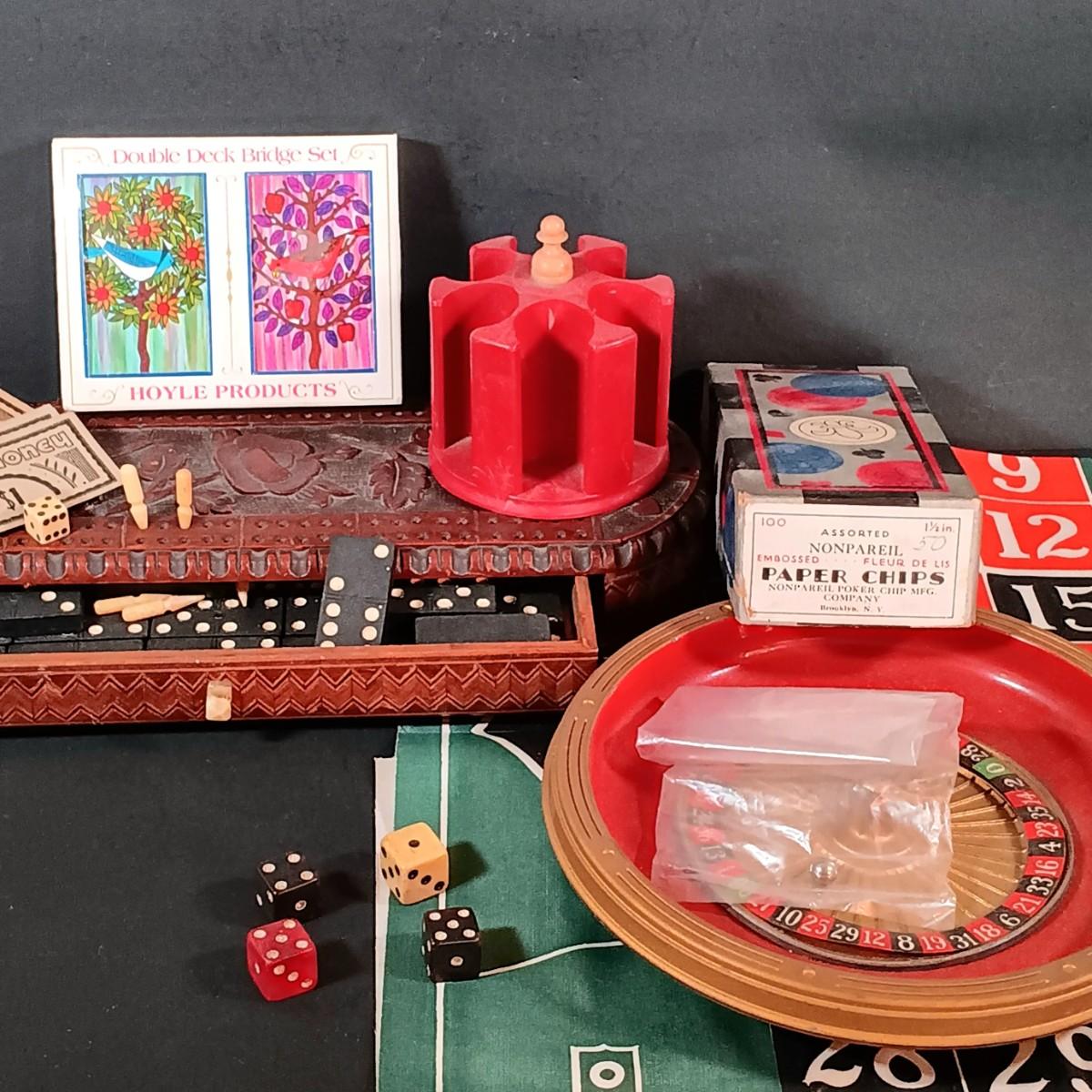 LOT 37: Antique Cribbage Board with Dominoes, Novelty Metal Roulette Table, Vintage 1930s Paper Milton Bradley Money & More