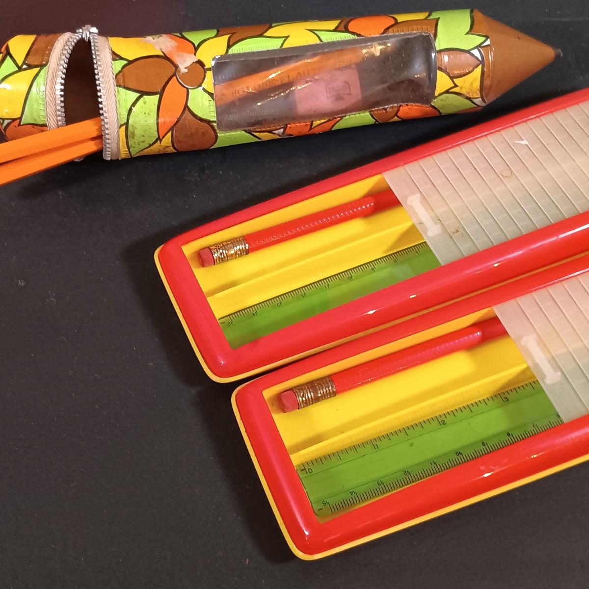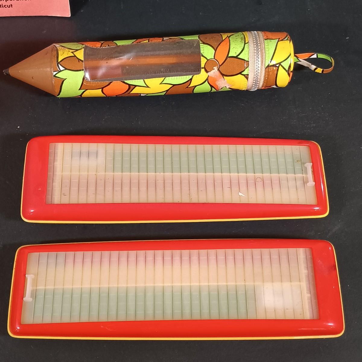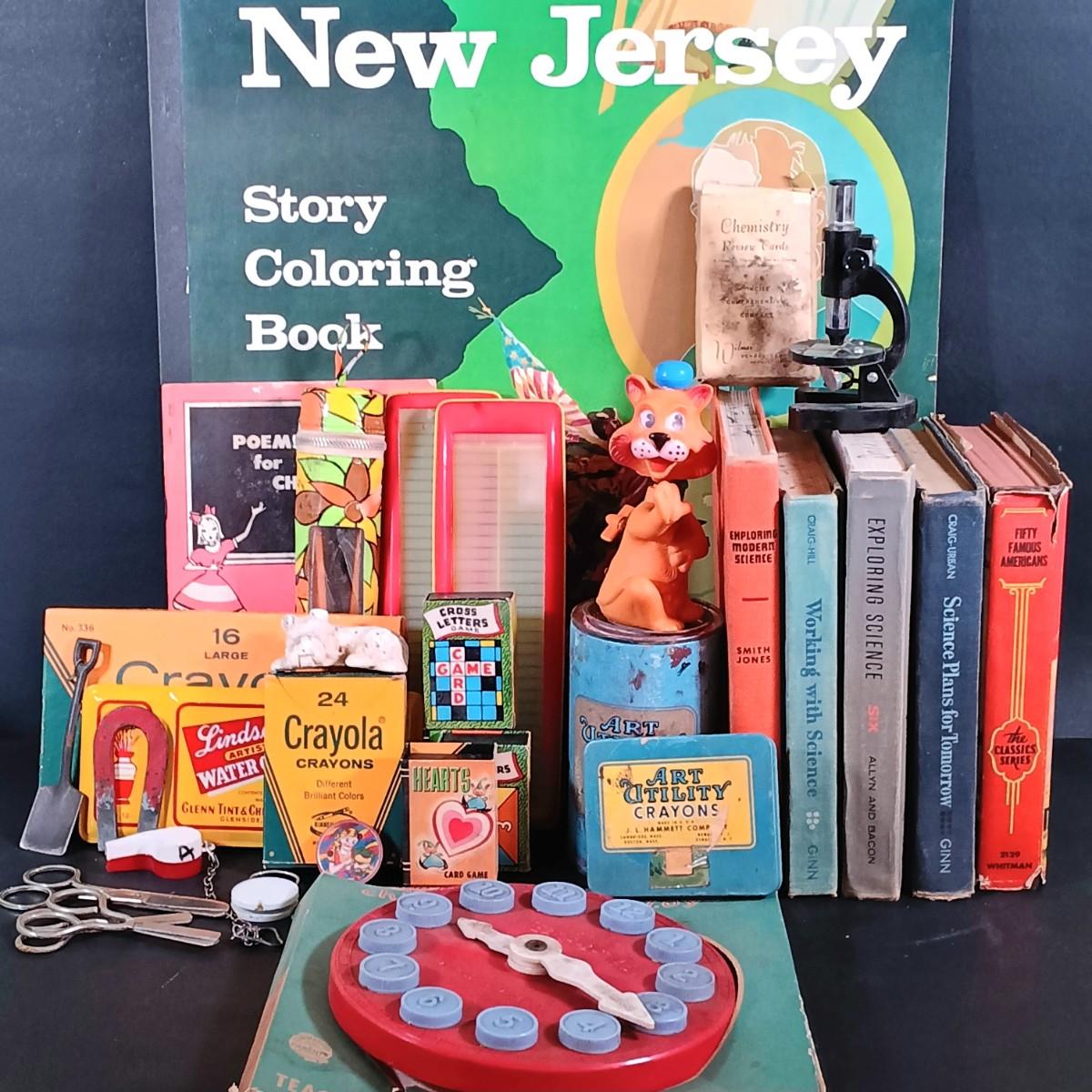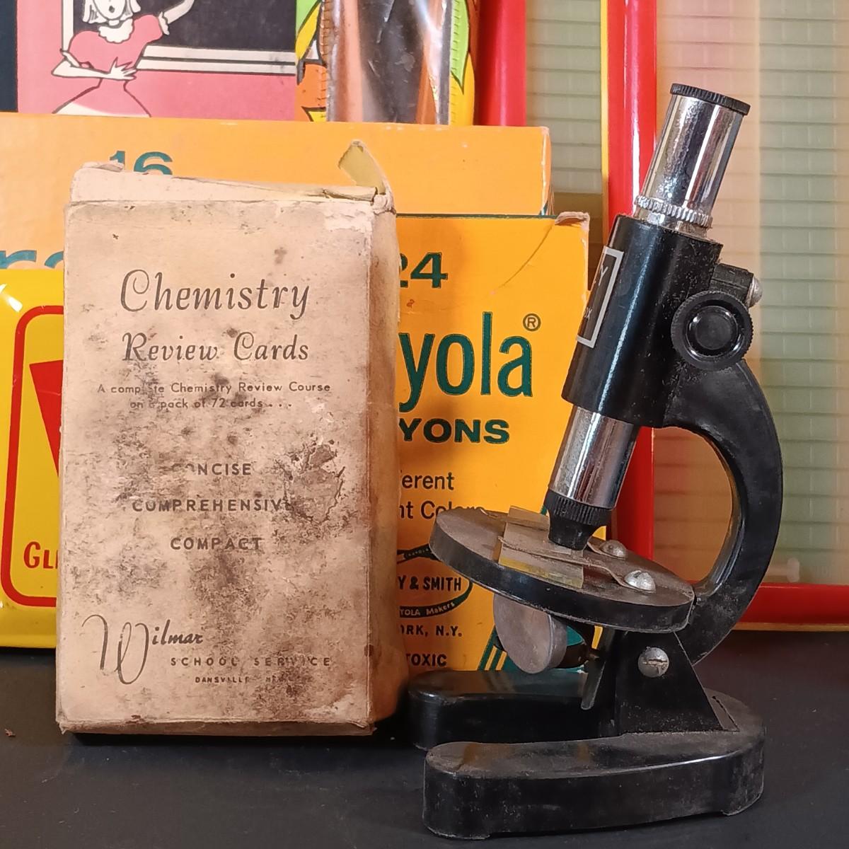 LOT 45: Vintage School Collection- Mini Microscope and Chemistry Cards, 1960s Slide Top Pencil Cases, Knickerbocker Dancing Animal & More