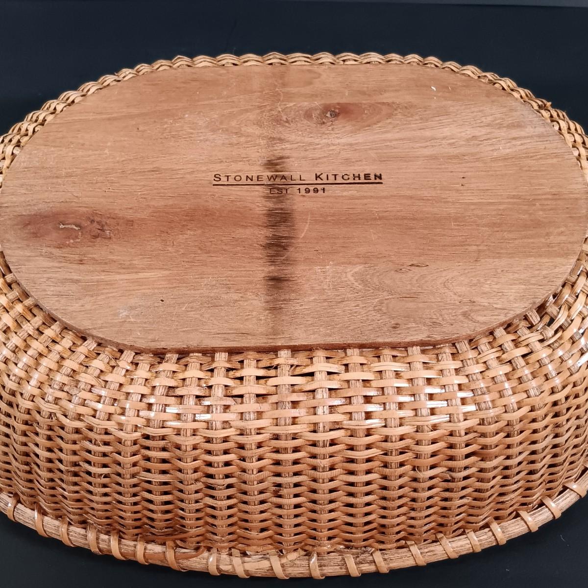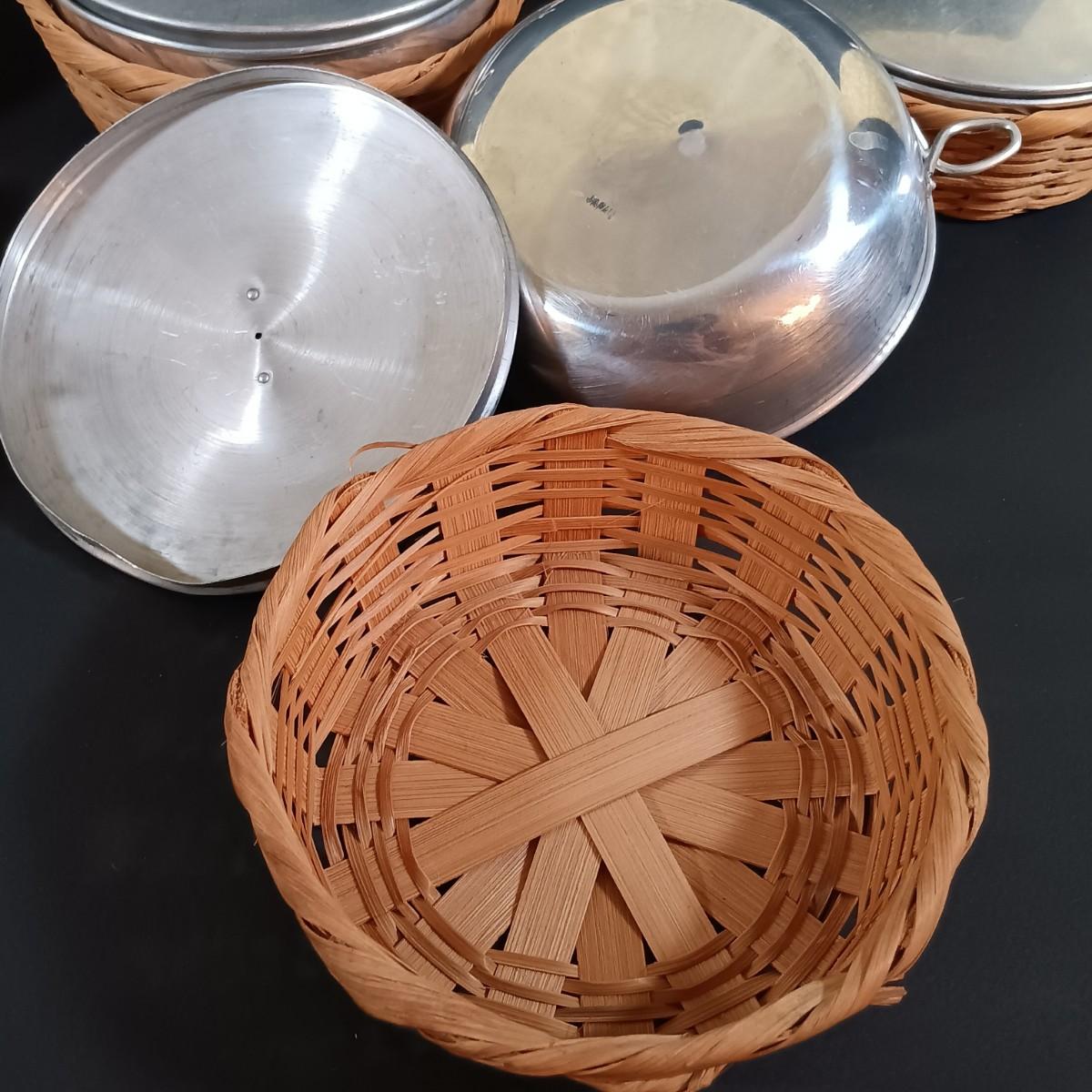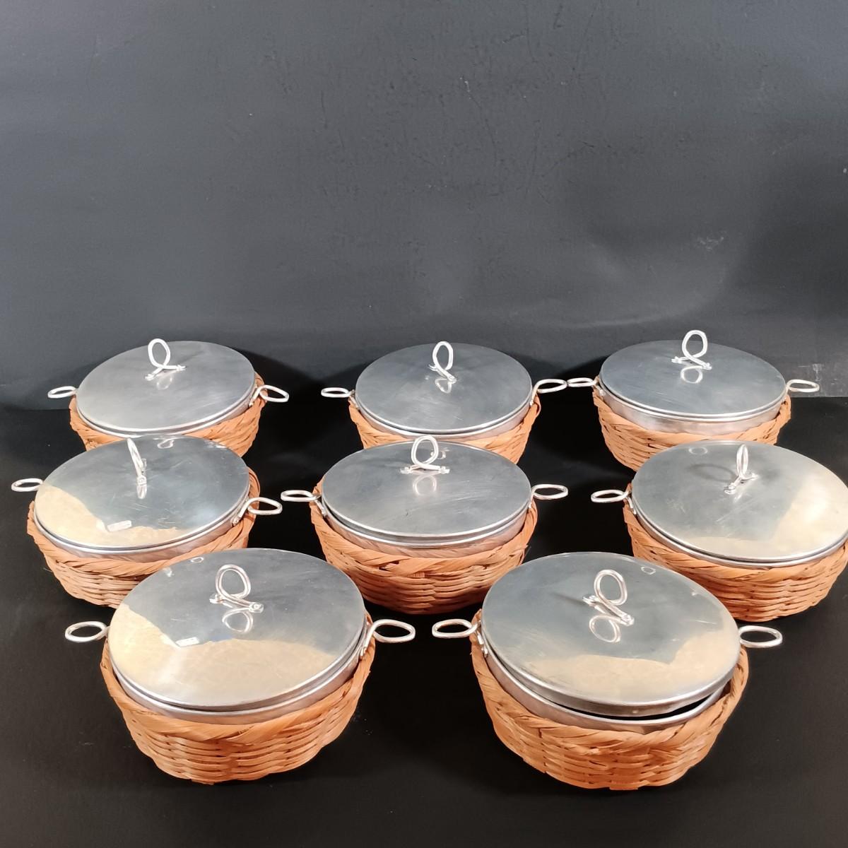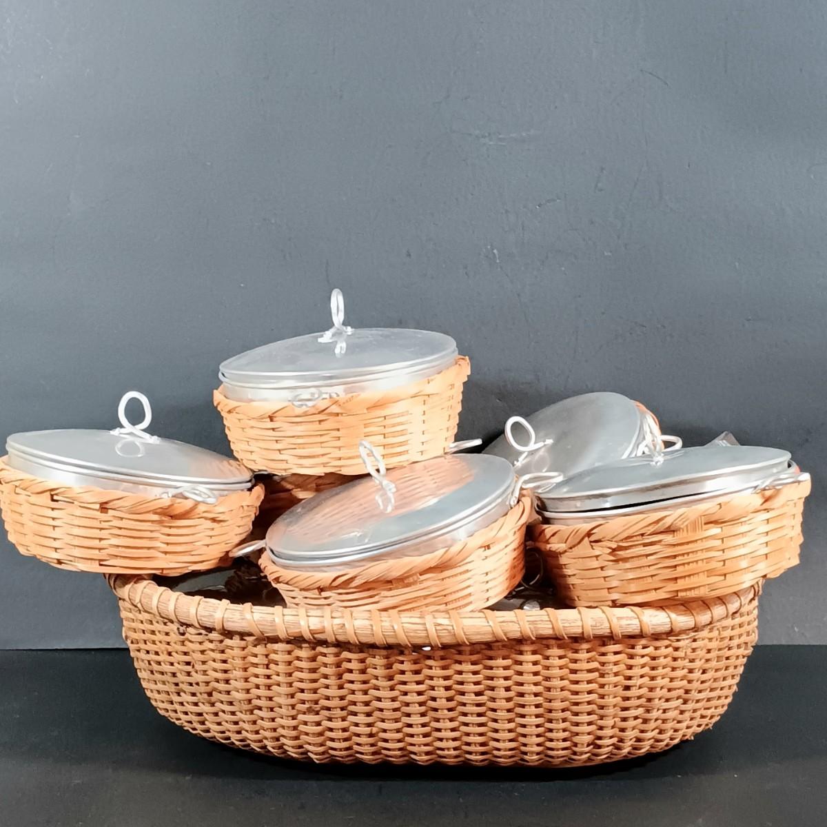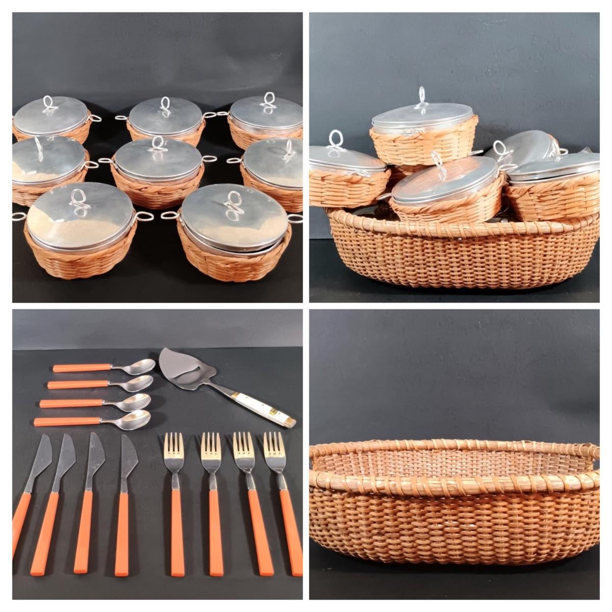 LOT 52: Nantucket Basket, Vintage Aluminum Cover Bowls w/Wicker Baskets, 12 pc. Flatware Set & Vintage Sheffield Cheese Knife