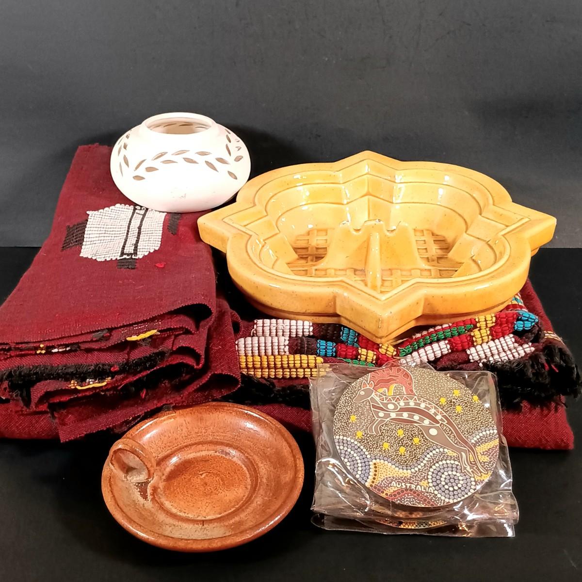 LOT 53: Handwoven Latin American Style Napkins and Tablecloth with Atlantic Mold Ashtray, Signed D. Randolph Pottery & More