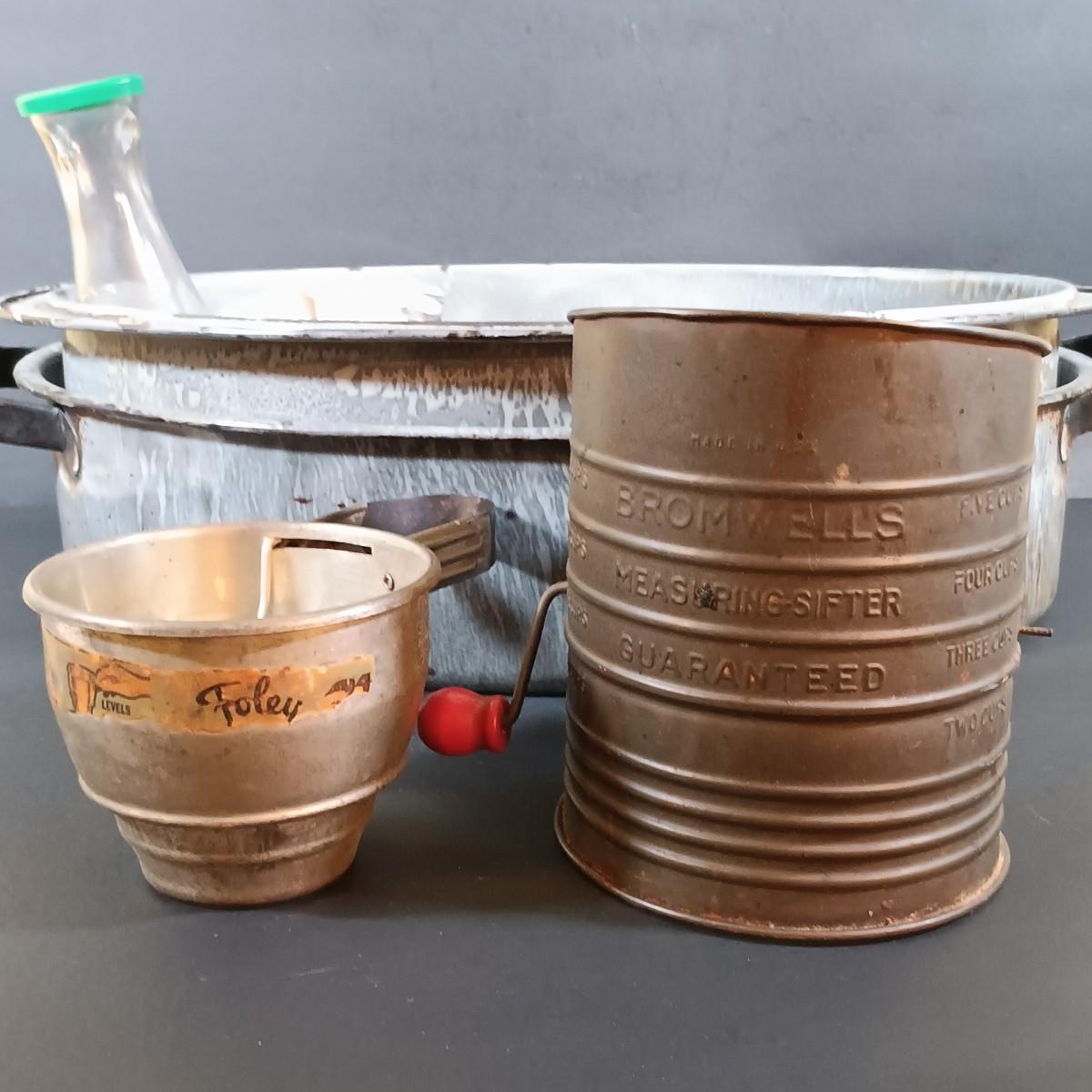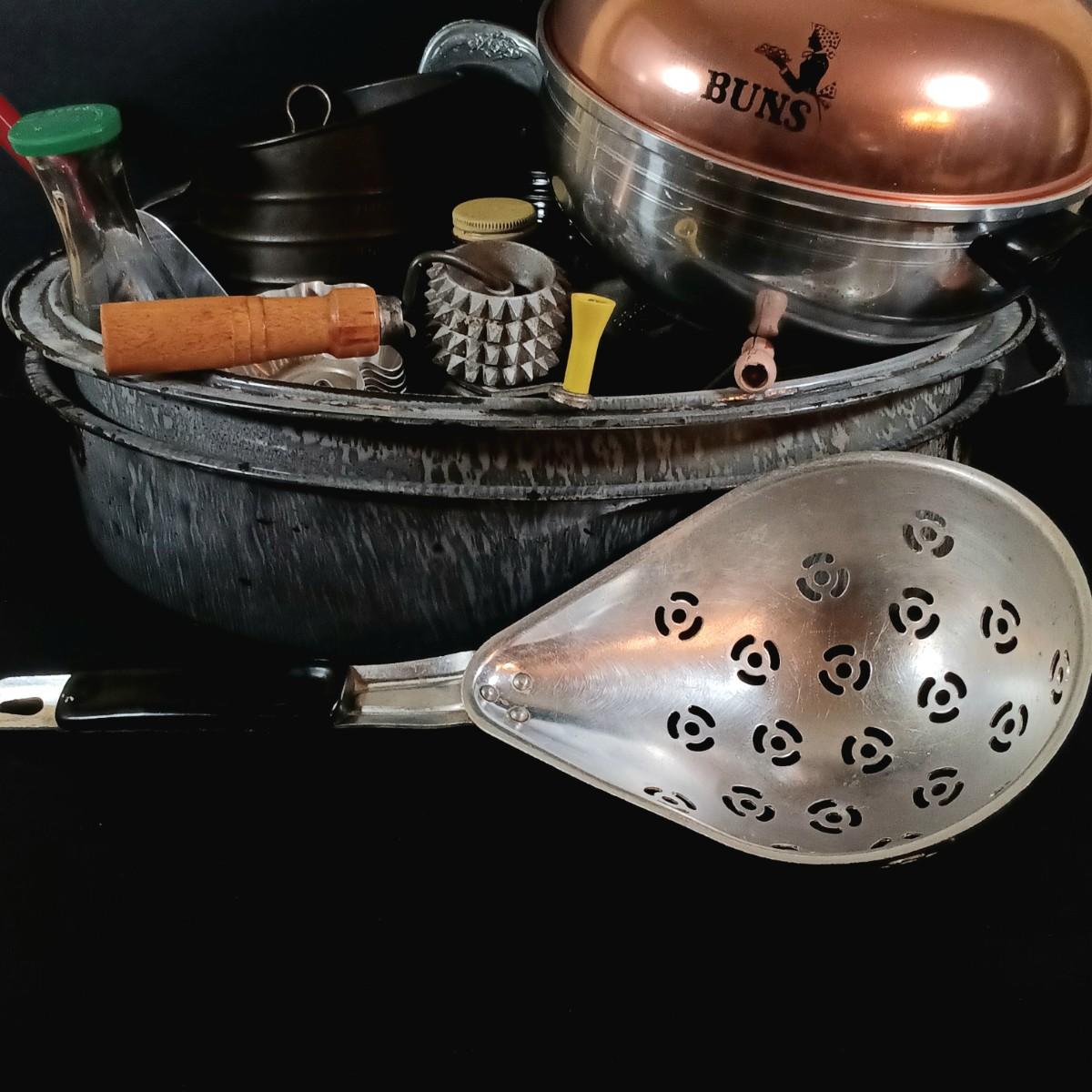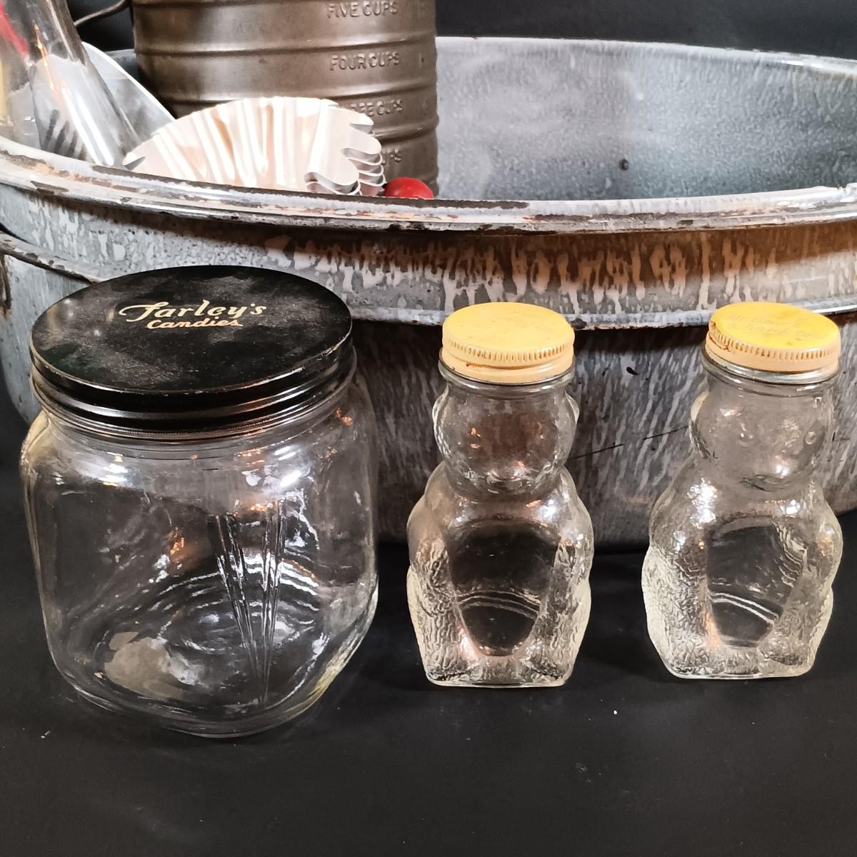 LOT 54: Vintage Kitchen Ware: Bun Warmer, Gadgets, Stainer/Sieve Canning Colander, Bear Jars, Farley's Candy Jar & More