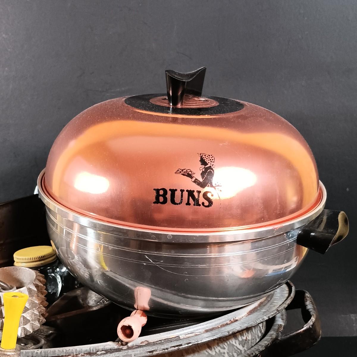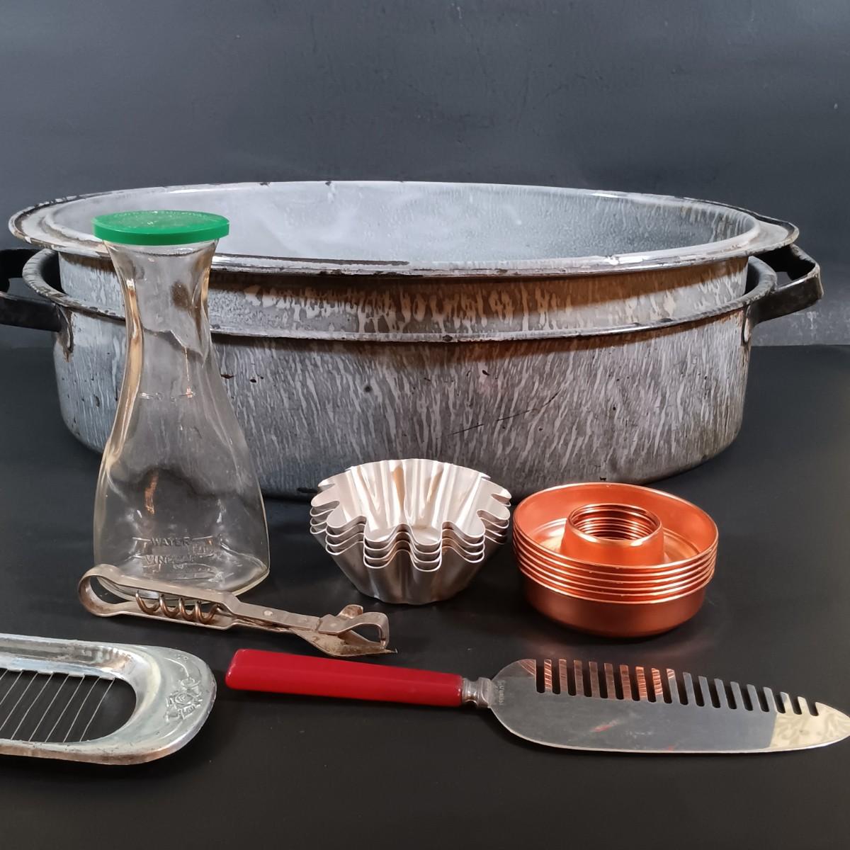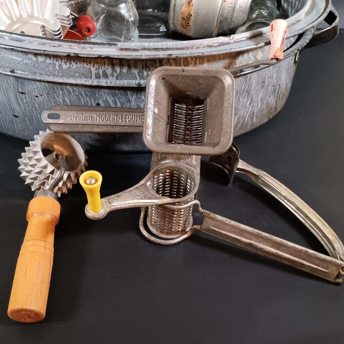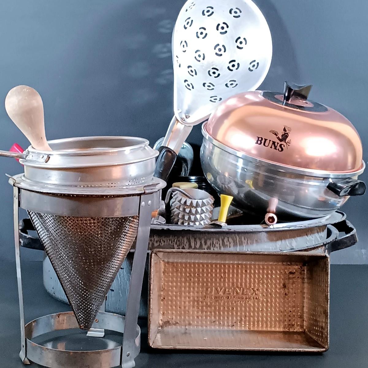 LOT 54: Vintage Kitchen Ware: Bun Warmer, Gadgets, Stainer/Sieve Canning Colander, Bear Jars, Farley's Candy Jar & More