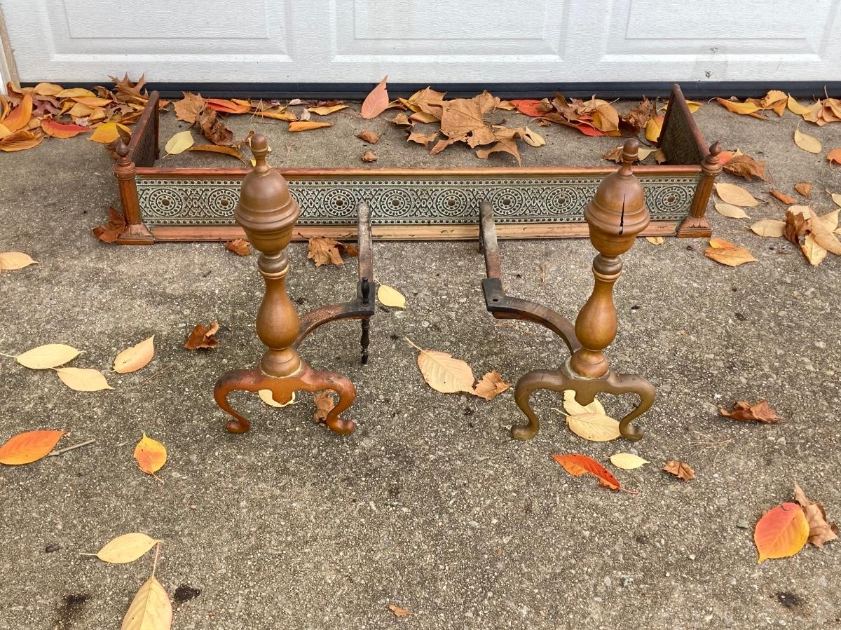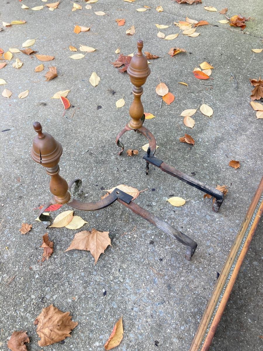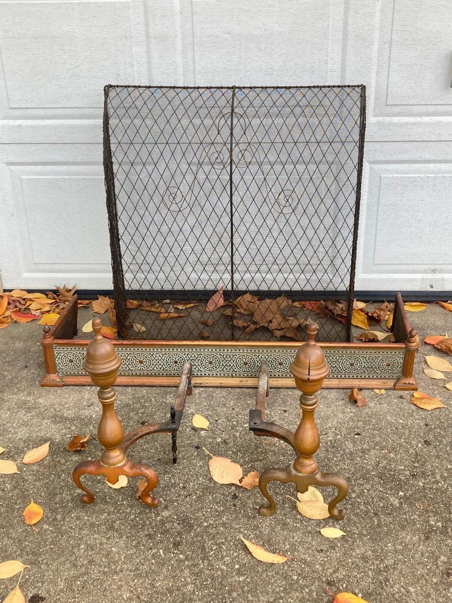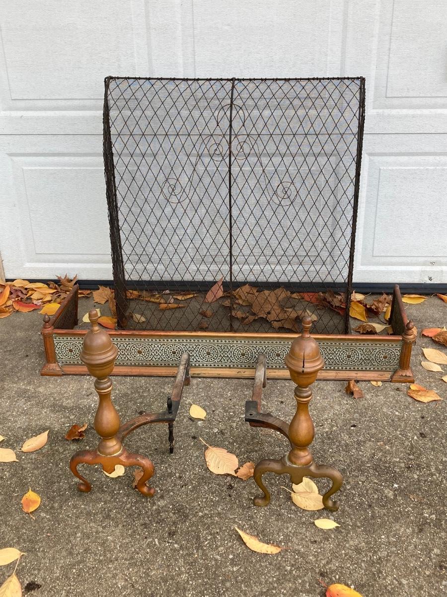 LOT 58: Vintage Fireplace Accessories - Andirons, Fire Fender and Screen