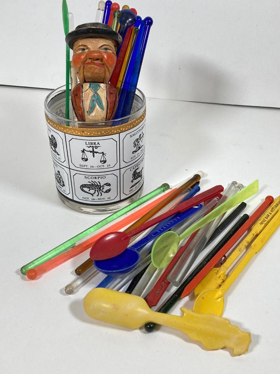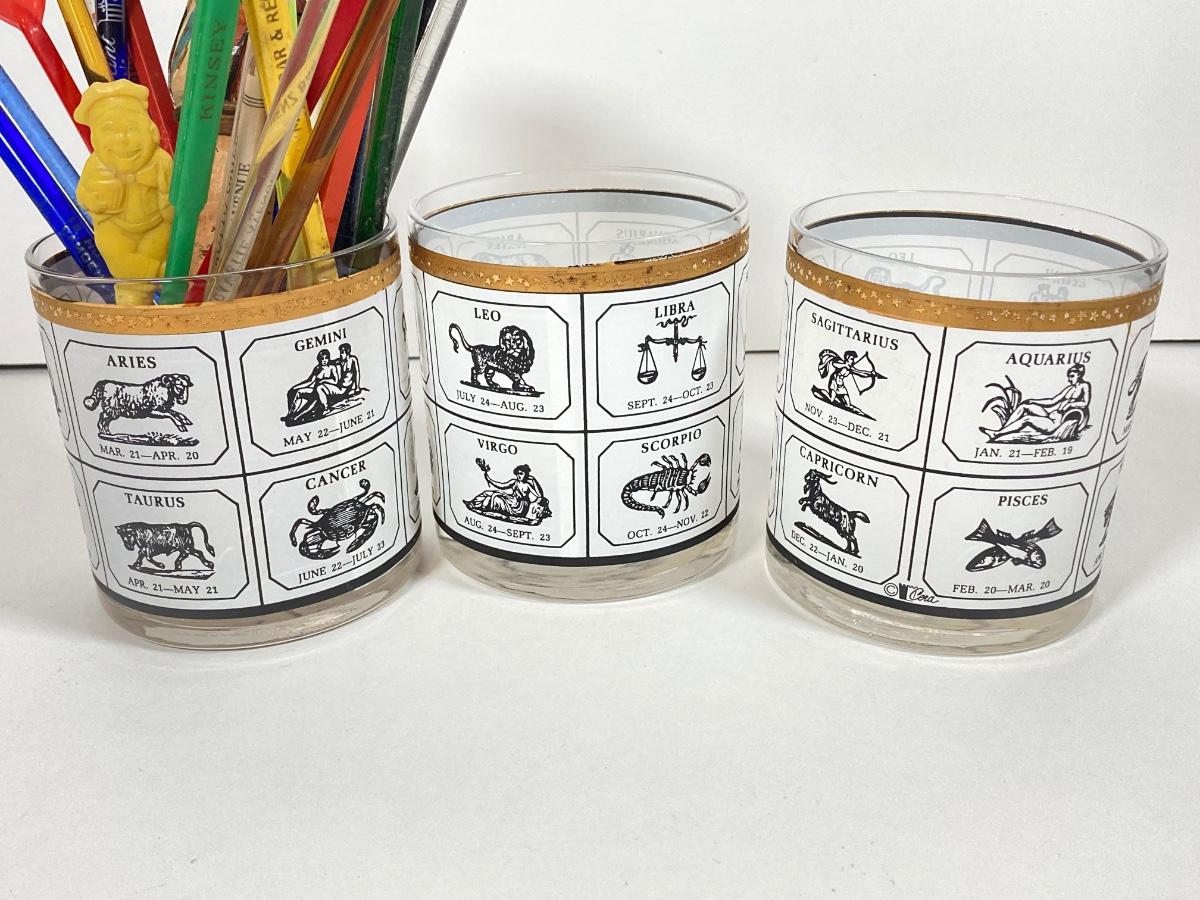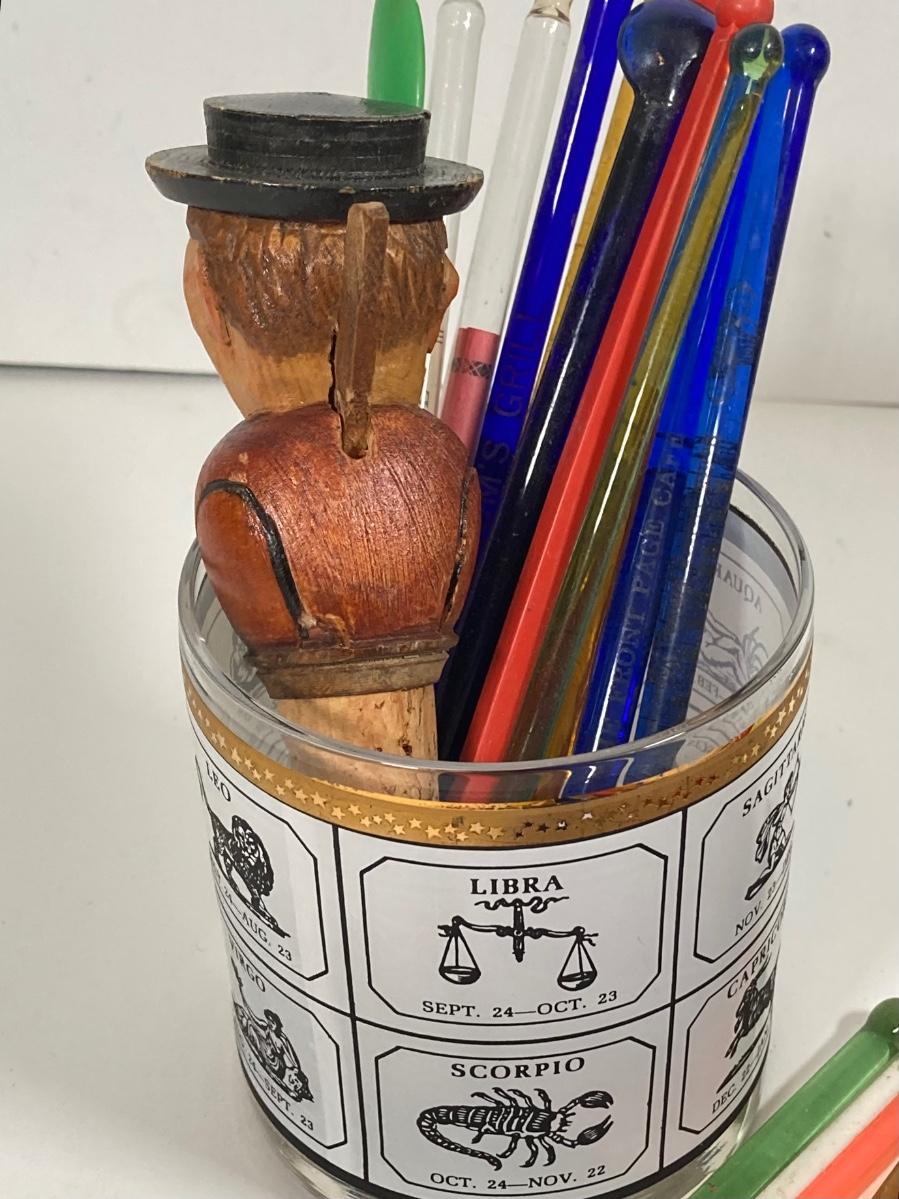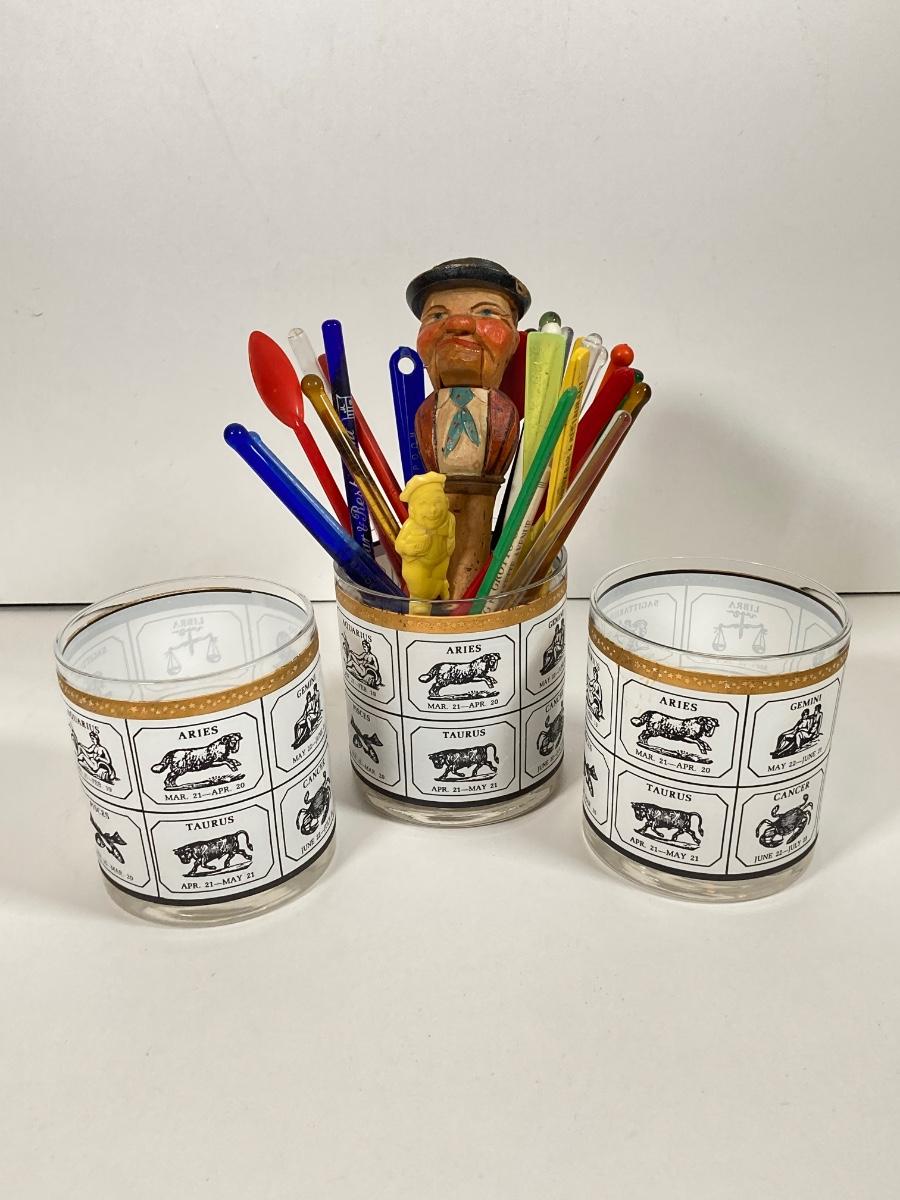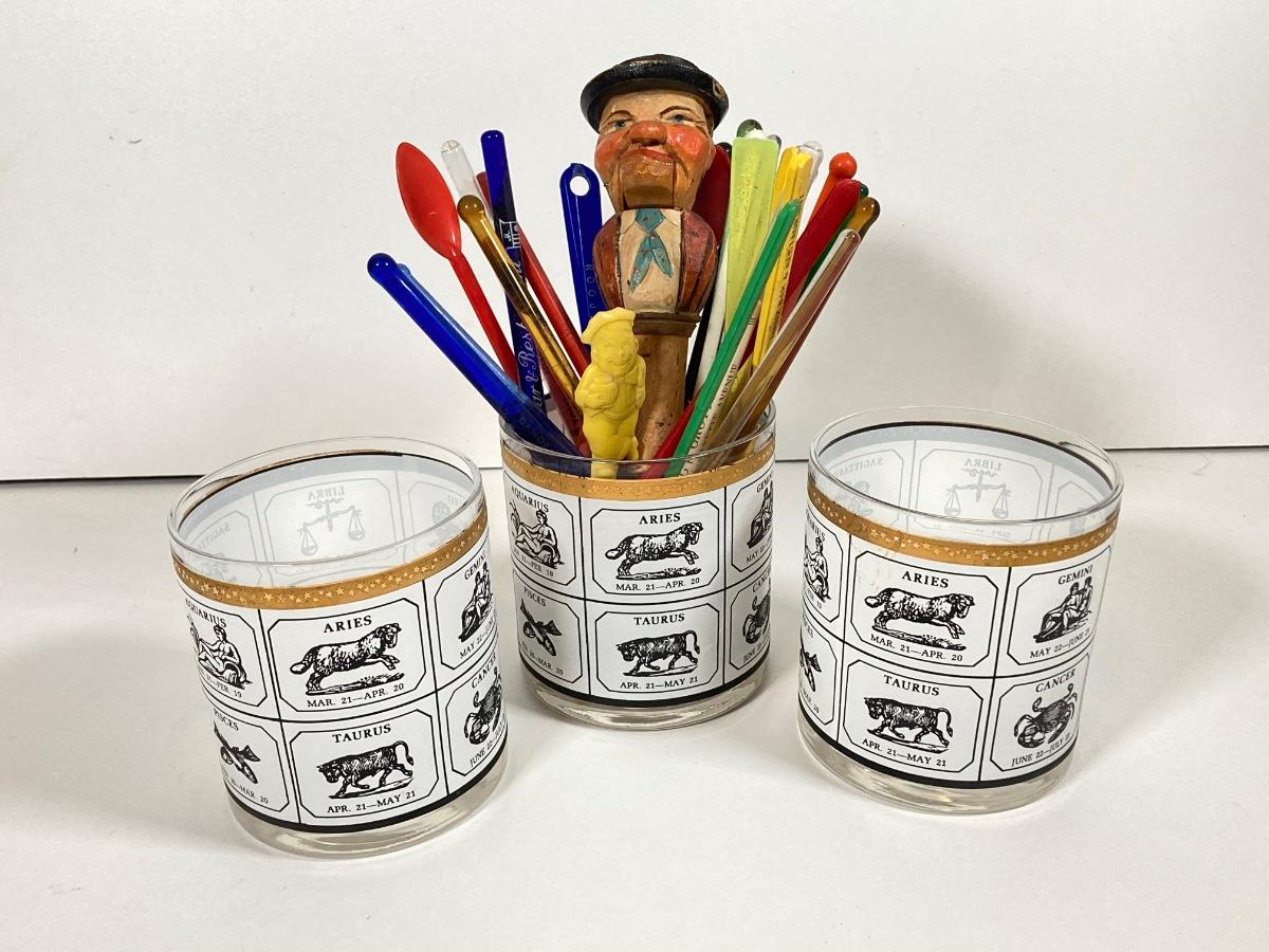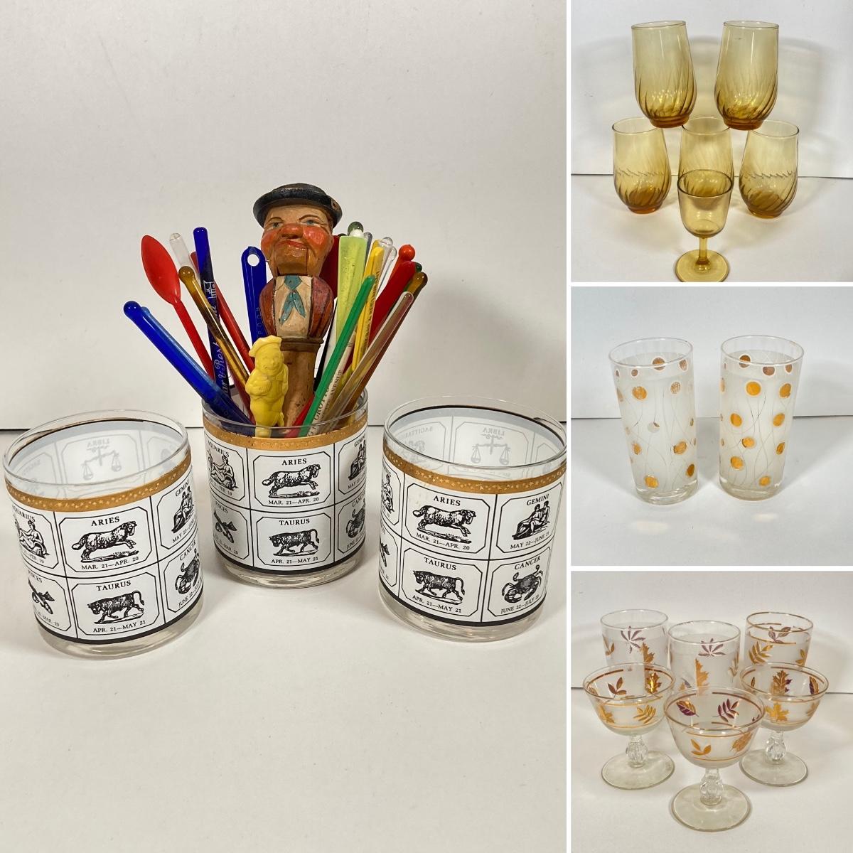 LOT 70: Collection of Vintage Glassware and More - Zodiac, Gold Tone, Amber with Glass / Plastic Stirrers and Carved Bottle Stopper