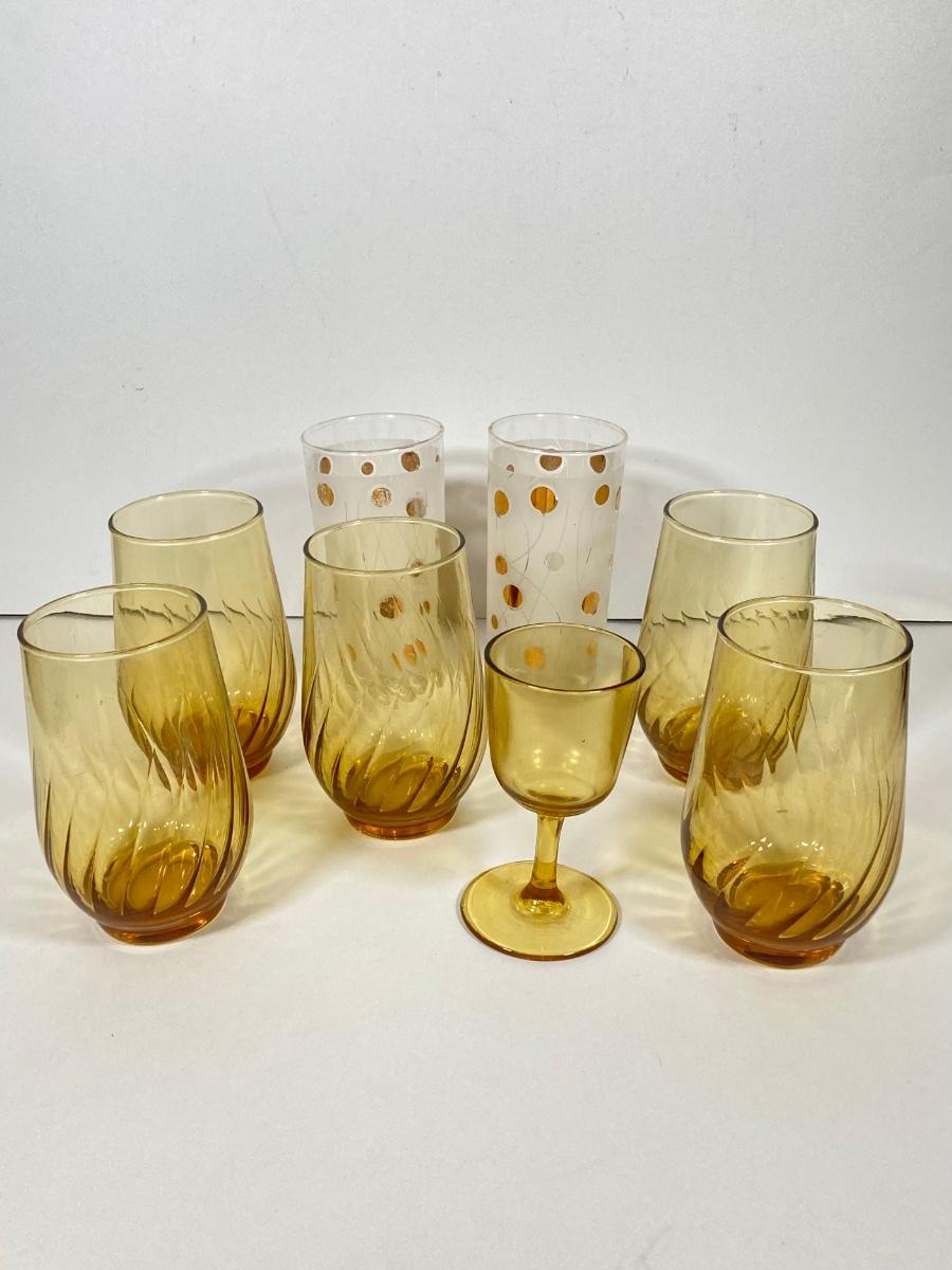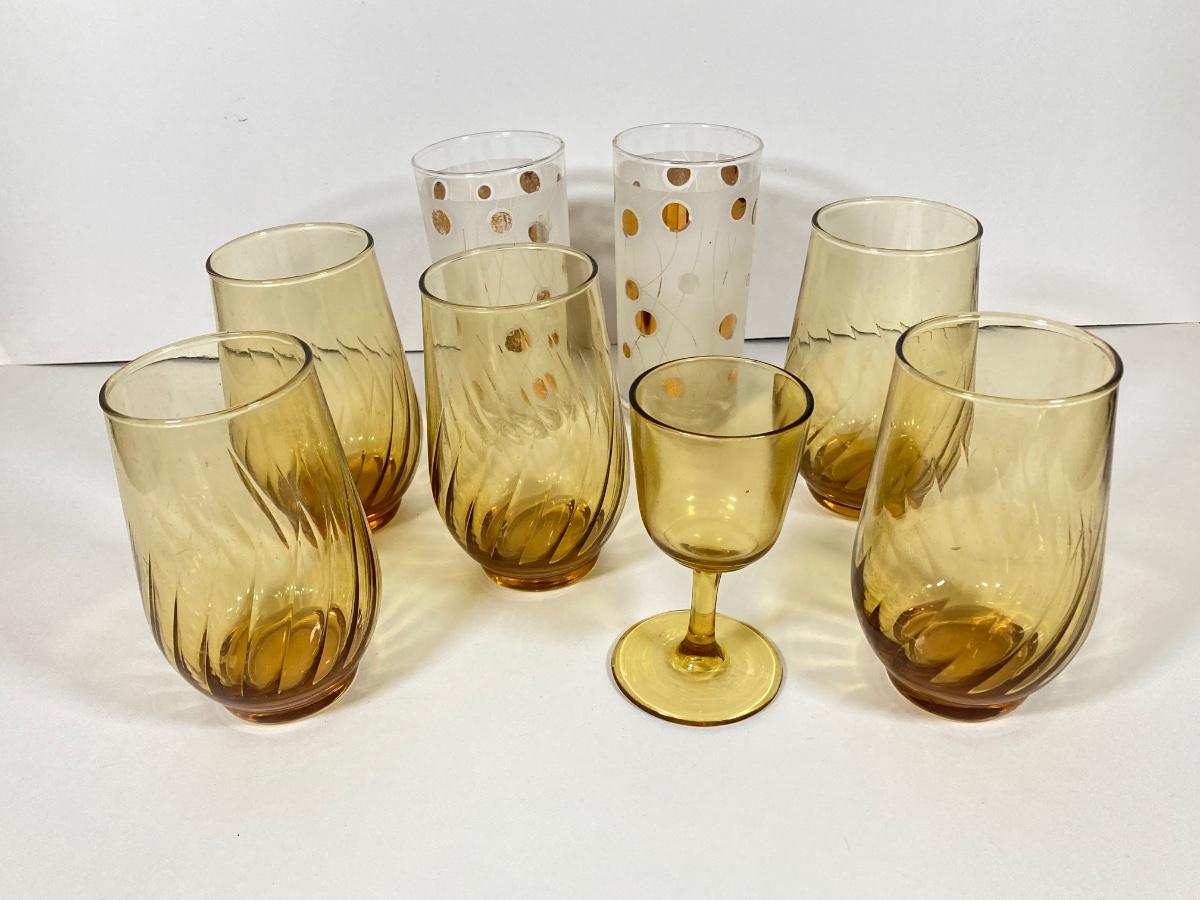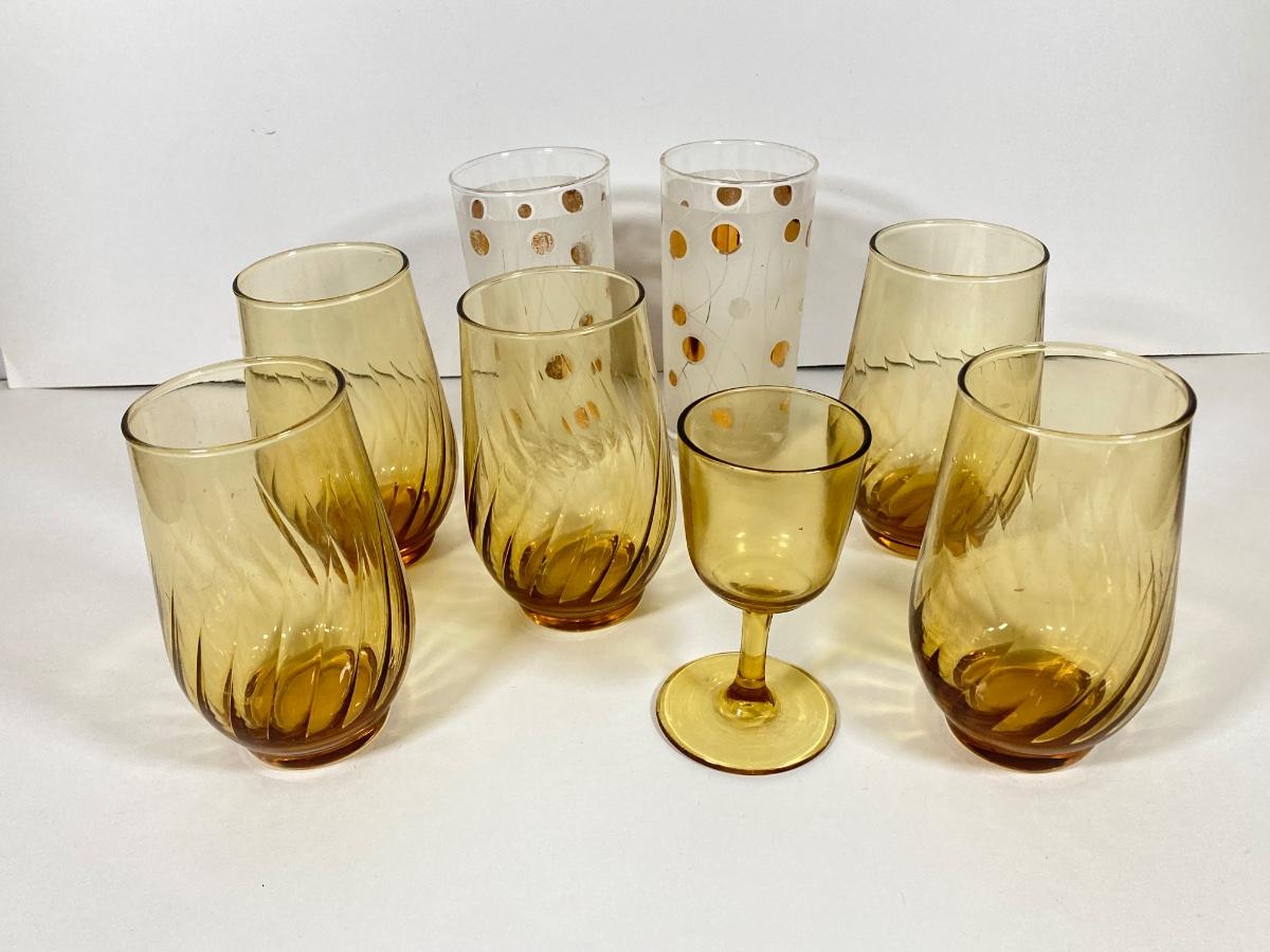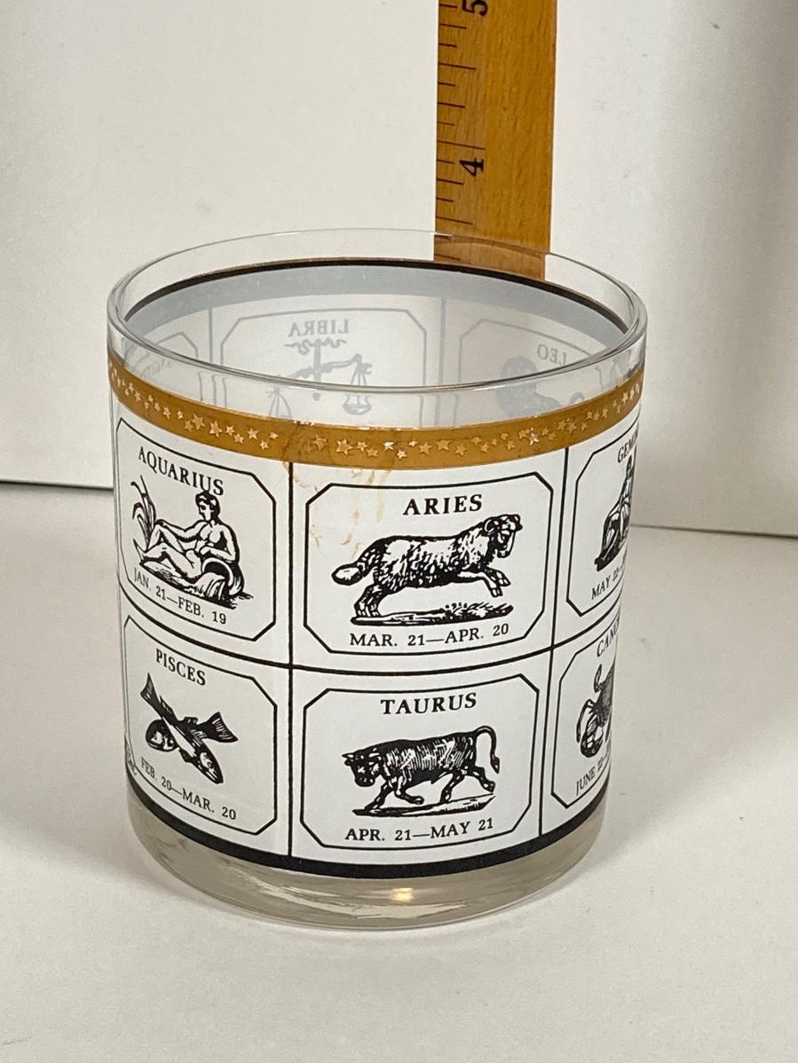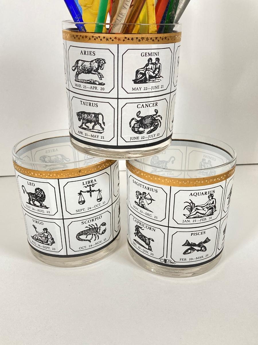 LOT 70: Collection of Vintage Glassware and More - Zodiac, Gold Tone, Amber with Glass / Plastic Stirrers and Carved Bottle Stopper