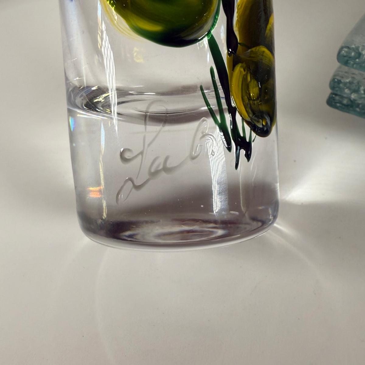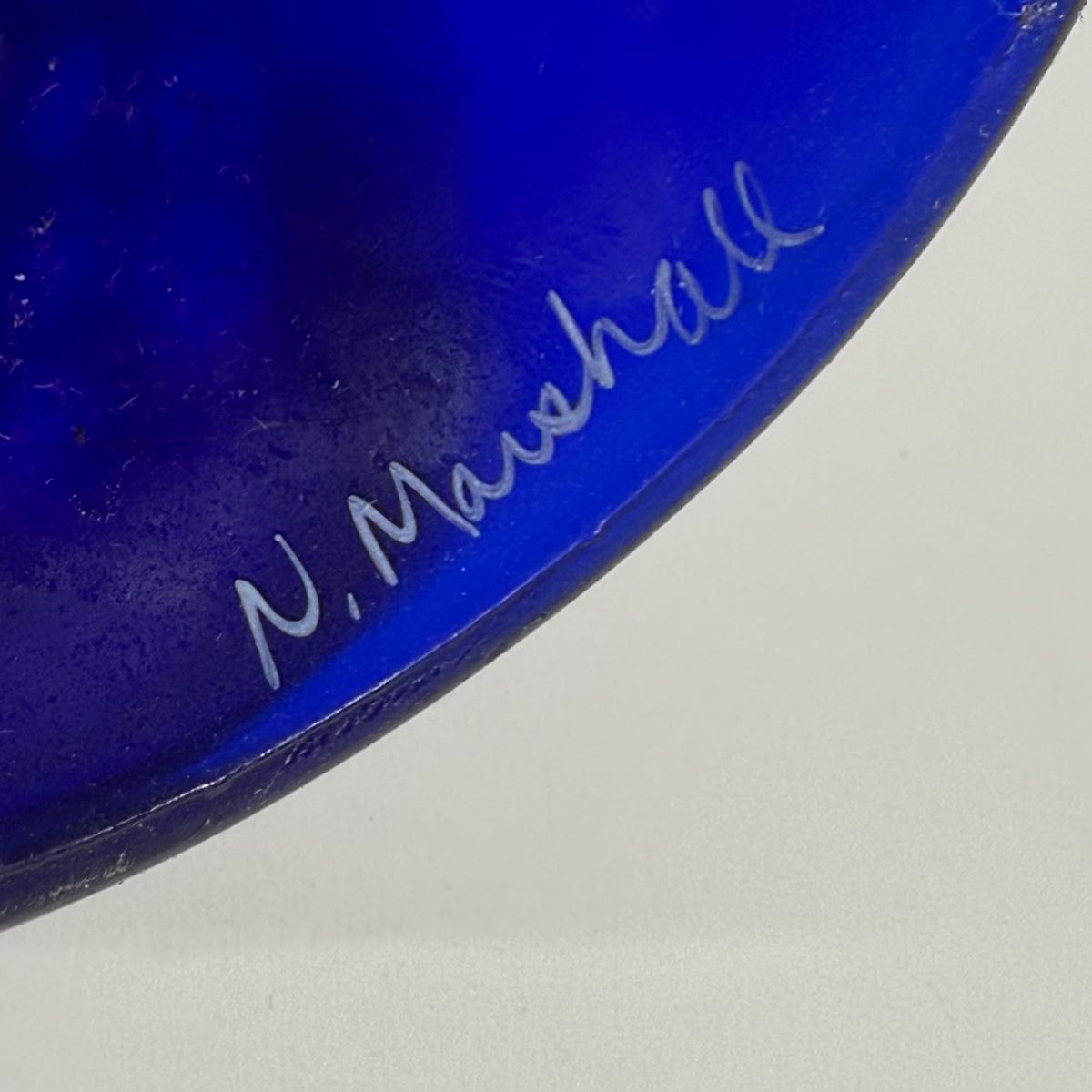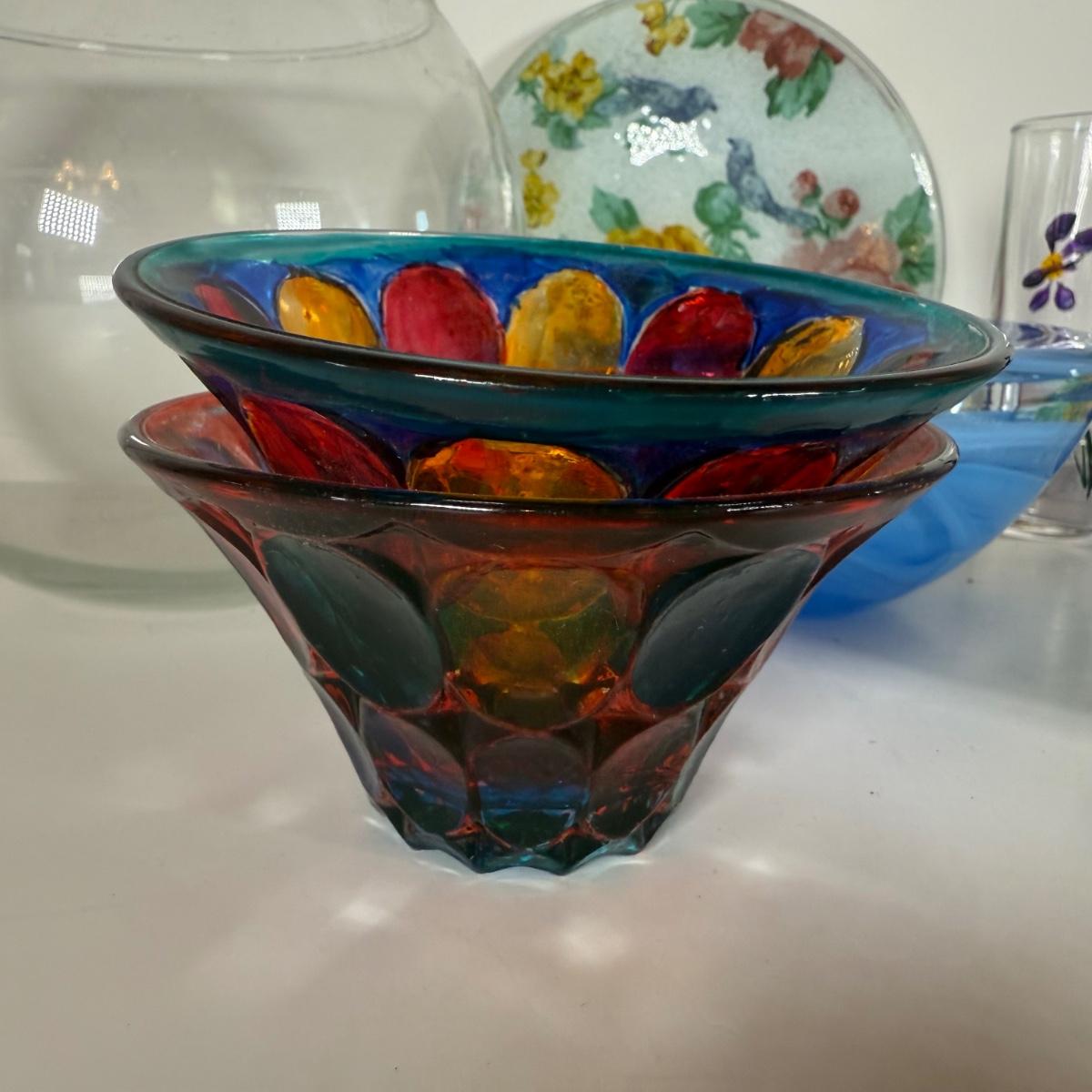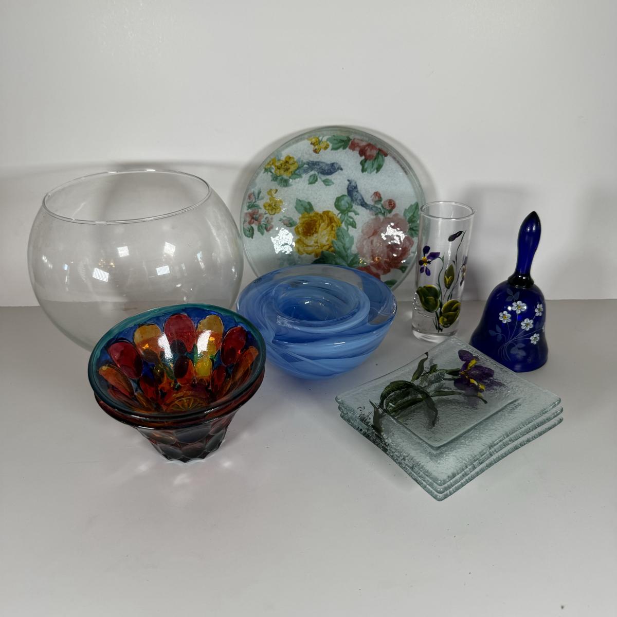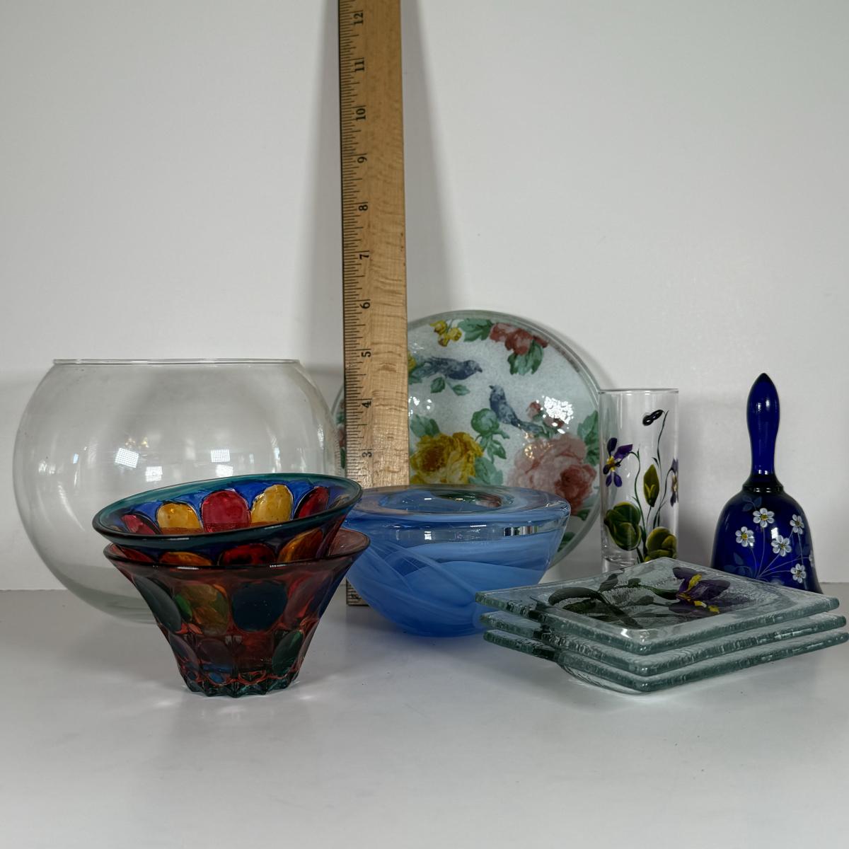 LOT 5D: Colorful Glass & More - Kosta Boda Blue Swirl Votive, Hand Painted Signed Shot Glass & Trinket Trays, Signed N Marshall Fenton Bell, Gorham Bird Plates & More