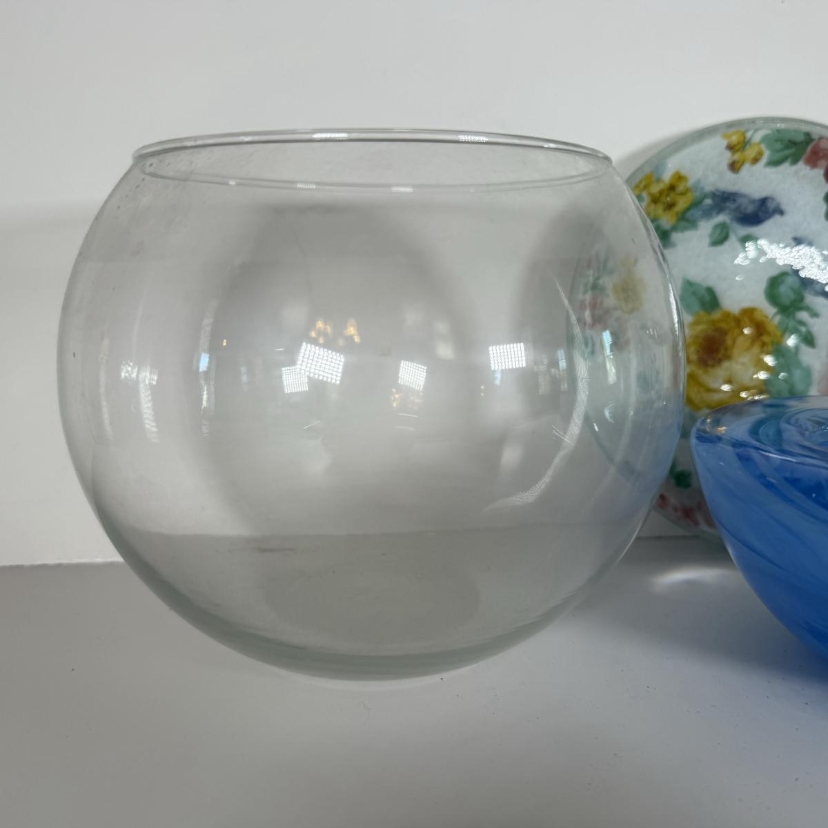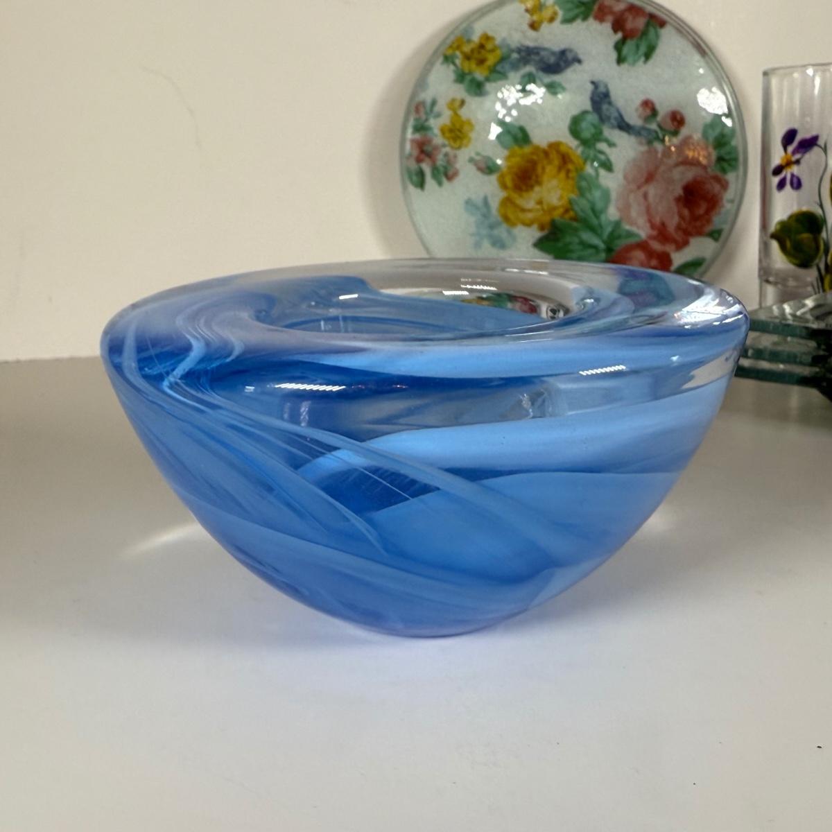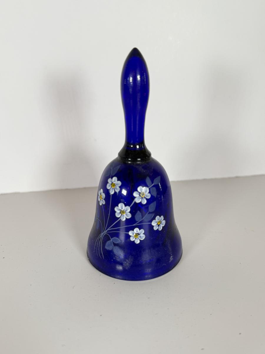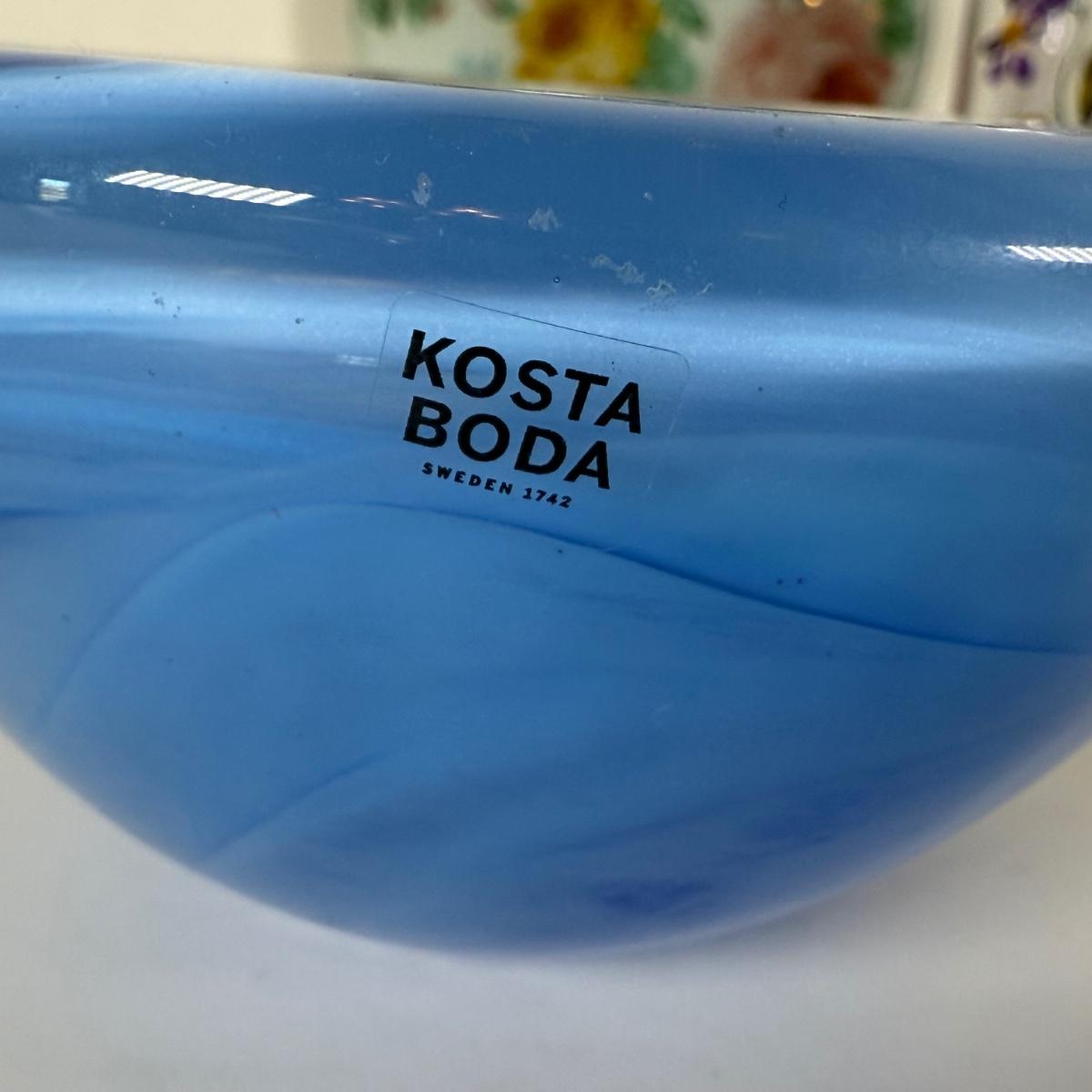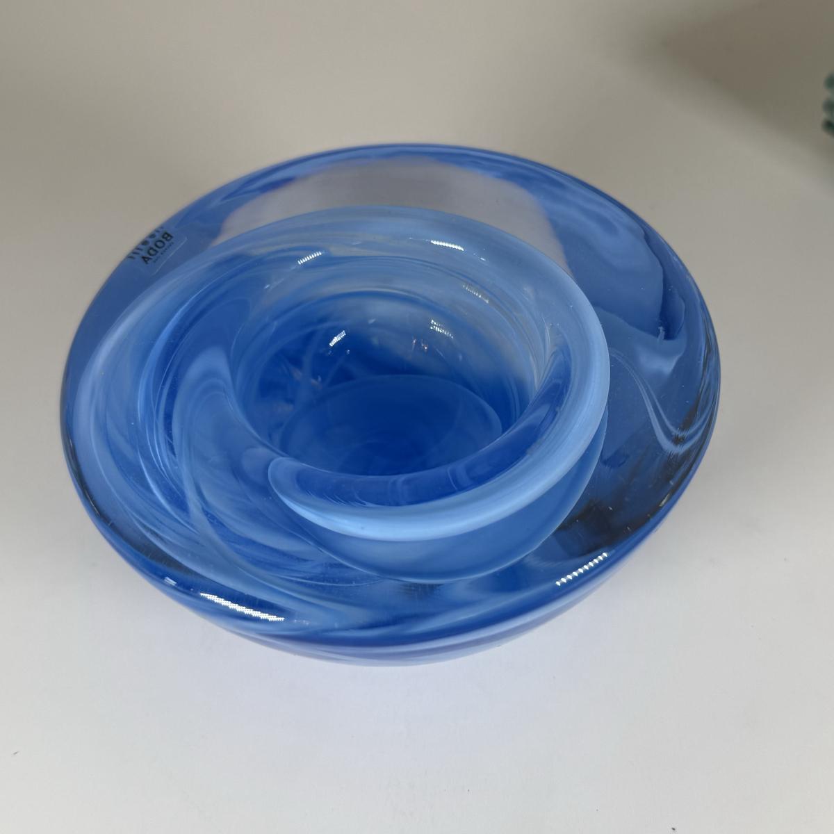 LOT 5D: Colorful Glass & More - Kosta Boda Blue Swirl Votive, Hand Painted Signed Shot Glass & Trinket Trays, Signed N Marshall Fenton Bell, Gorham Bird Plates & More