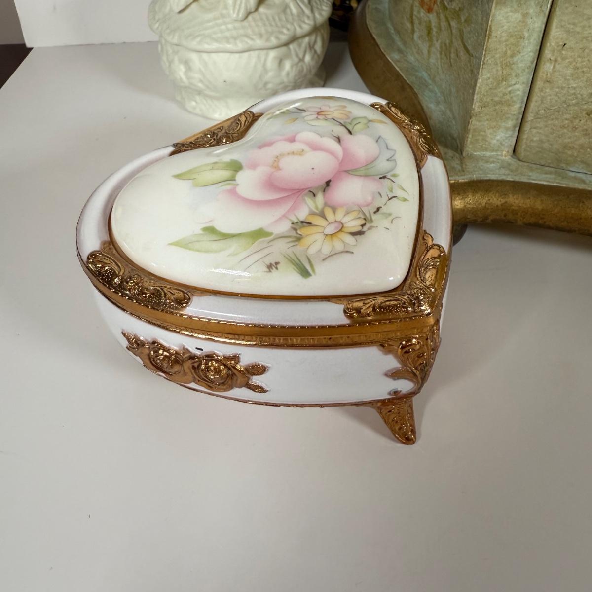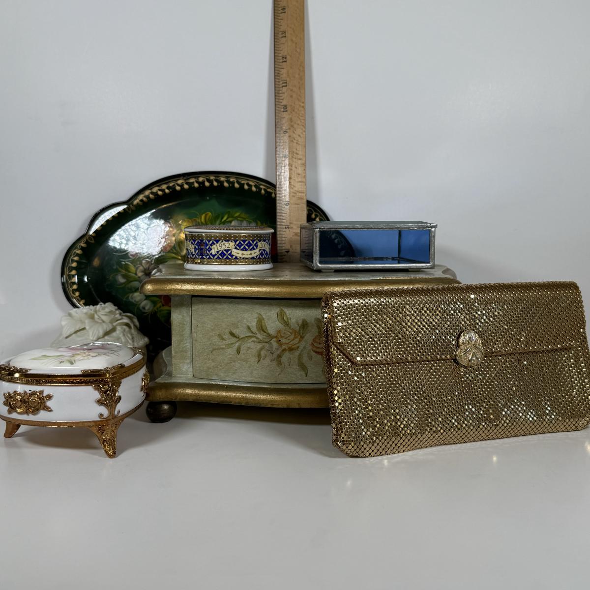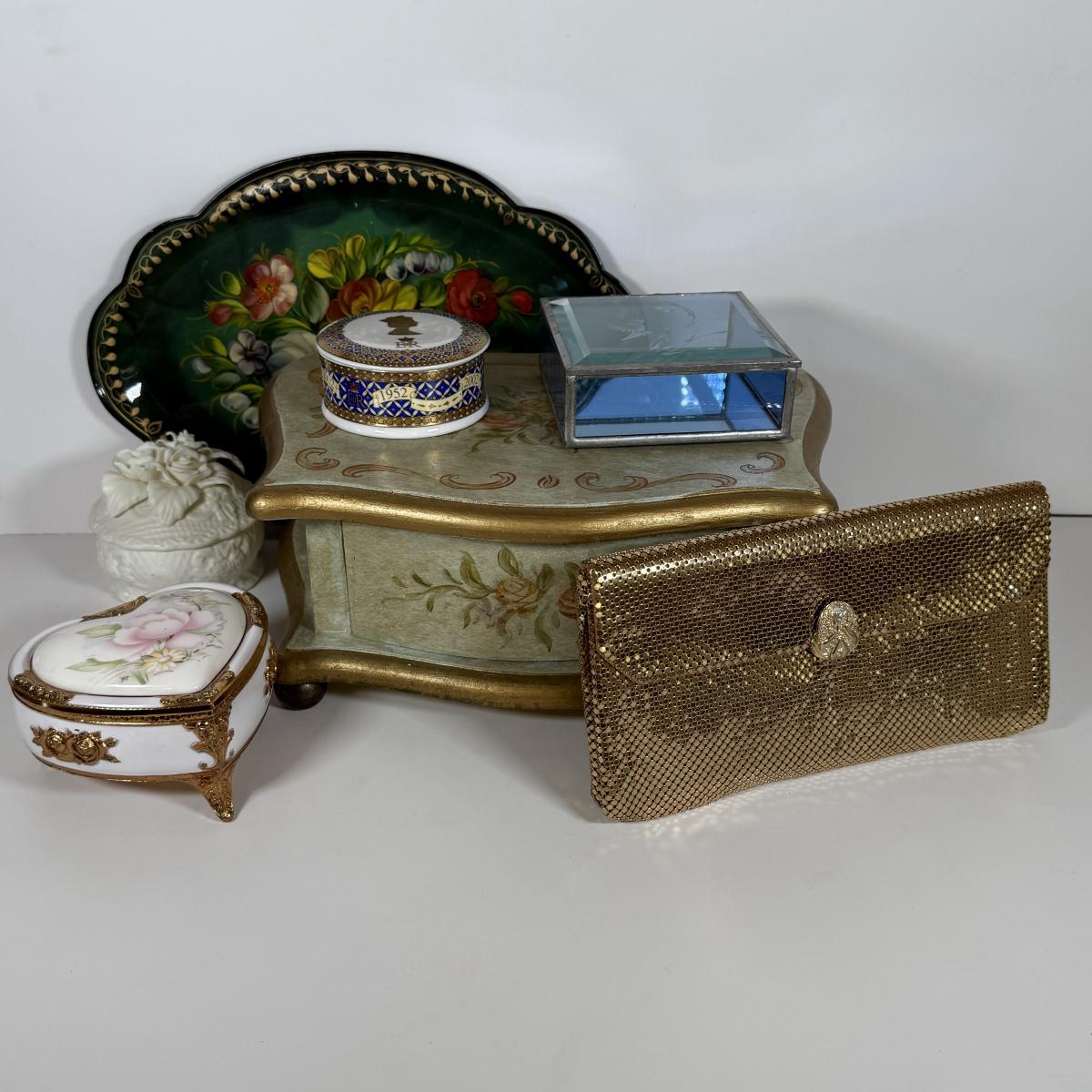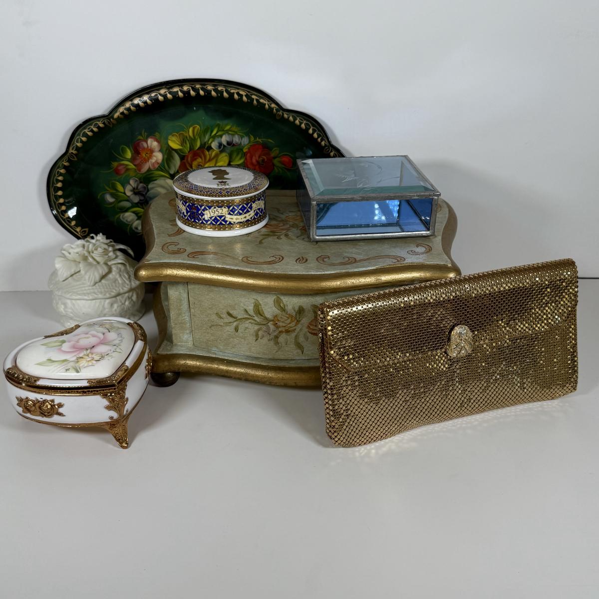 LOT 6D: Vintage Vanity Collection - Gold Color Evening Clutch & Trinket Boxes - James Sadler Queen Elizabeth II, Westland Heart & White China w/ Sculpted Roses