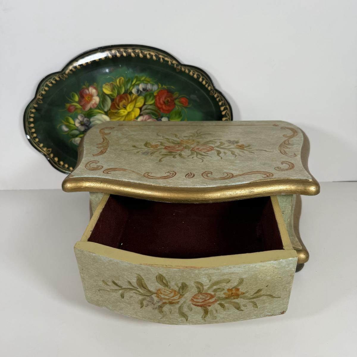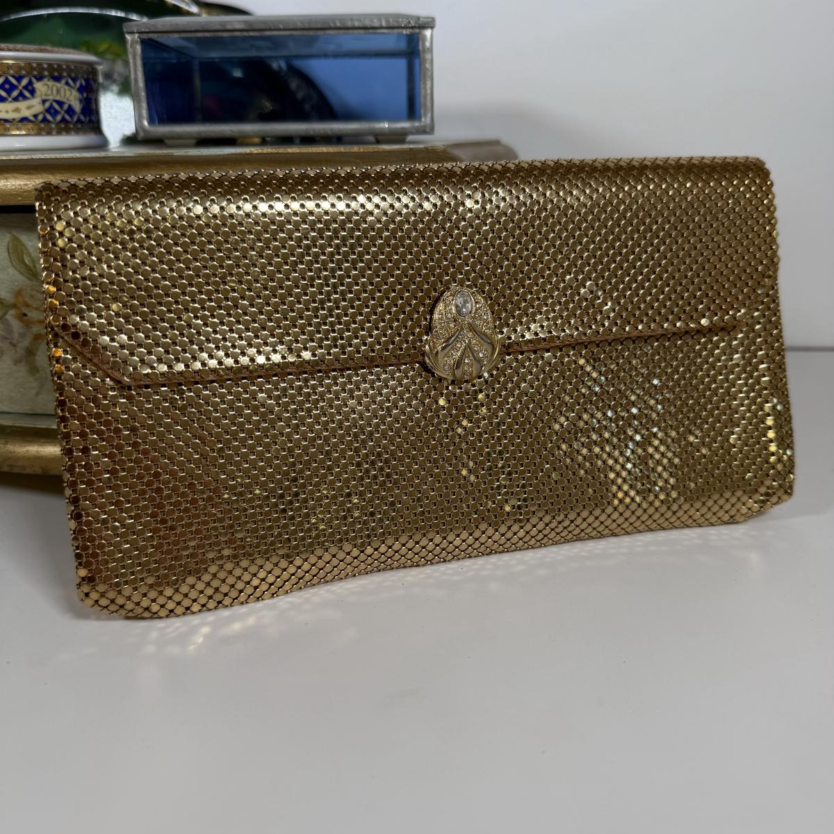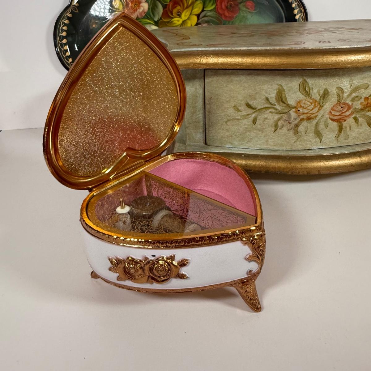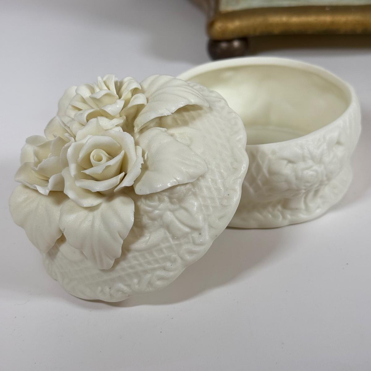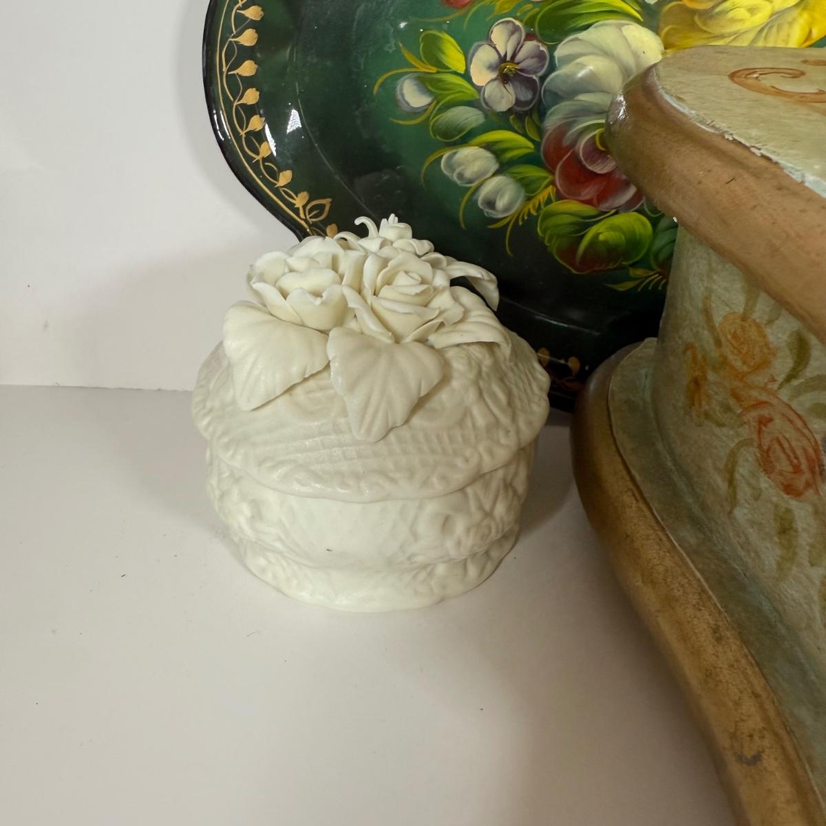 LOT 6D: Vintage Vanity Collection - Gold Color Evening Clutch & Trinket Boxes - James Sadler Queen Elizabeth II, Westland Heart & White China w/ Sculpted Roses