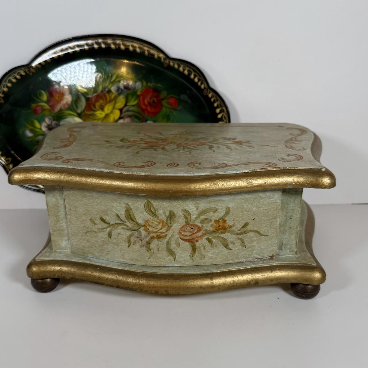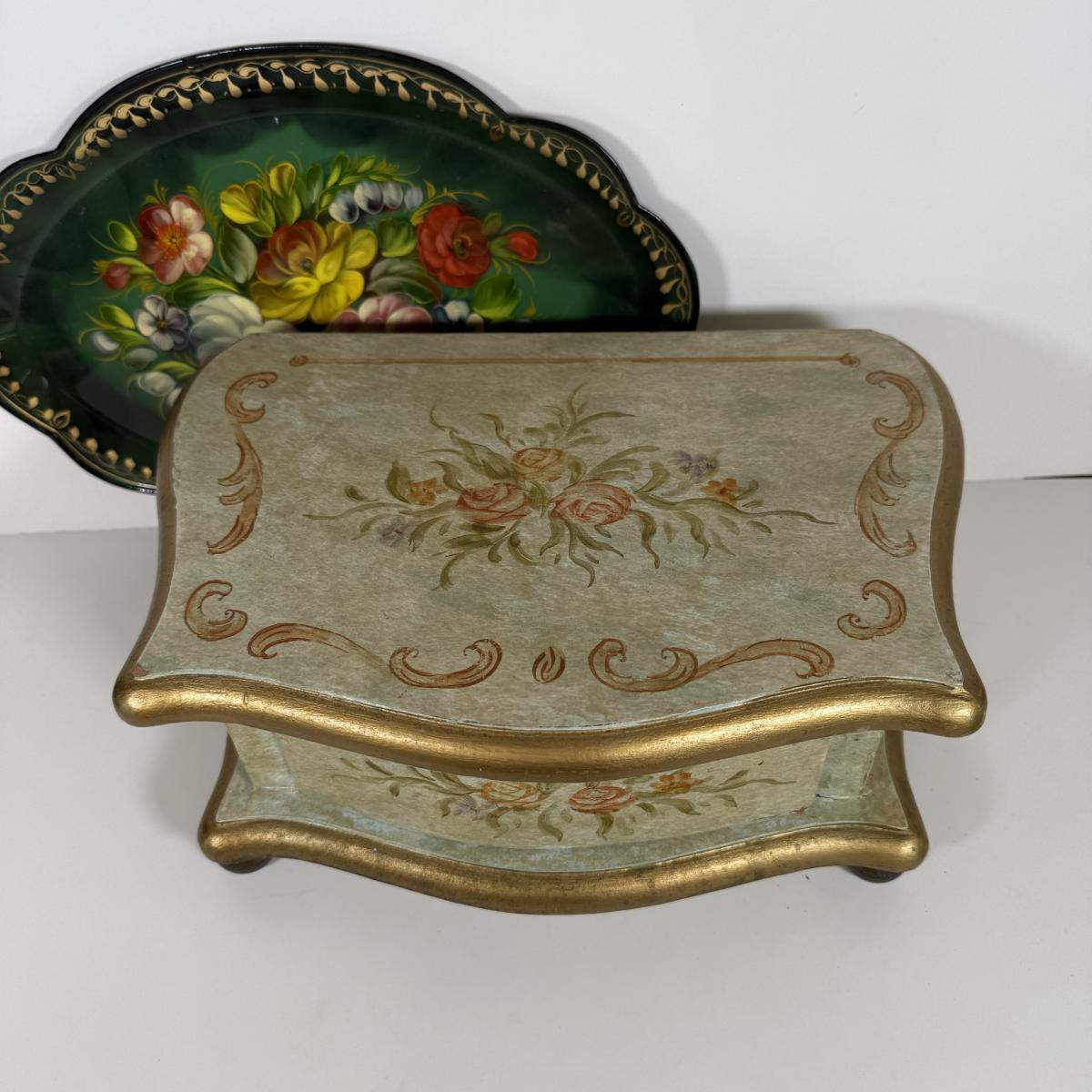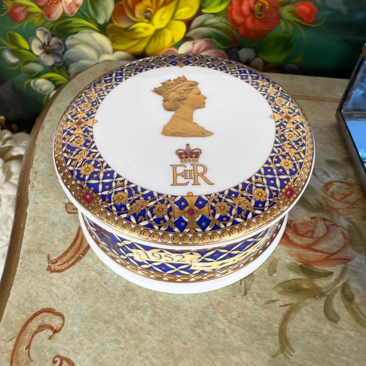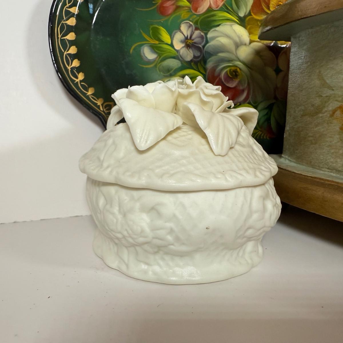 LOT 6D: Vintage Vanity Collection - Gold Color Evening Clutch & Trinket Boxes - James Sadler Queen Elizabeth II, Westland Heart & White China w/ Sculpted Roses