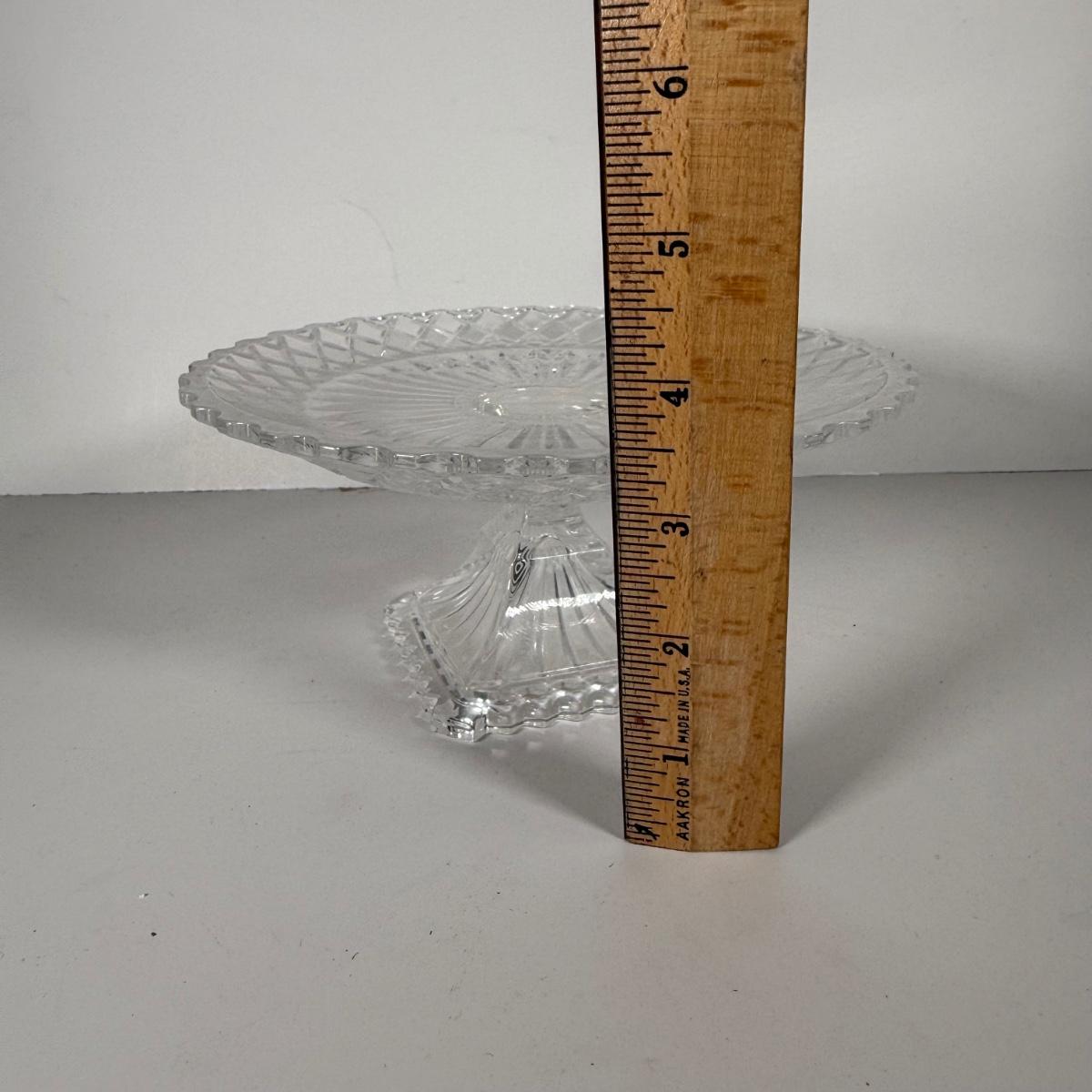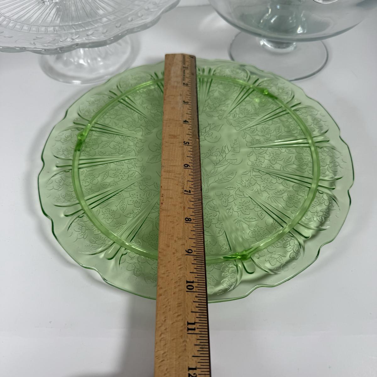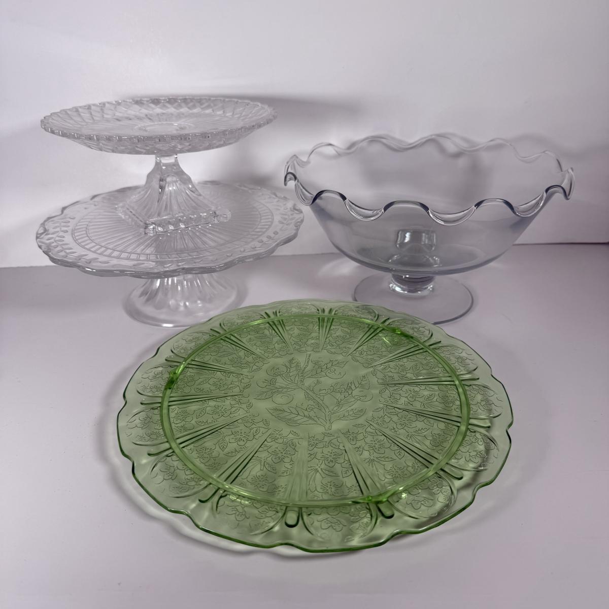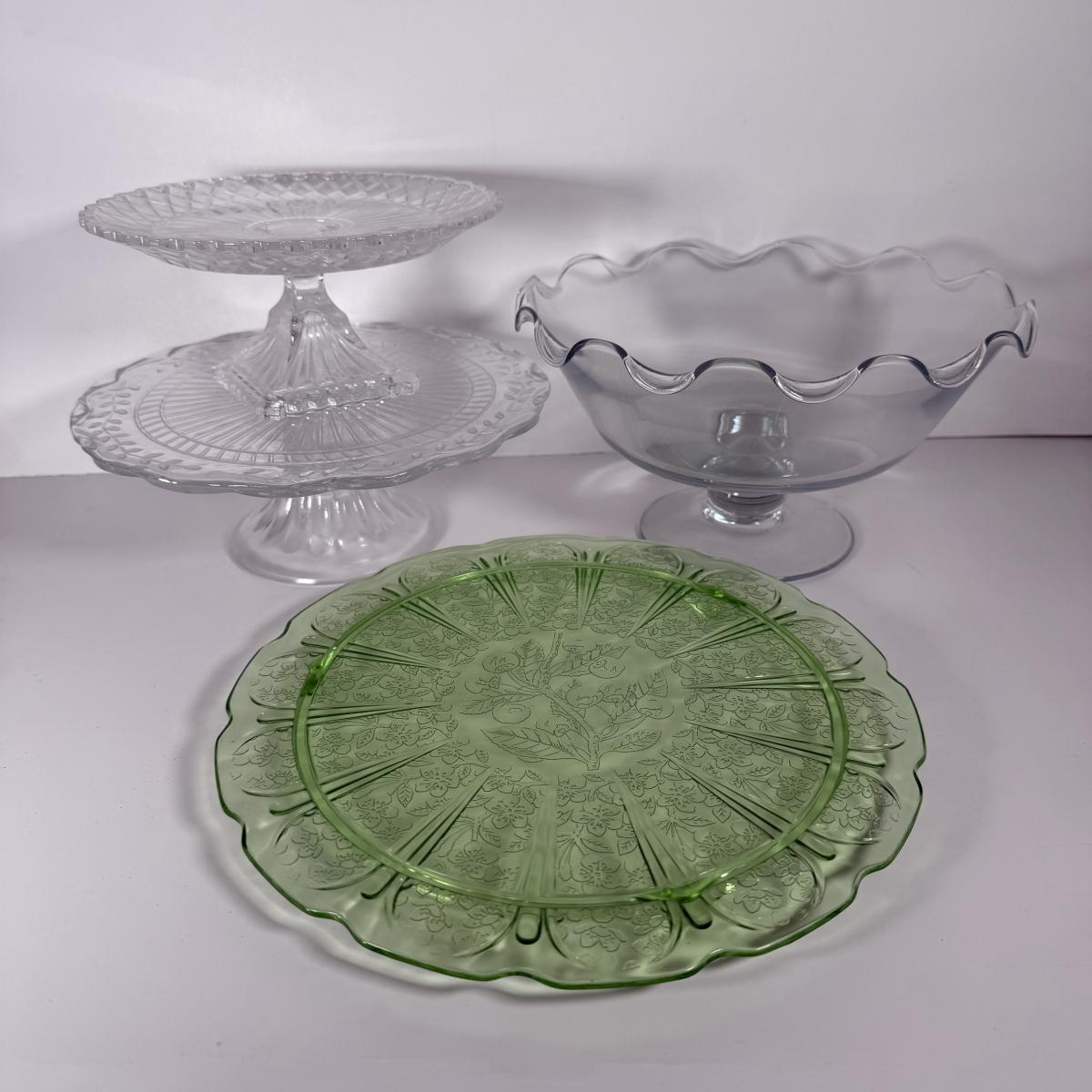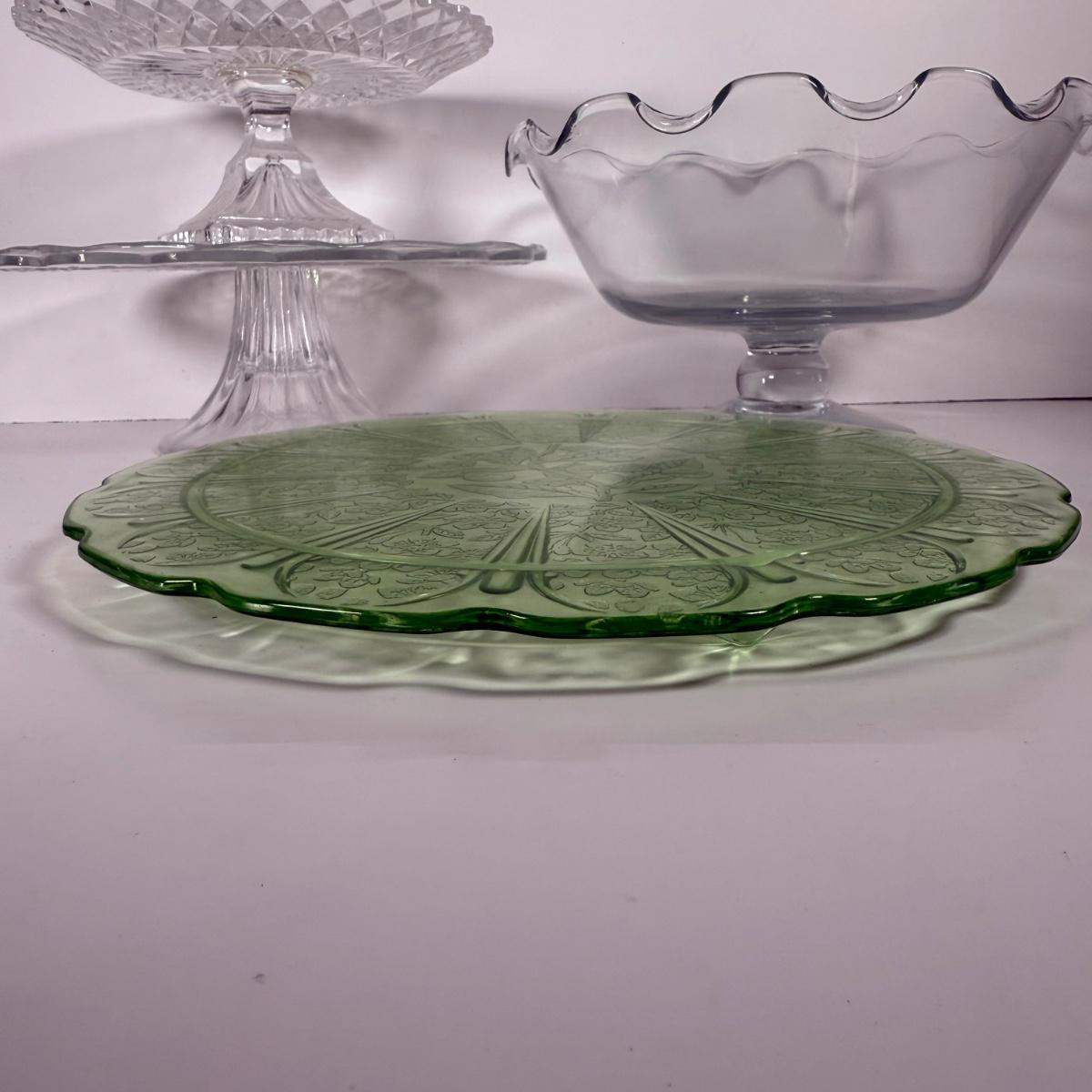 LOT 11D: Vintage Uranium Glass Footed Cake Plate, 2 Crystal Pedestal Cake Stands & More
