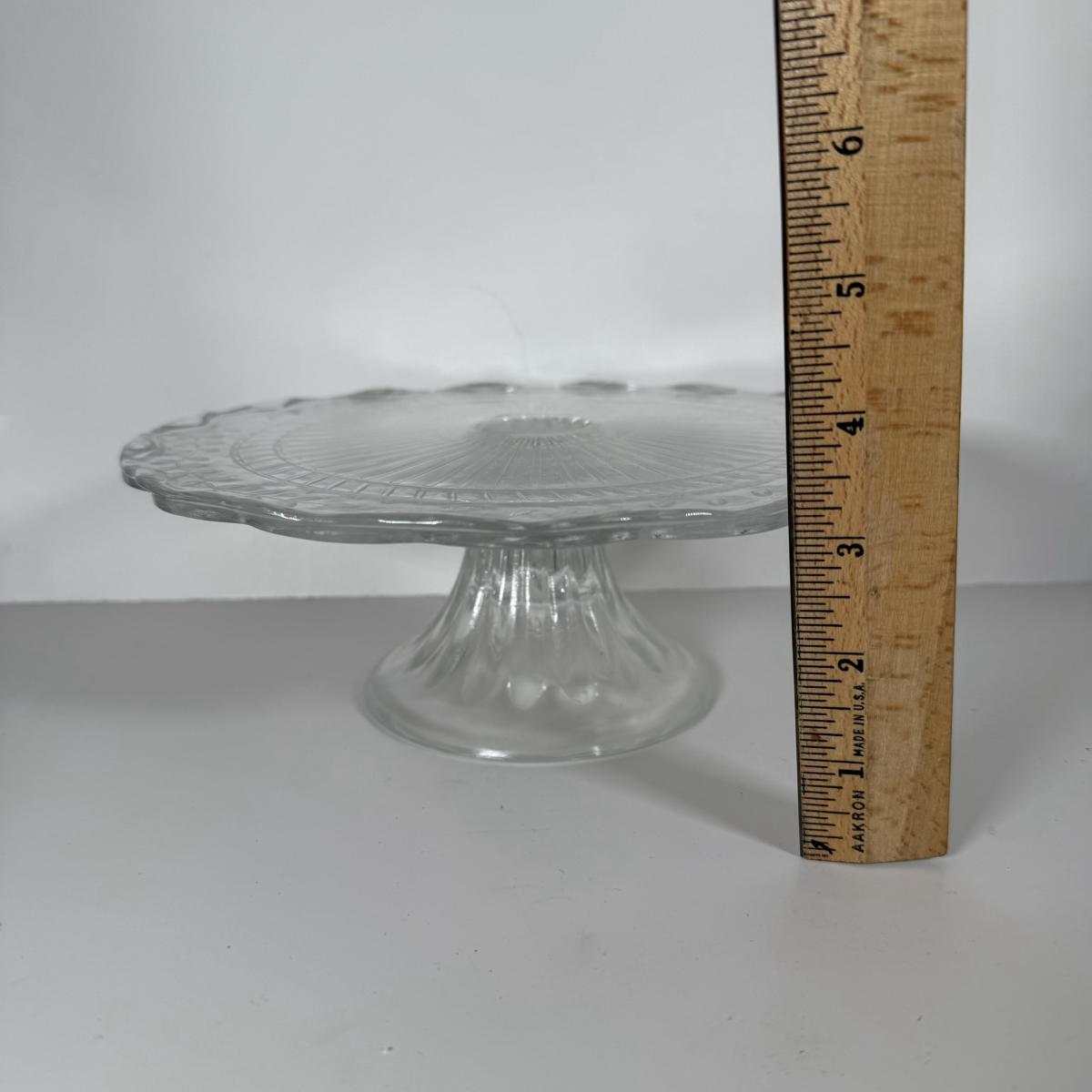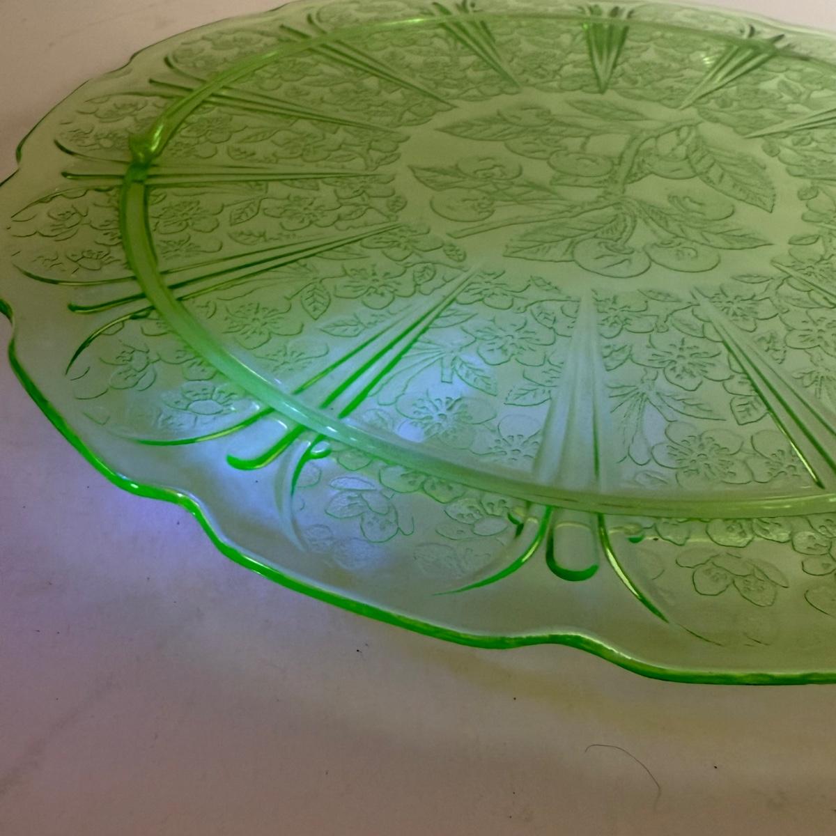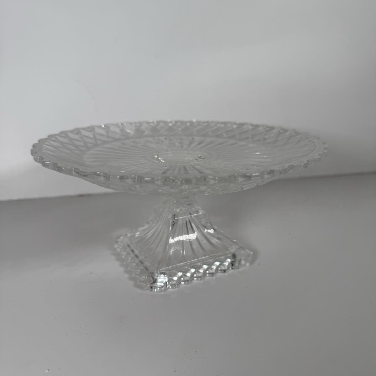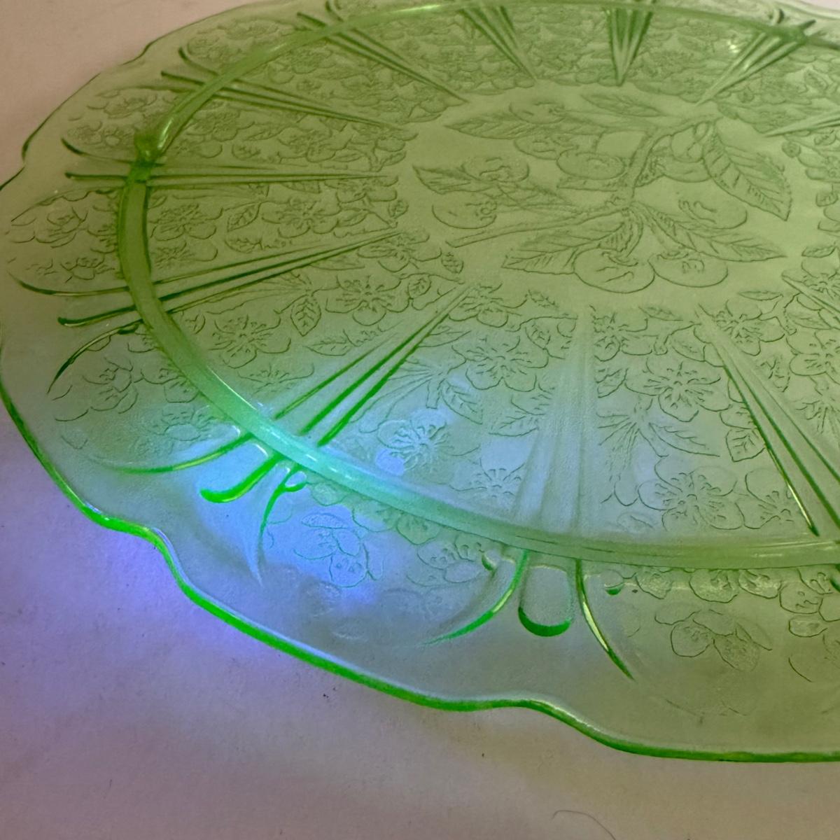 LOT 11D: Vintage Uranium Glass Footed Cake Plate, 2 Crystal Pedestal Cake Stands & More