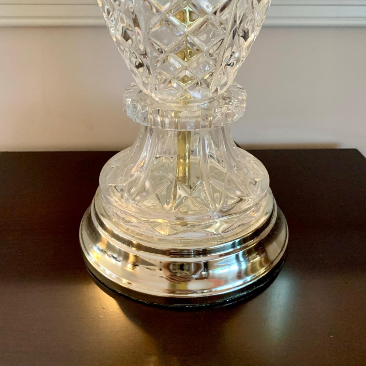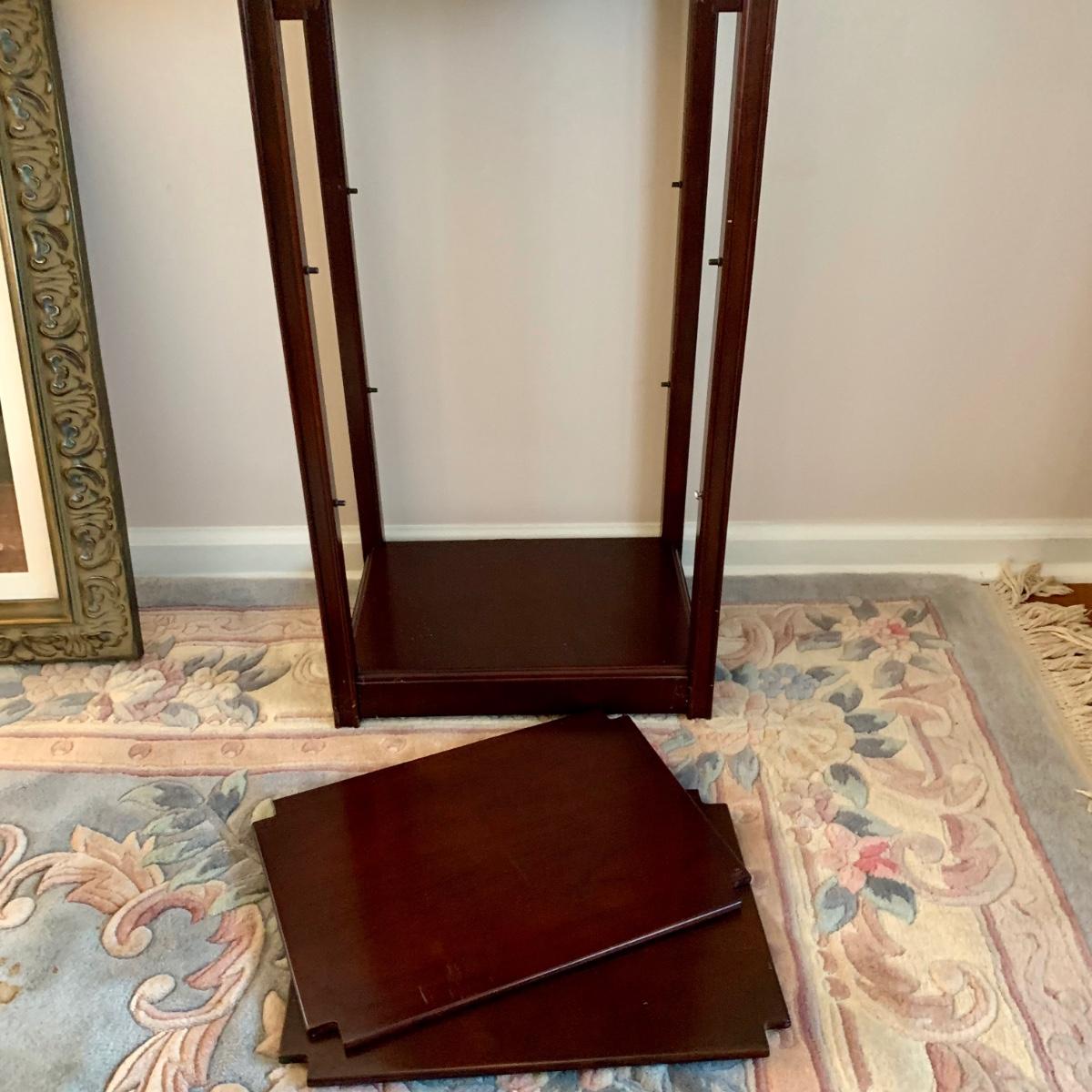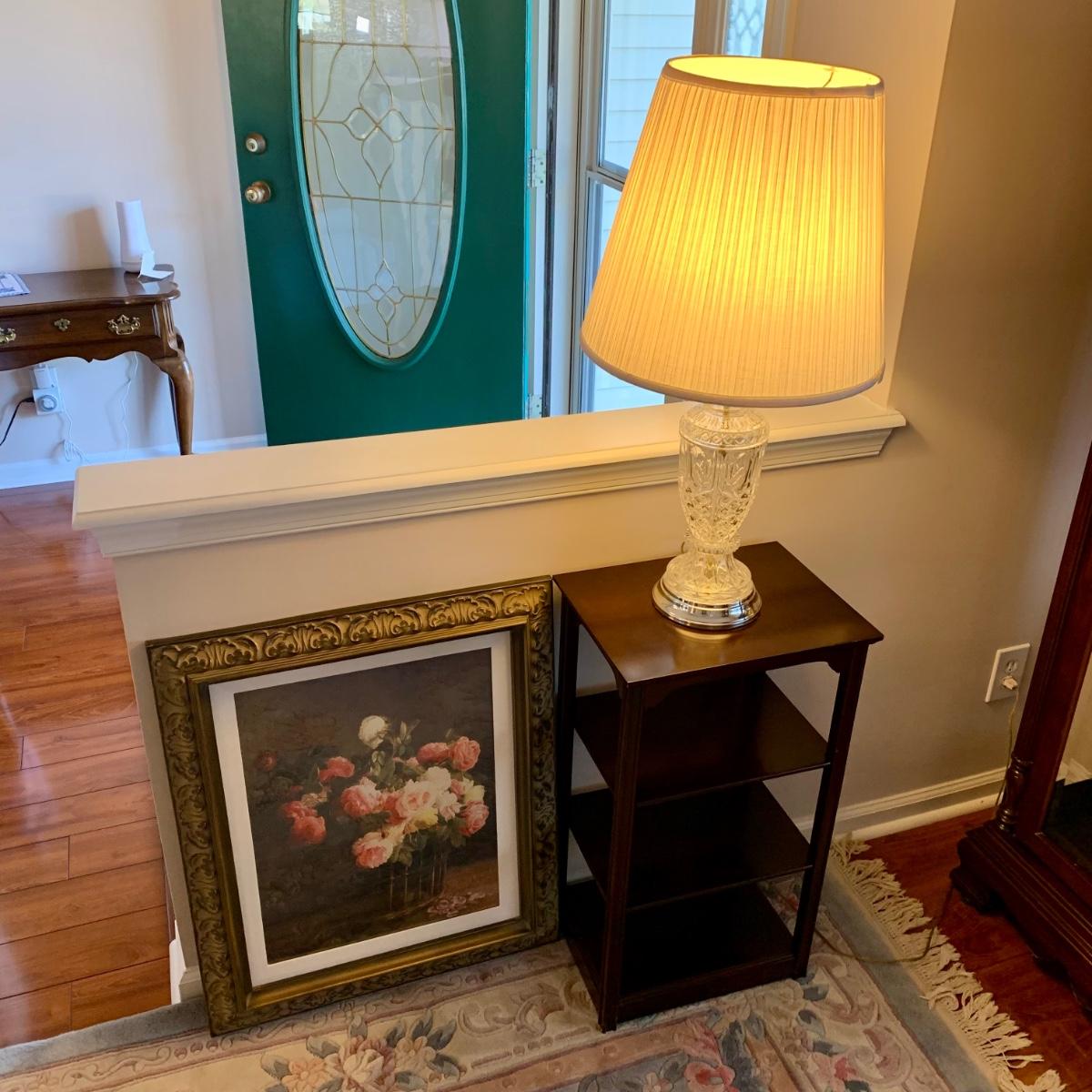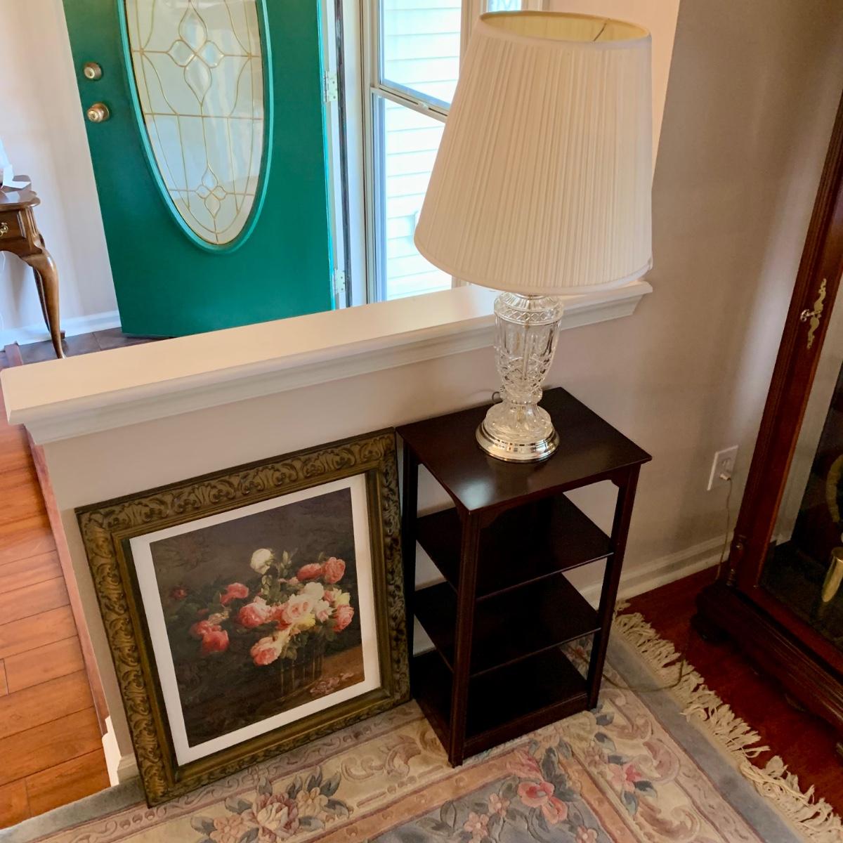 LOT 98 D: 4 Tier Shelf Side Table, Cut Crystal Lamp, & Framed Floral Print