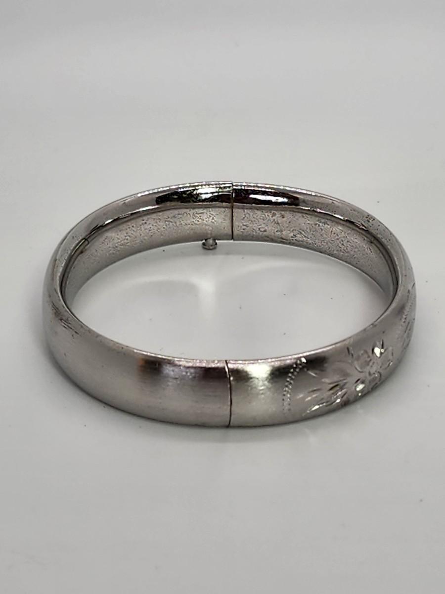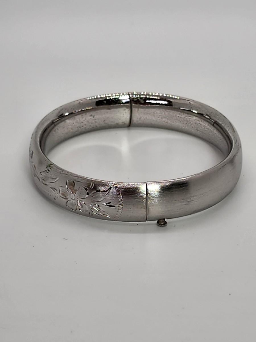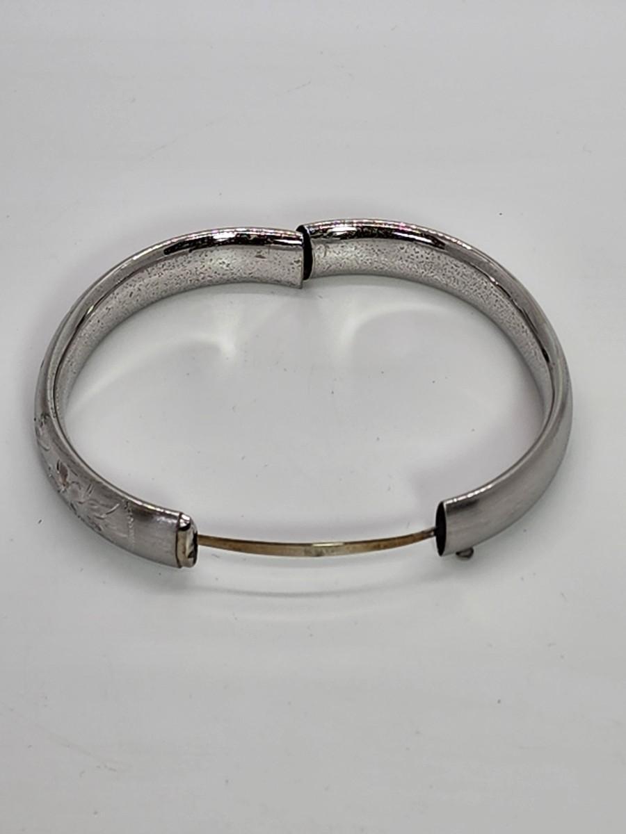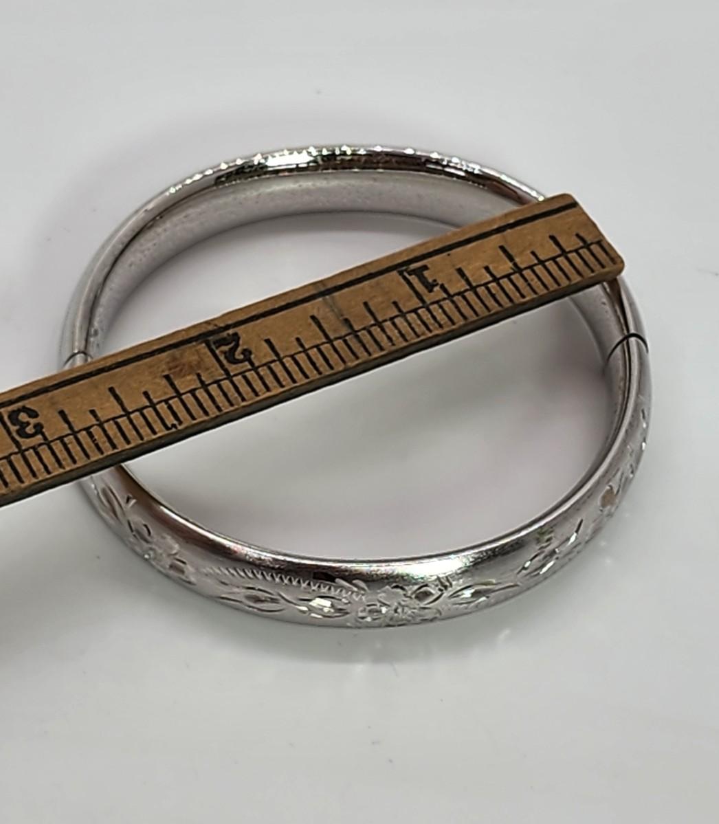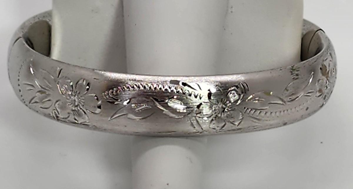 LOT 10:: 15.3g Vintage Sterling Silver Hinged Etched Bangle Bracelet signed H.F.B.