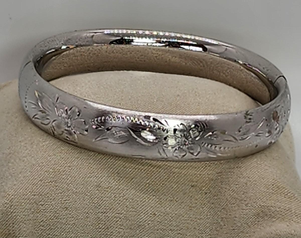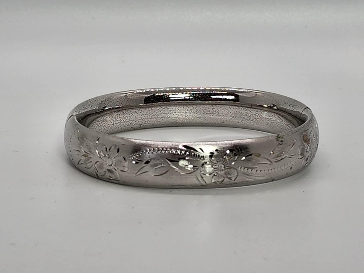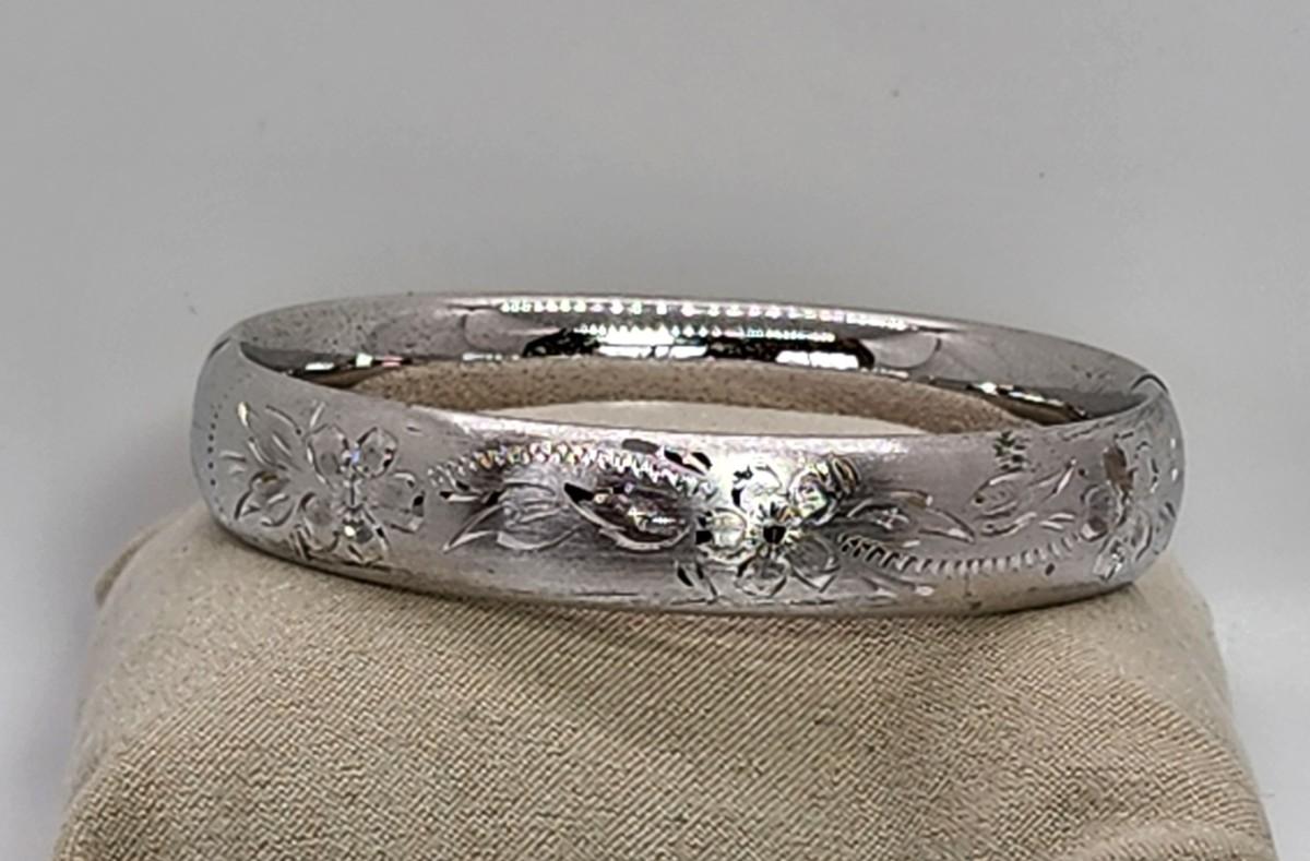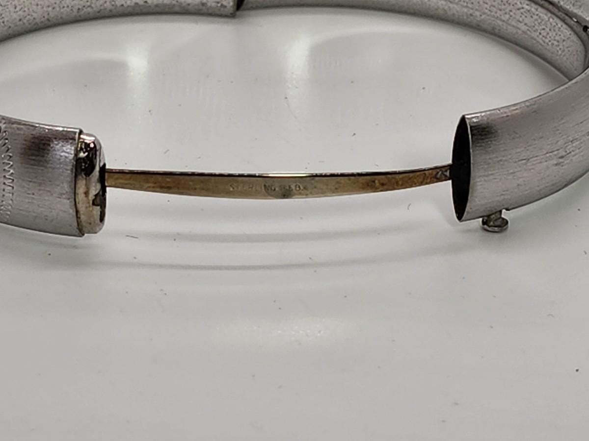 LOT 10:: 15.3g Vintage Sterling Silver Hinged Etched Bangle Bracelet signed H.F.B.