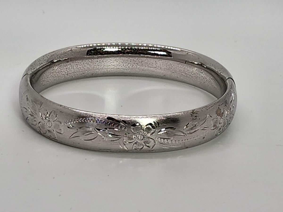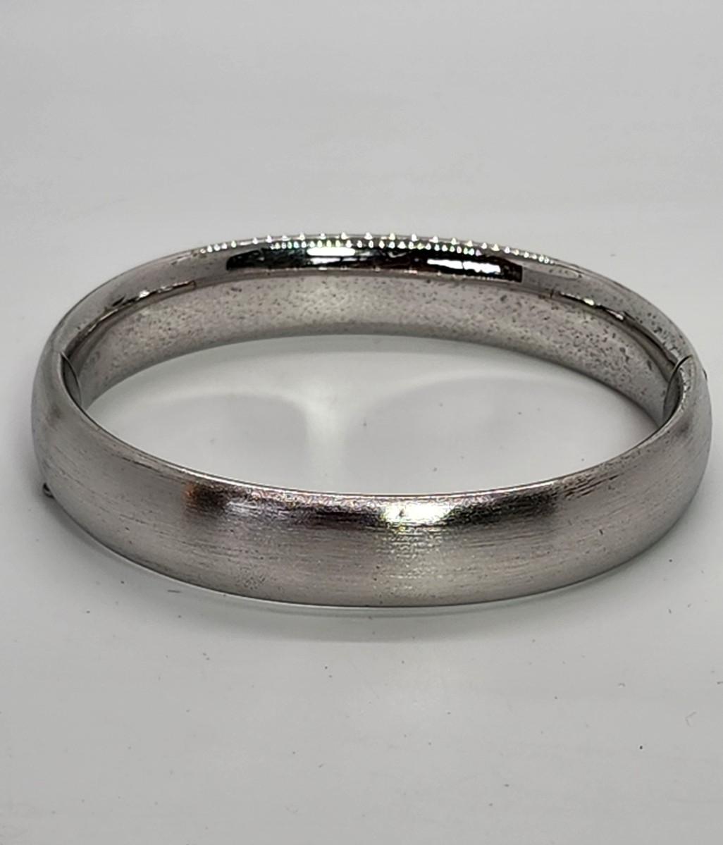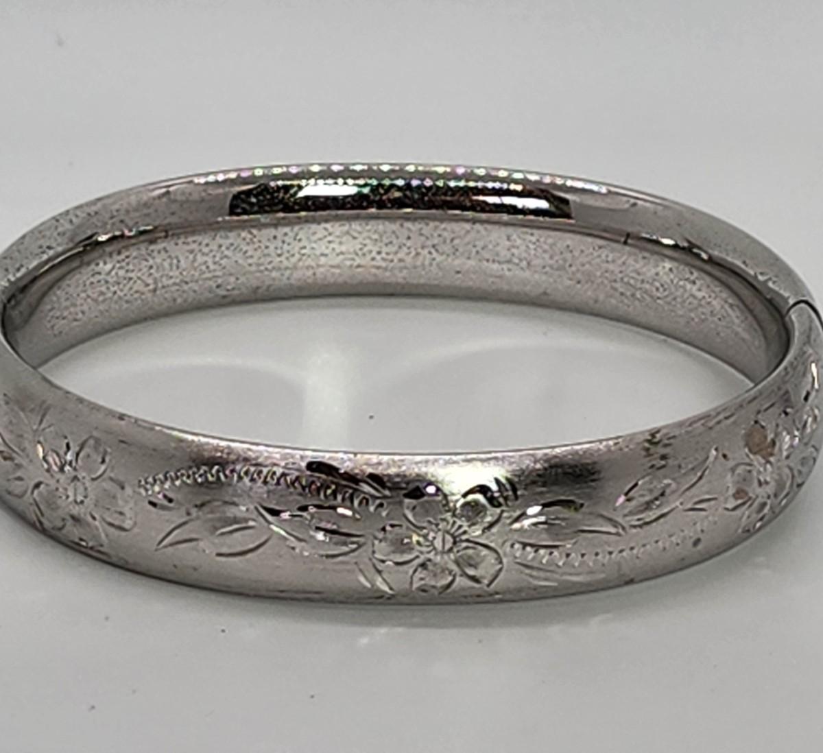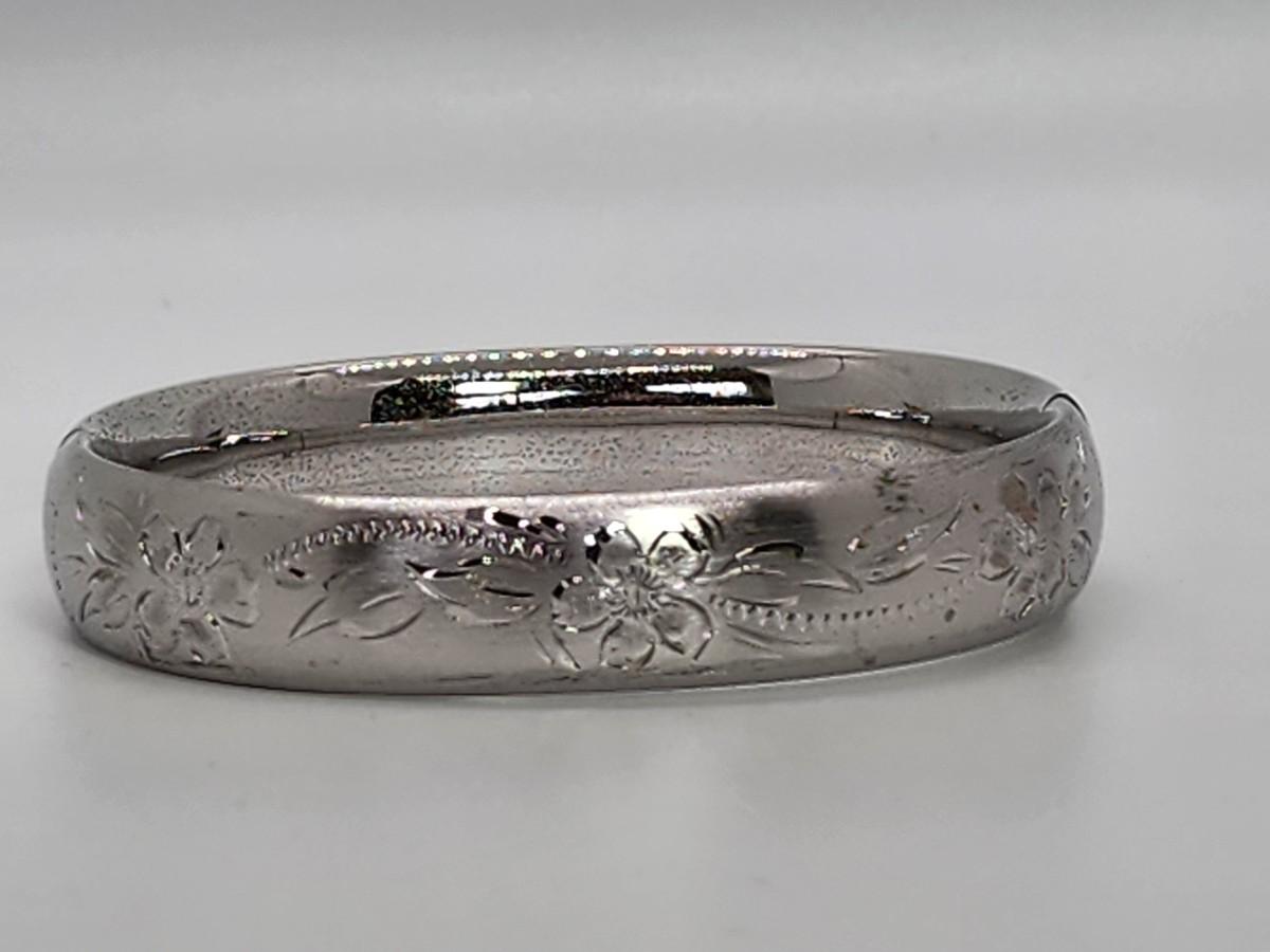 LOT 10:: 15.3g Vintage Sterling Silver Hinged Etched Bangle Bracelet signed H.F.B.