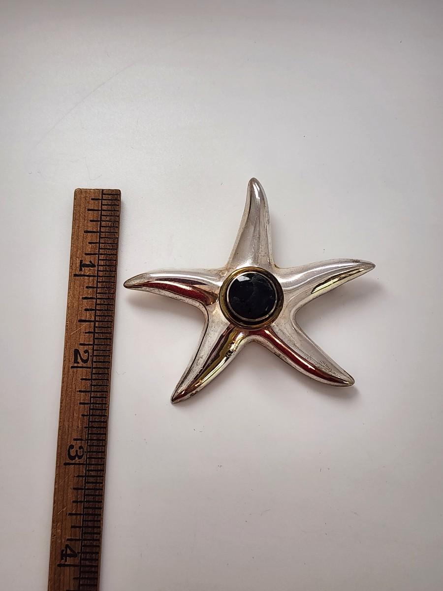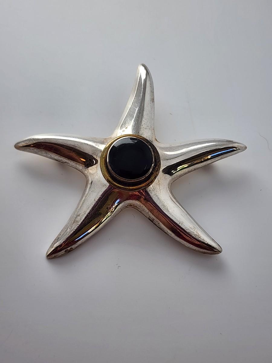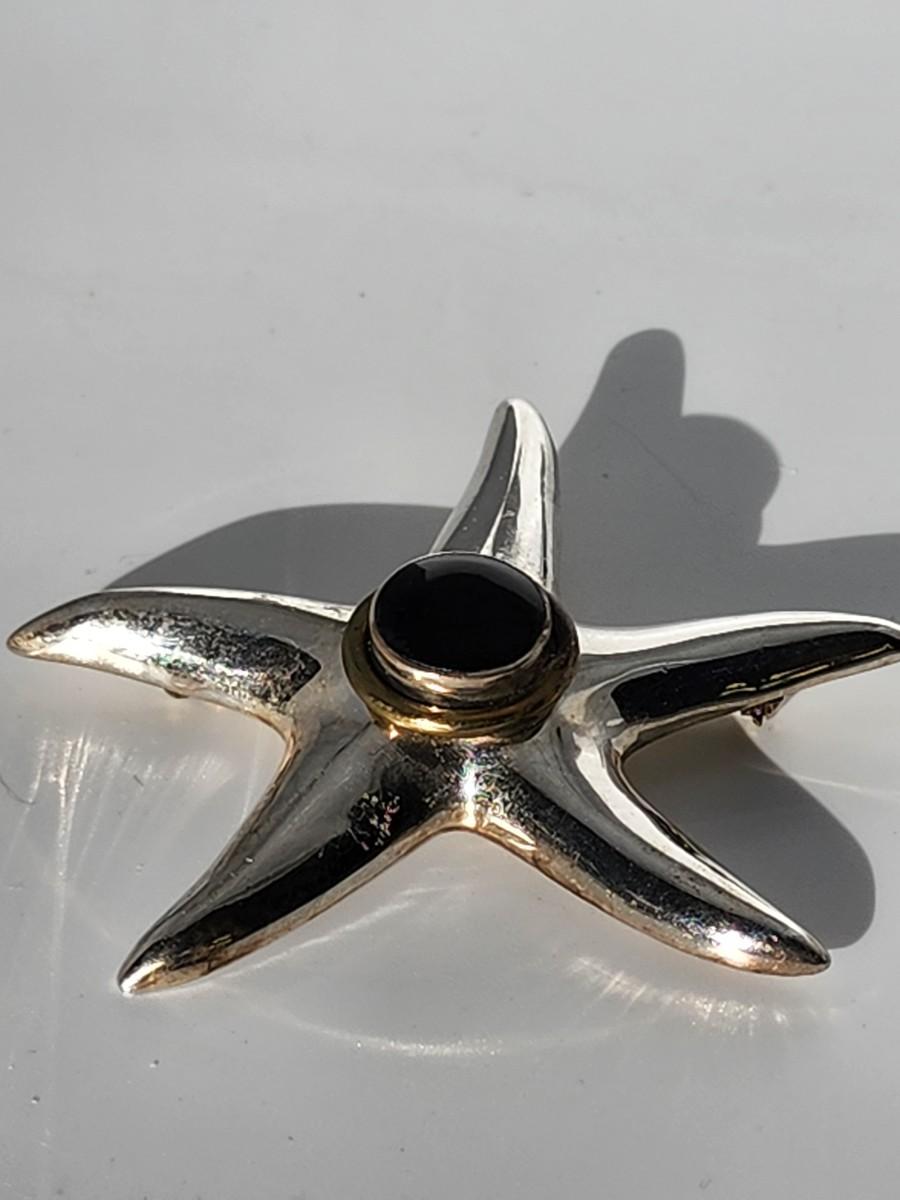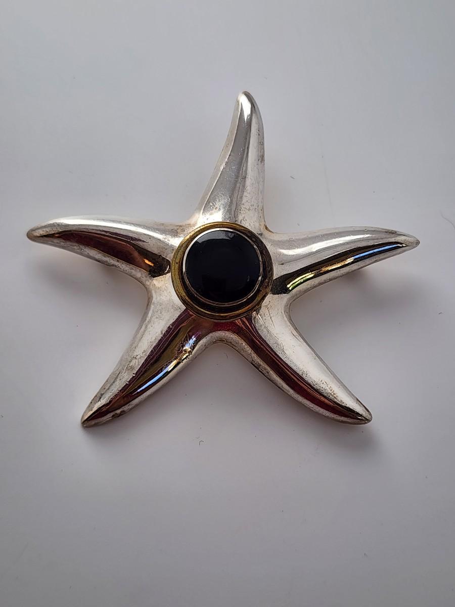 LOT 18:: Vintage Big Bold Beautiful Taxco Mexico Starfish Brooch Black Onyx center with gold vermeil highlights 18gtw