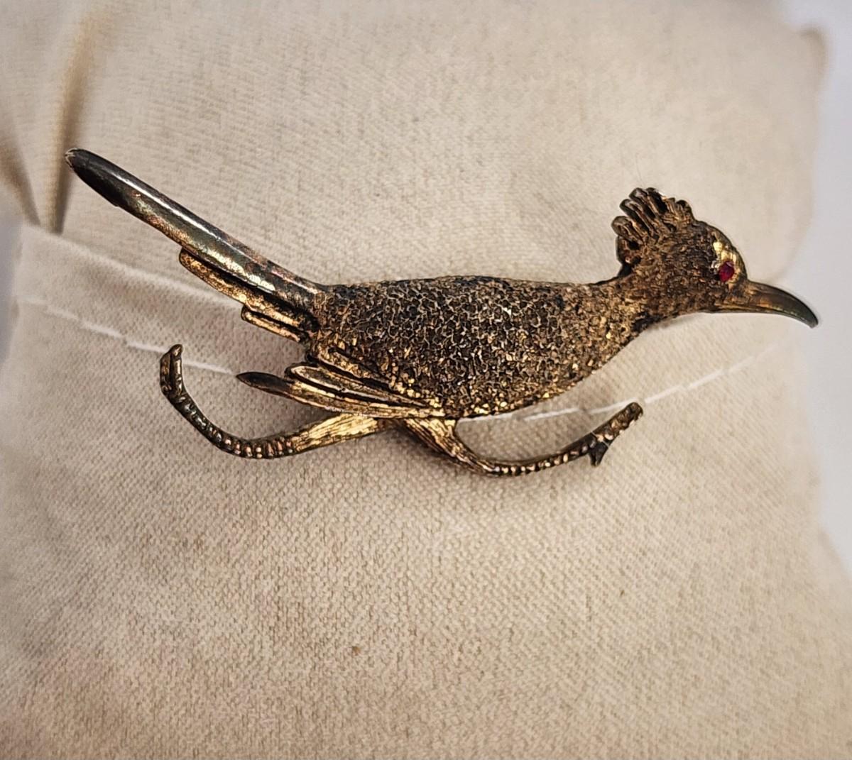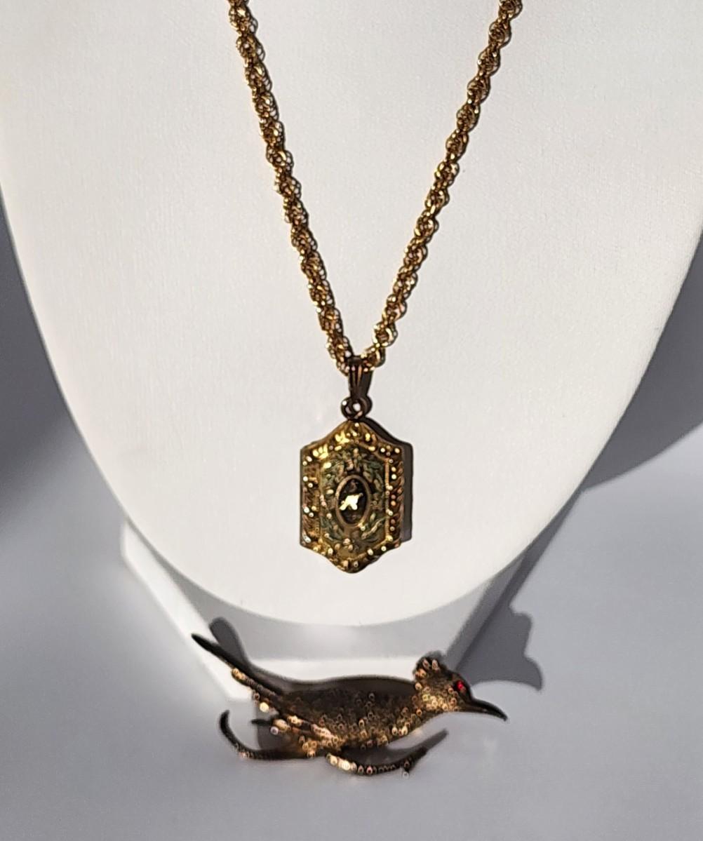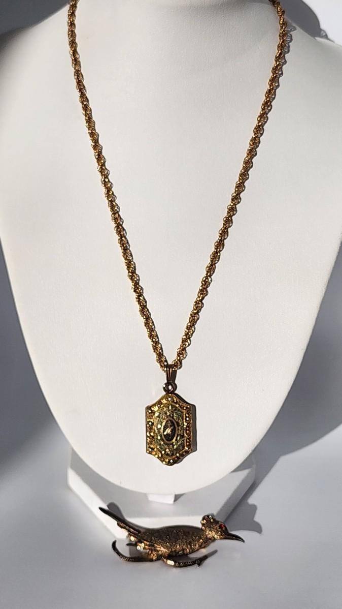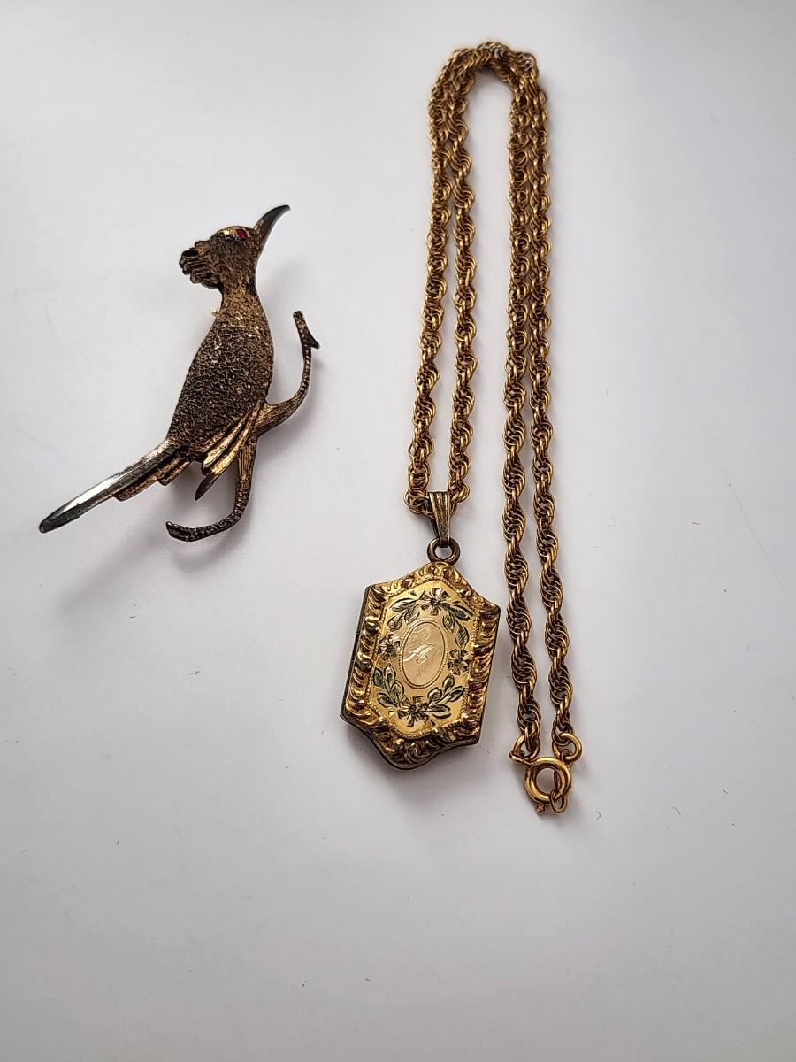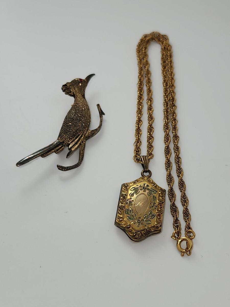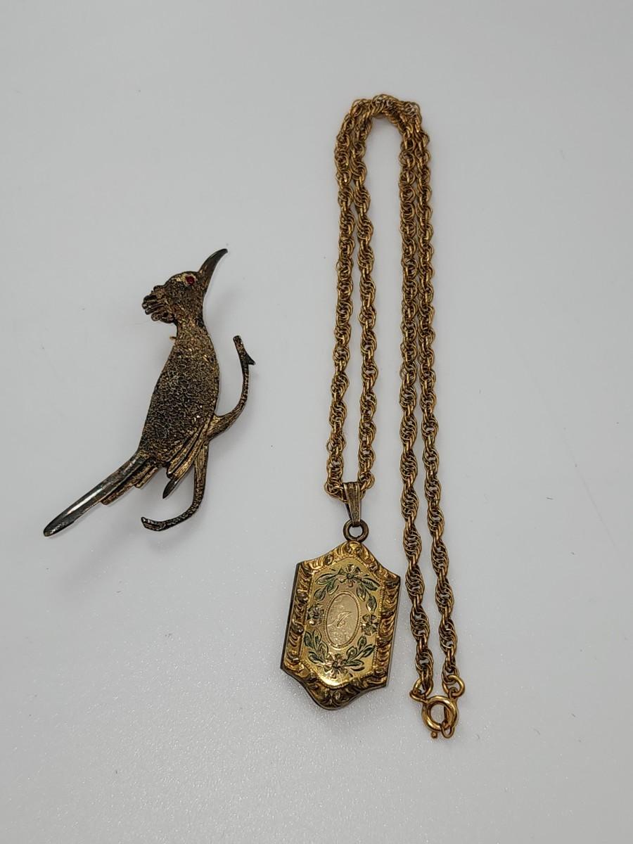 LOT 19:: Vintage Sterling Gold Vermeil Roadrunner Brooch Red Rhinestone Eye and 10k gold fill photo locket on 14k GF 15" L Chain