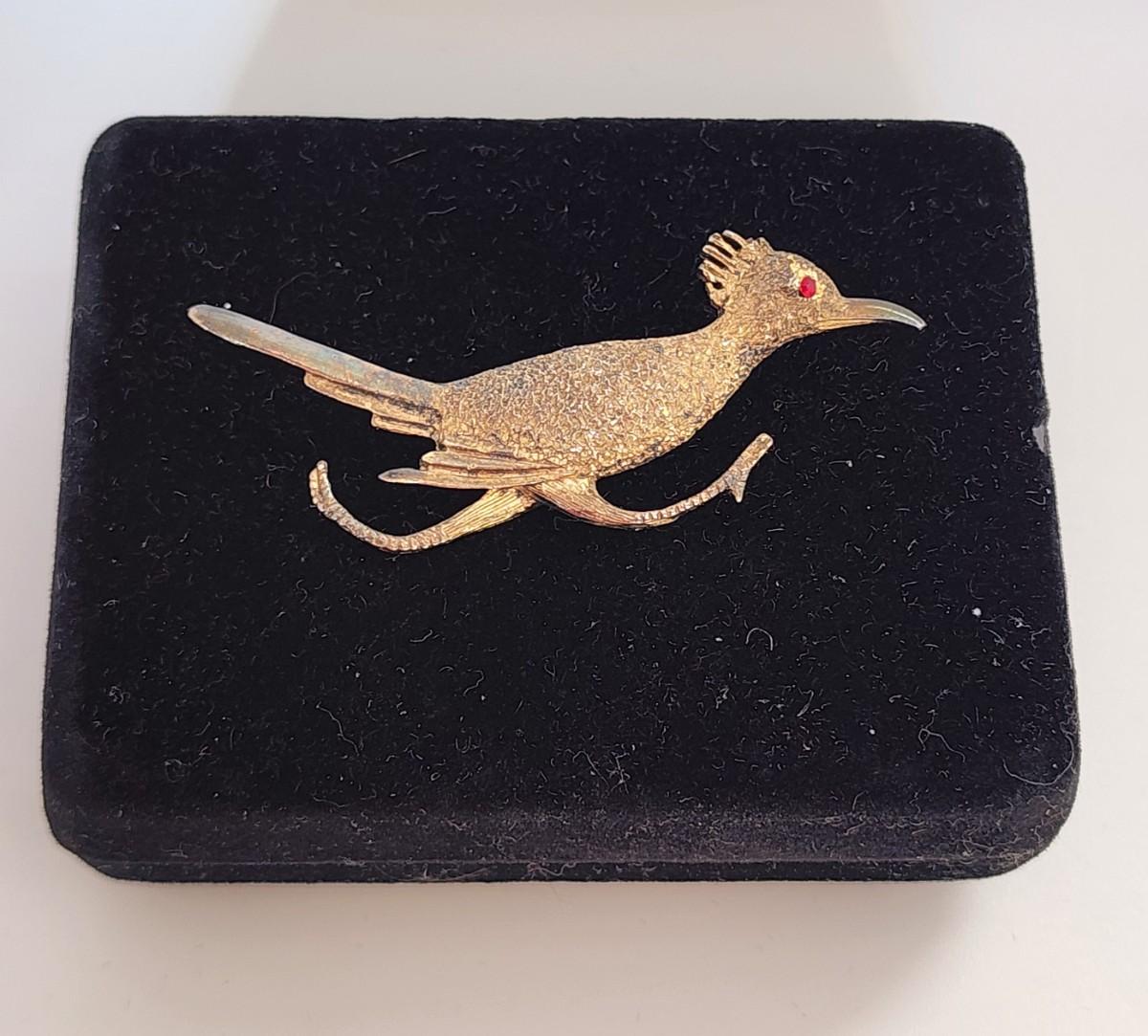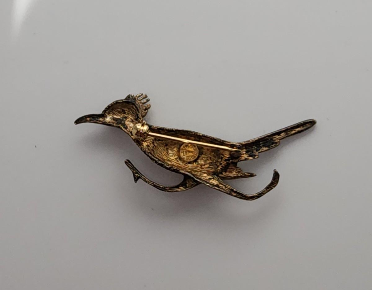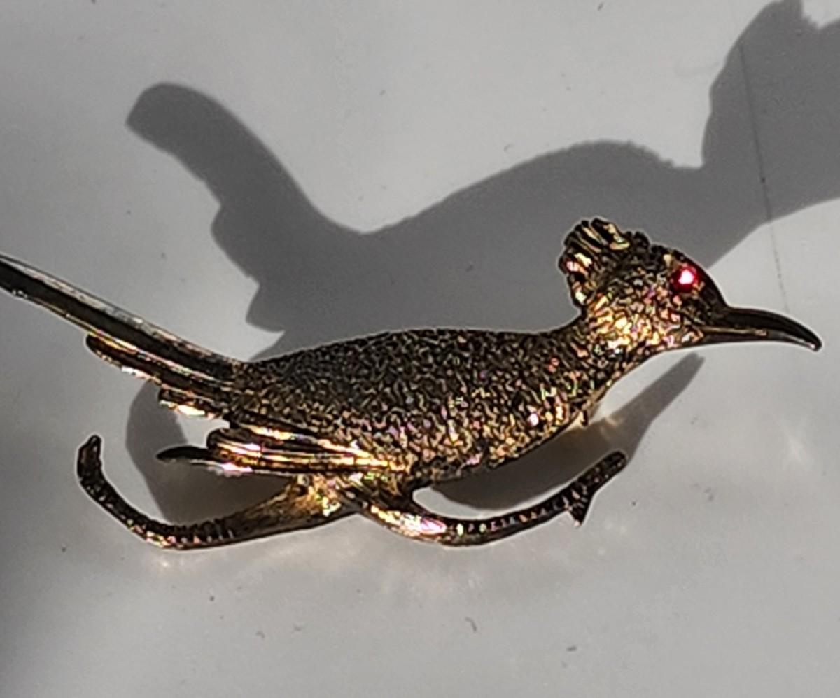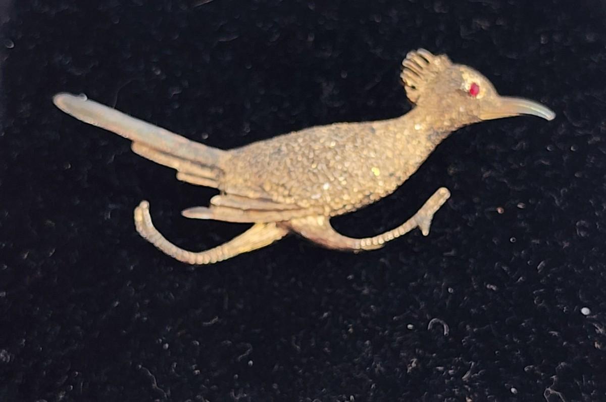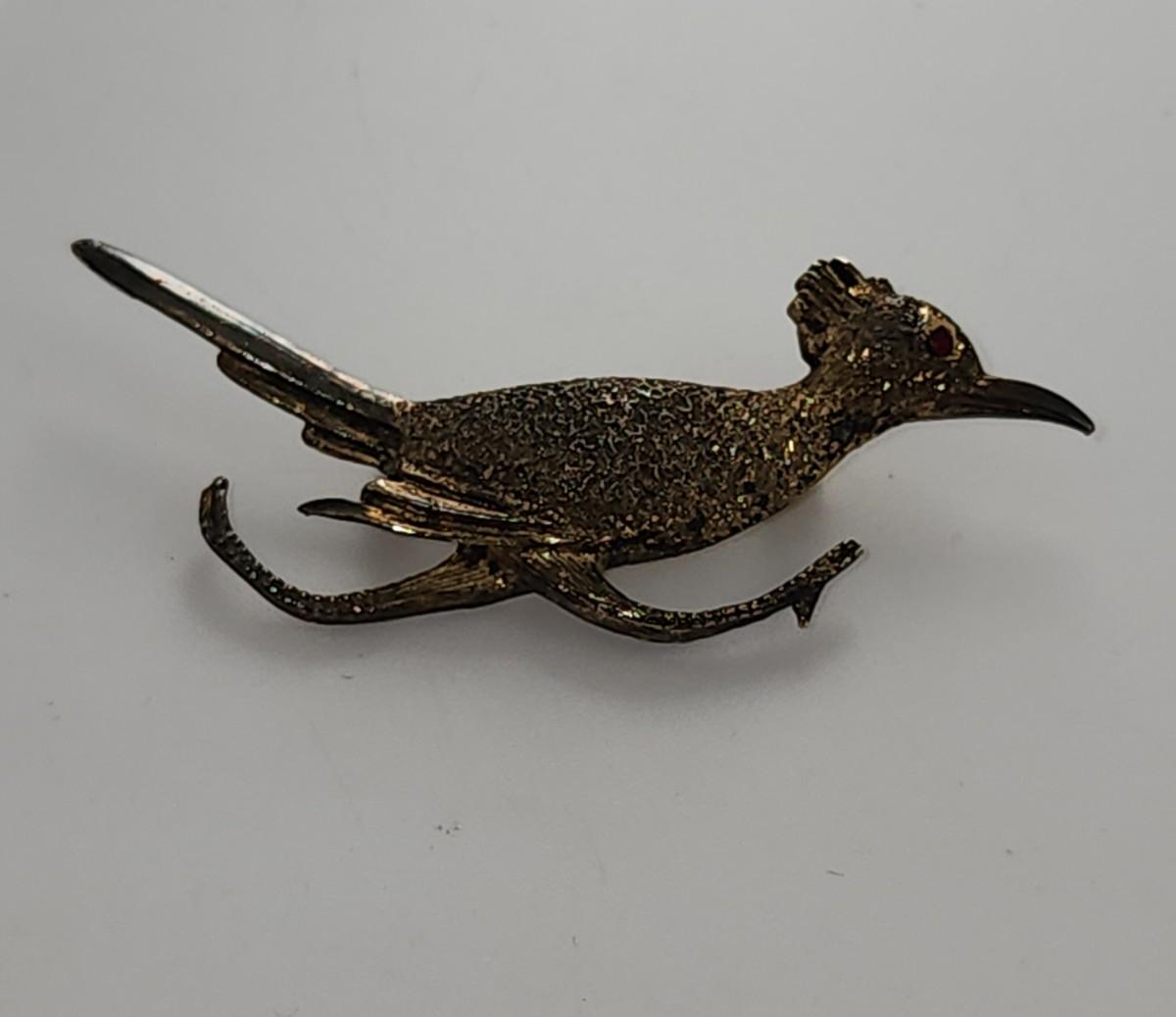 LOT 19:: Vintage Sterling Gold Vermeil Roadrunner Brooch Red Rhinestone Eye and 10k gold fill photo locket on 14k GF 15" L Chain