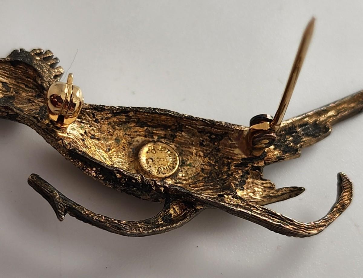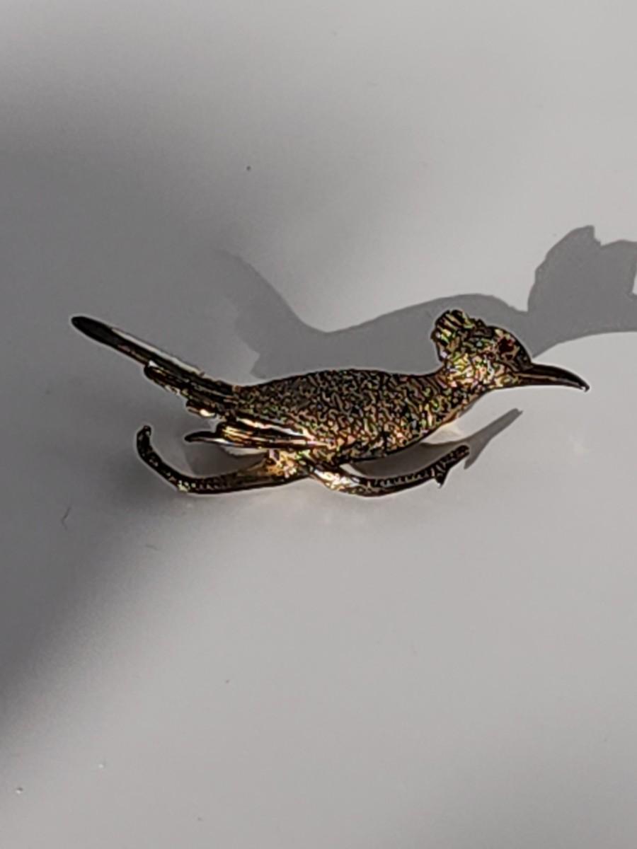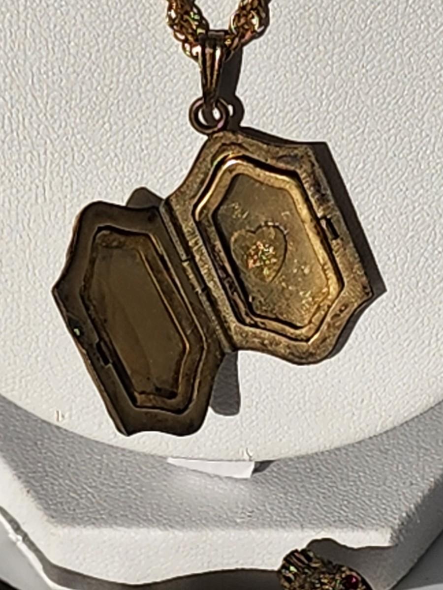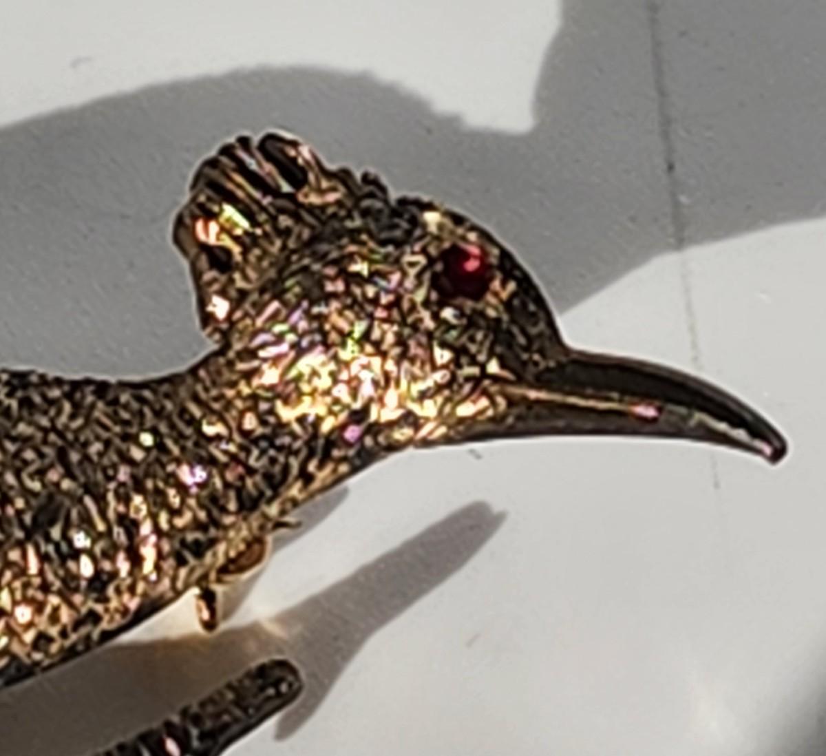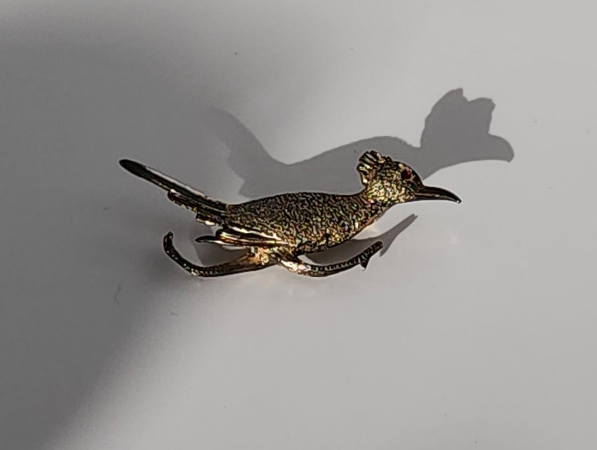 LOT 19:: Vintage Sterling Gold Vermeil Roadrunner Brooch Red Rhinestone Eye and 10k gold fill photo locket on 14k GF 15" L Chain