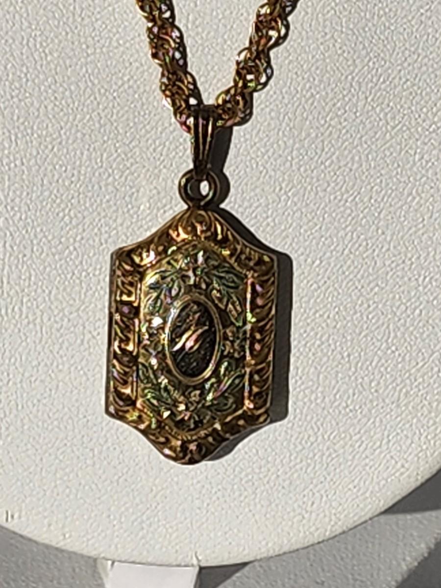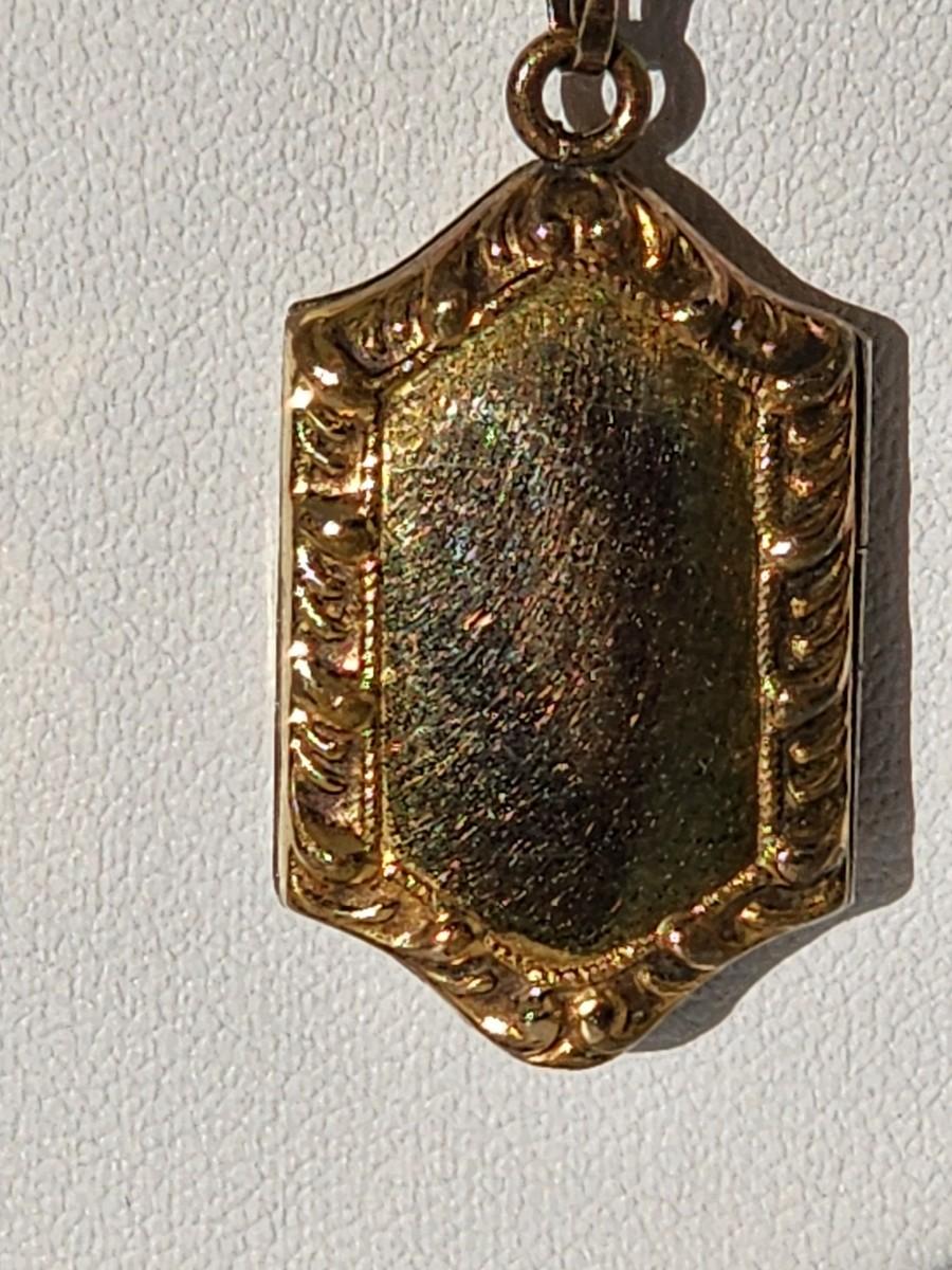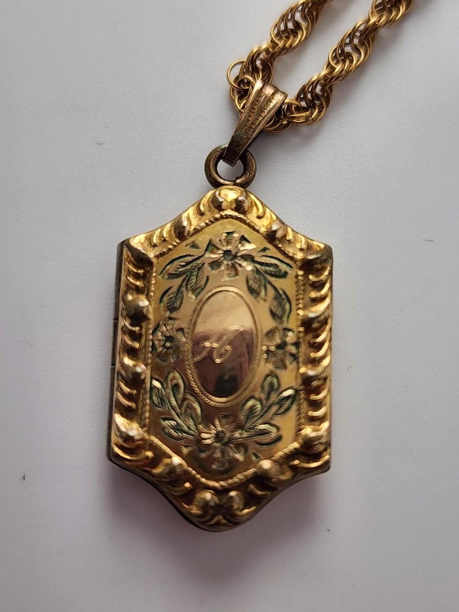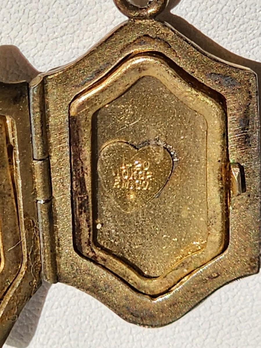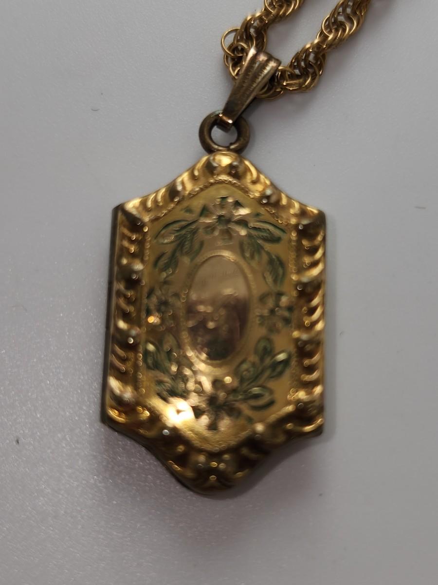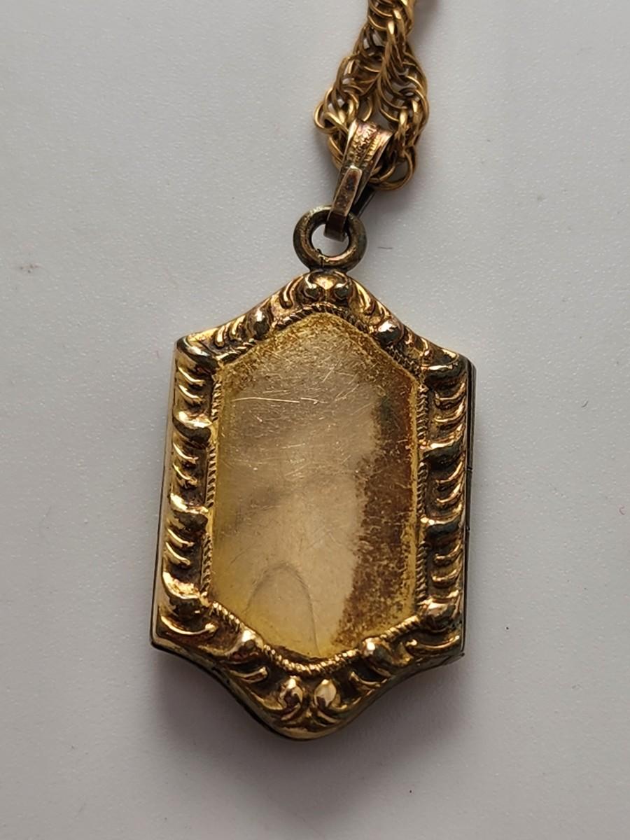 LOT 19:: Vintage Sterling Gold Vermeil Roadrunner Brooch Red Rhinestone Eye and 10k gold fill photo locket on 14k GF 15" L Chain