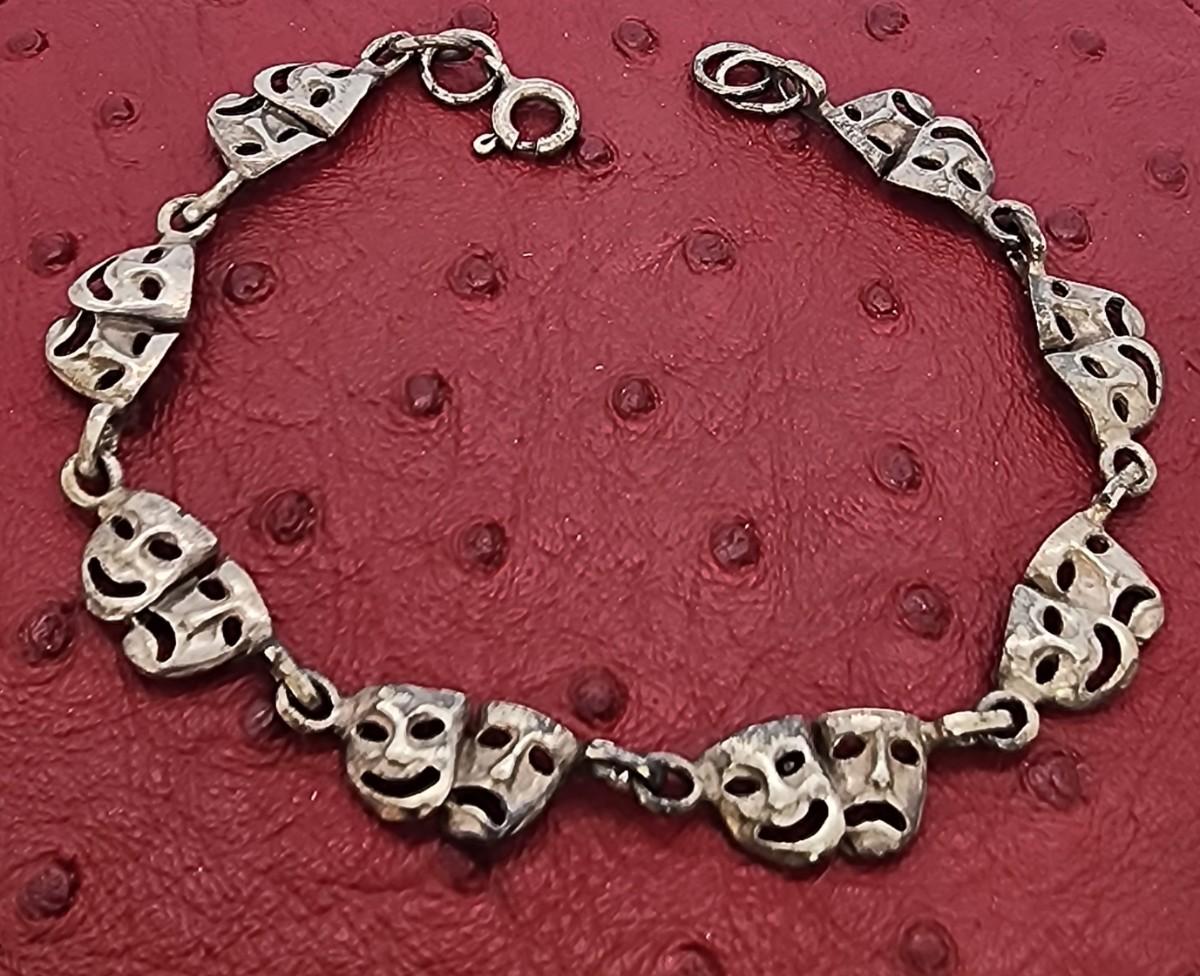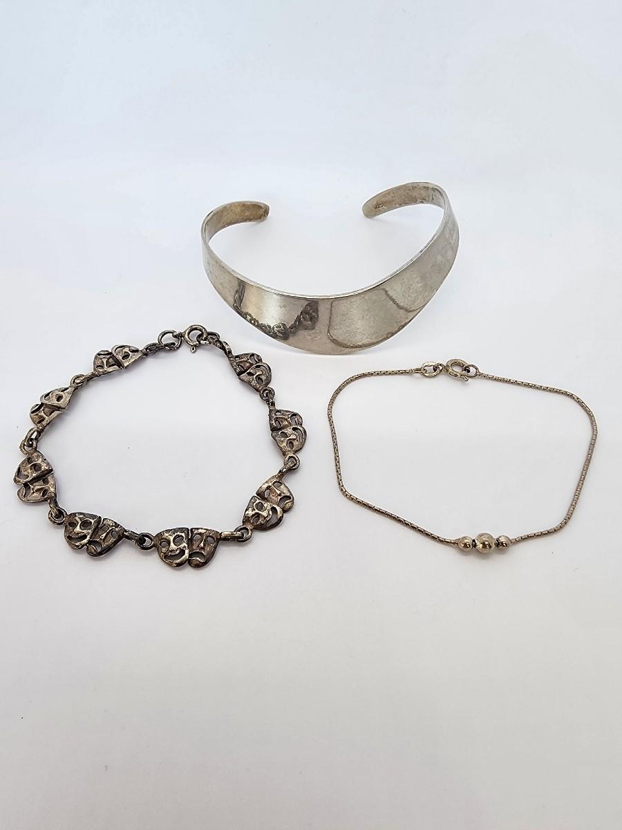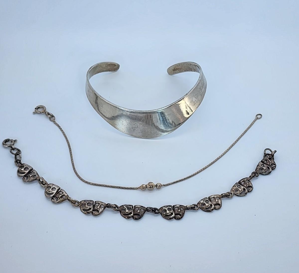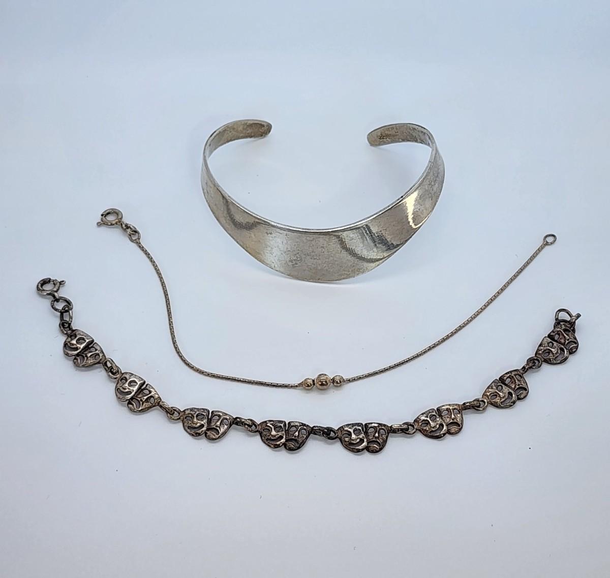 LOT:: Sterling Silver Bracelets- Classis Wave Cuff, I7" L Italian balls on rope chain and 7" L Comedy tragedy theater masks 30.8g