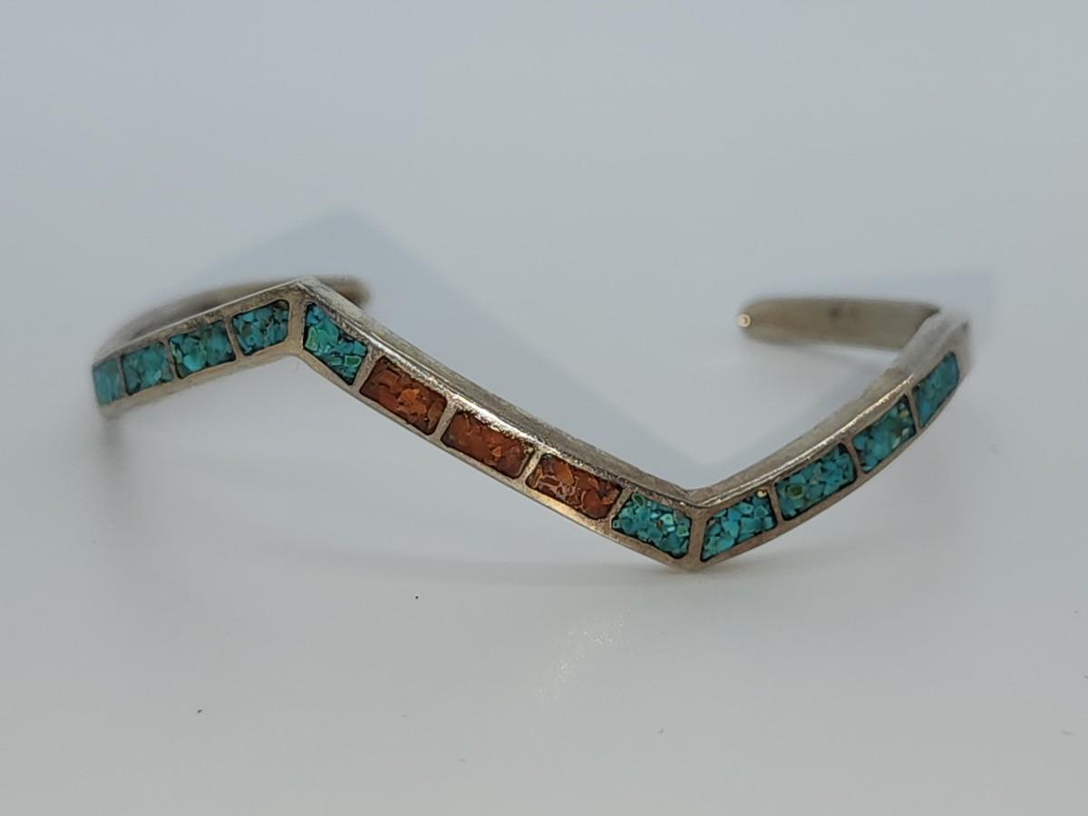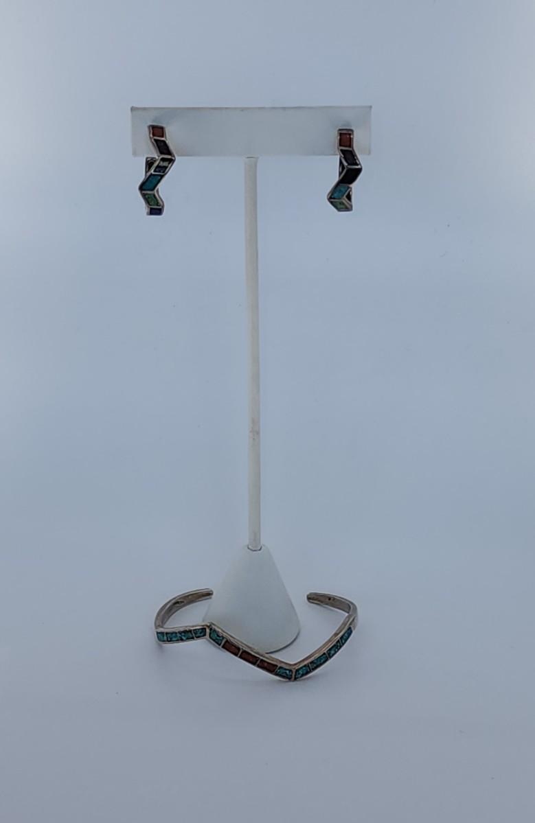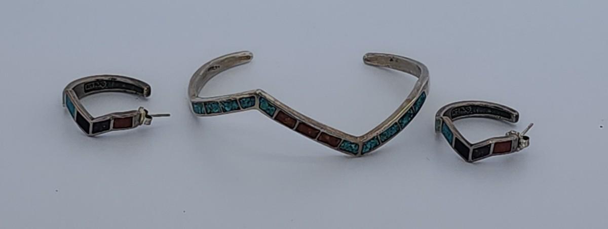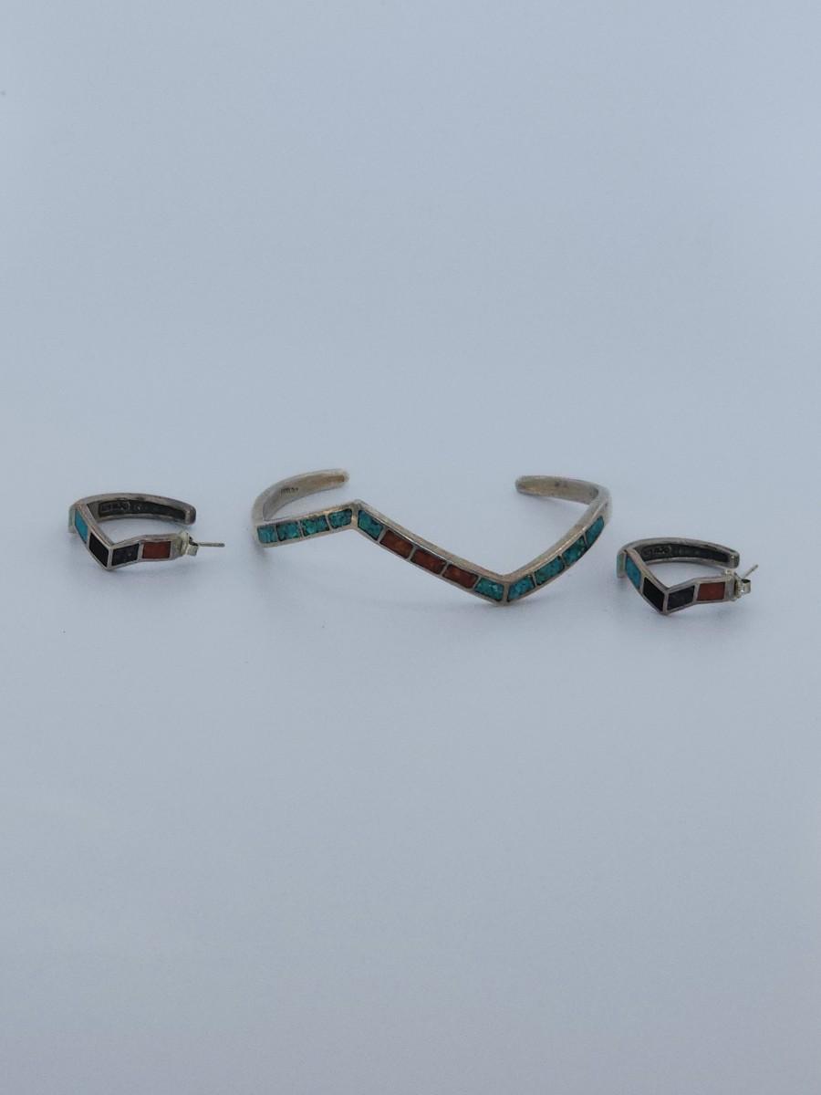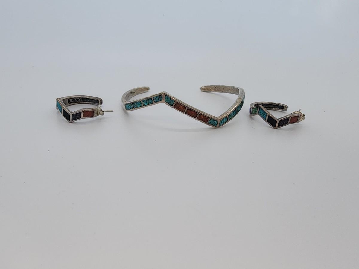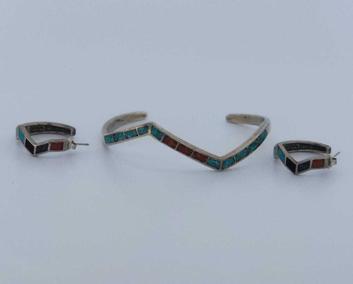 LOT 32:: Vintage Inlaid Turquoise and Coral Sterling Zig Zag Cuff and Inlay Sterling Zig Zag Pierced Earrings