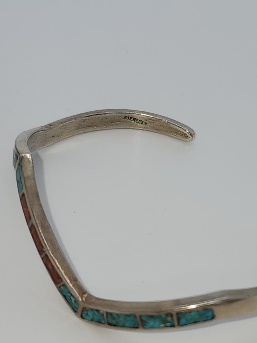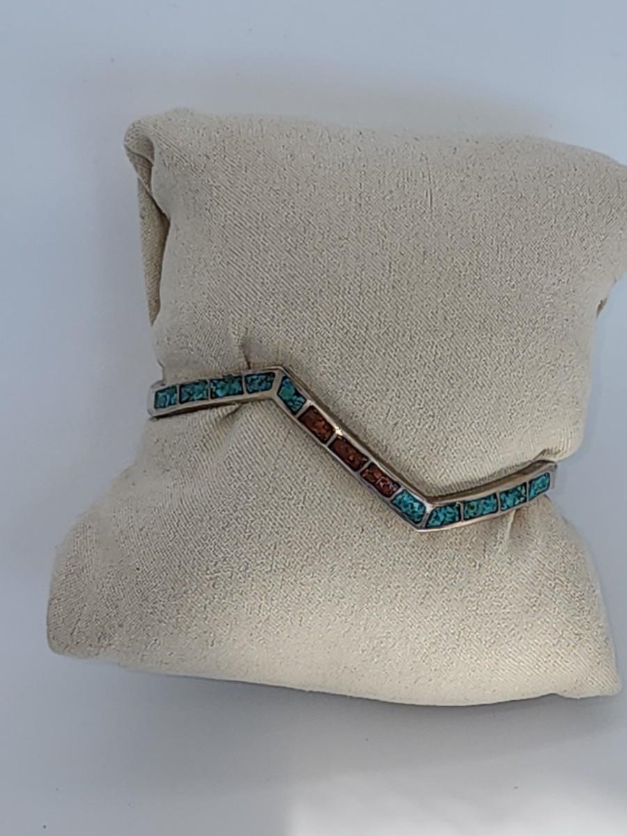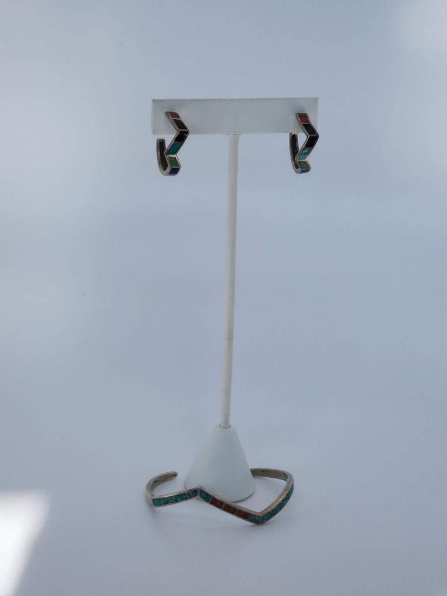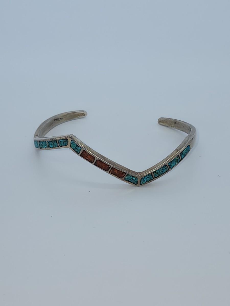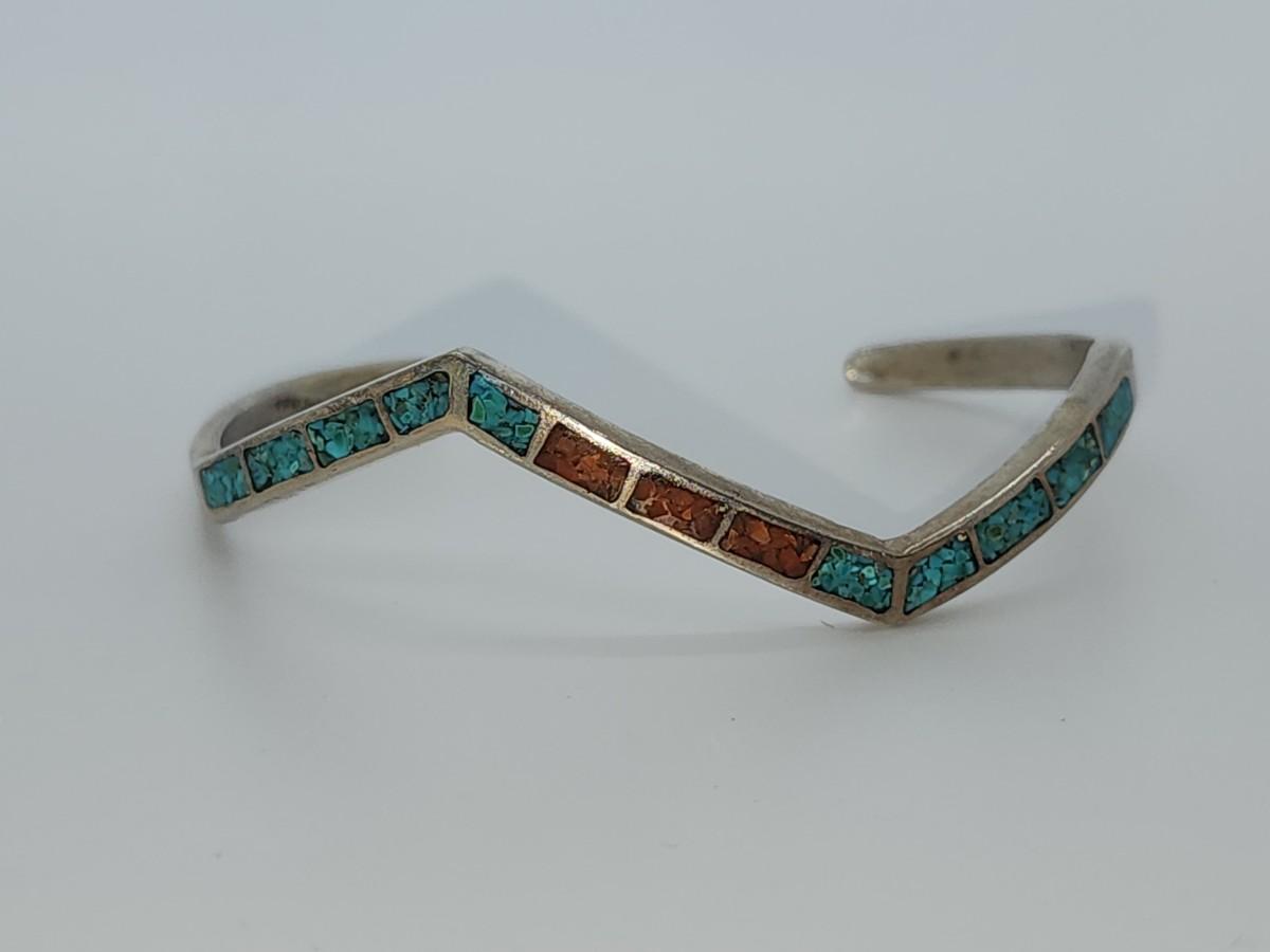 LOT 32:: Vintage Inlaid Turquoise and Coral Sterling Zig Zag Cuff and Inlay Sterling Zig Zag Pierced Earrings
