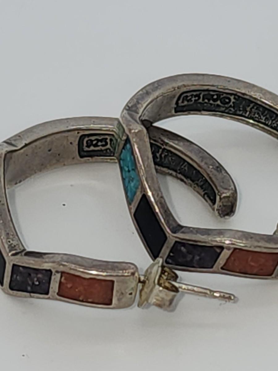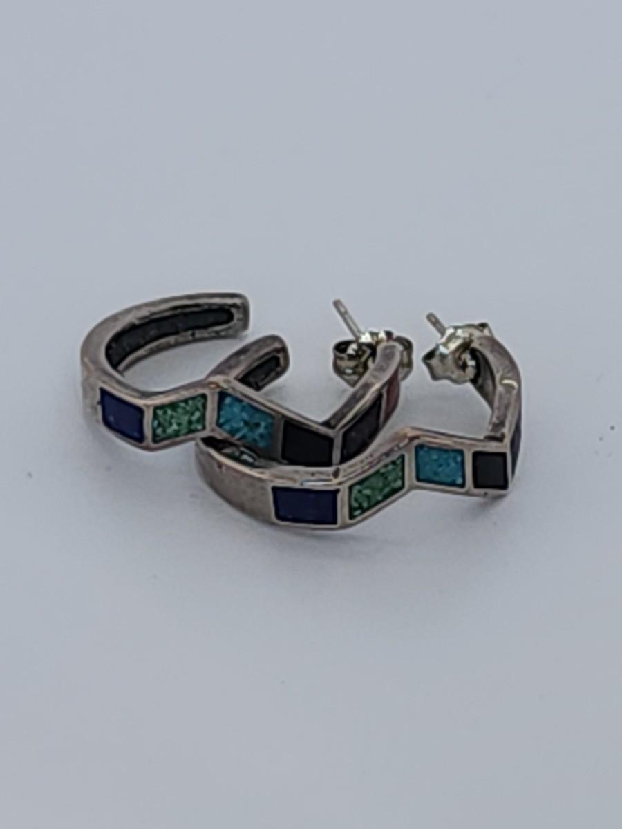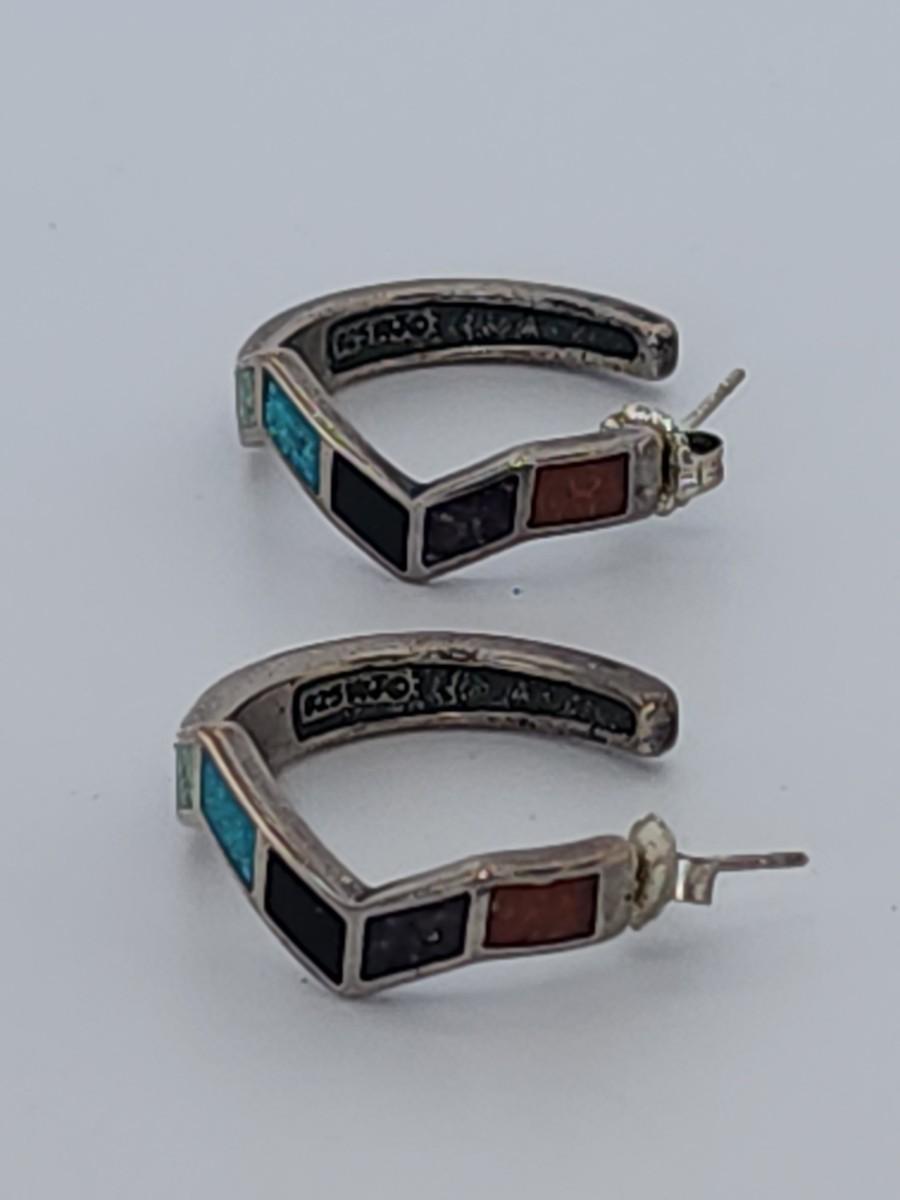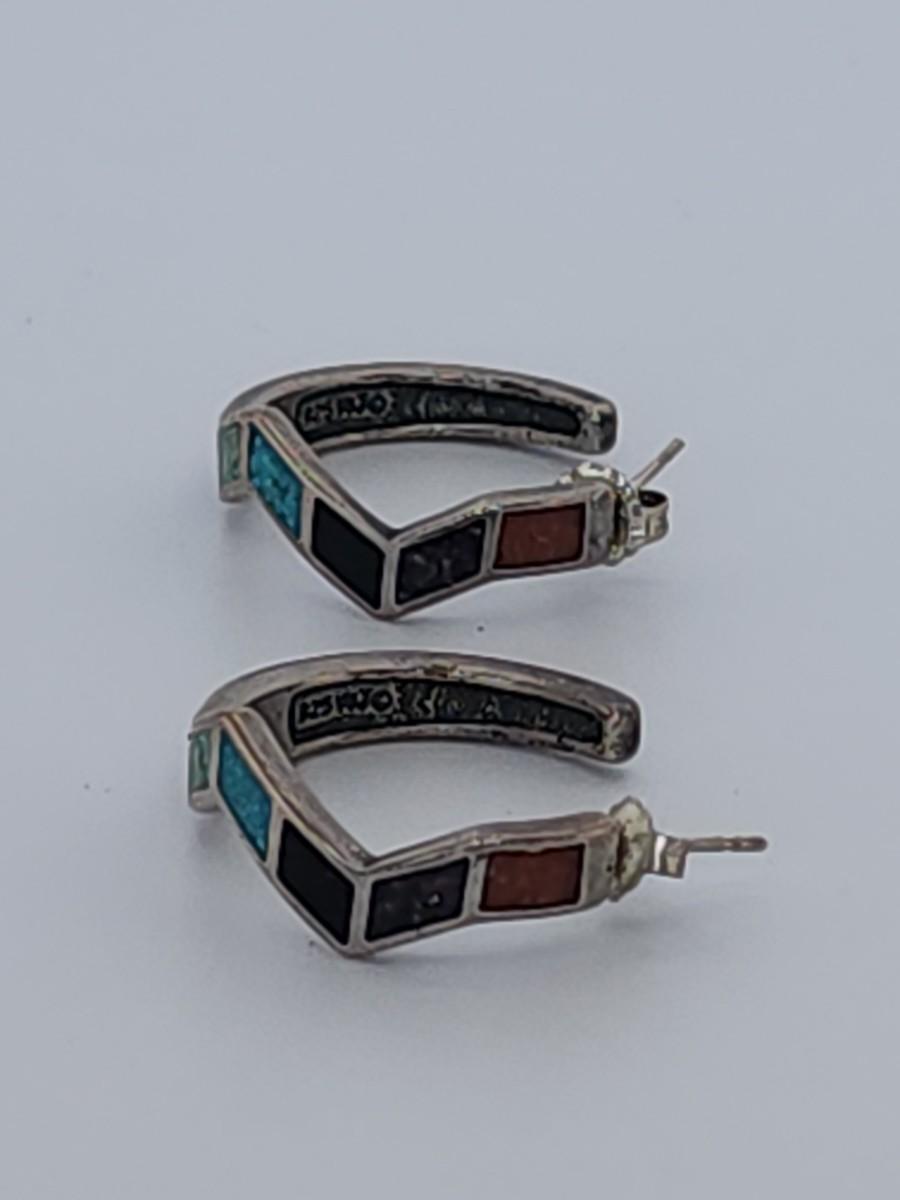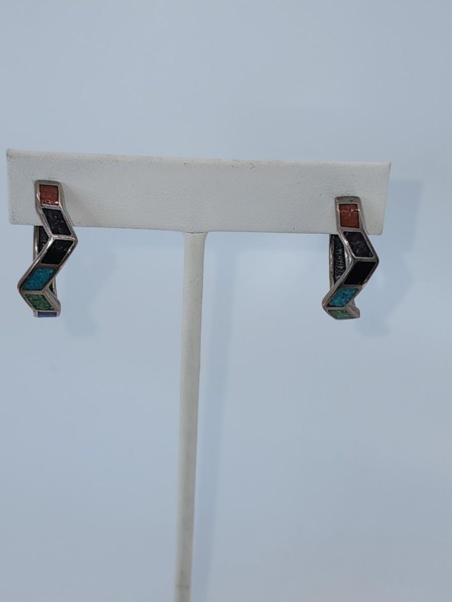 LOT 32:: Vintage Inlaid Turquoise and Coral Sterling Zig Zag Cuff and Inlay Sterling Zig Zag Pierced Earrings