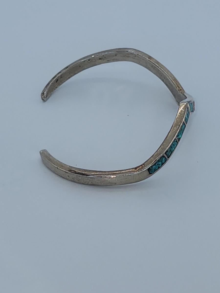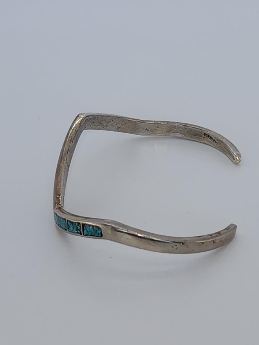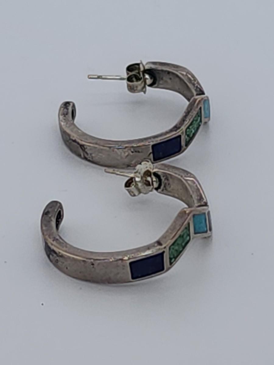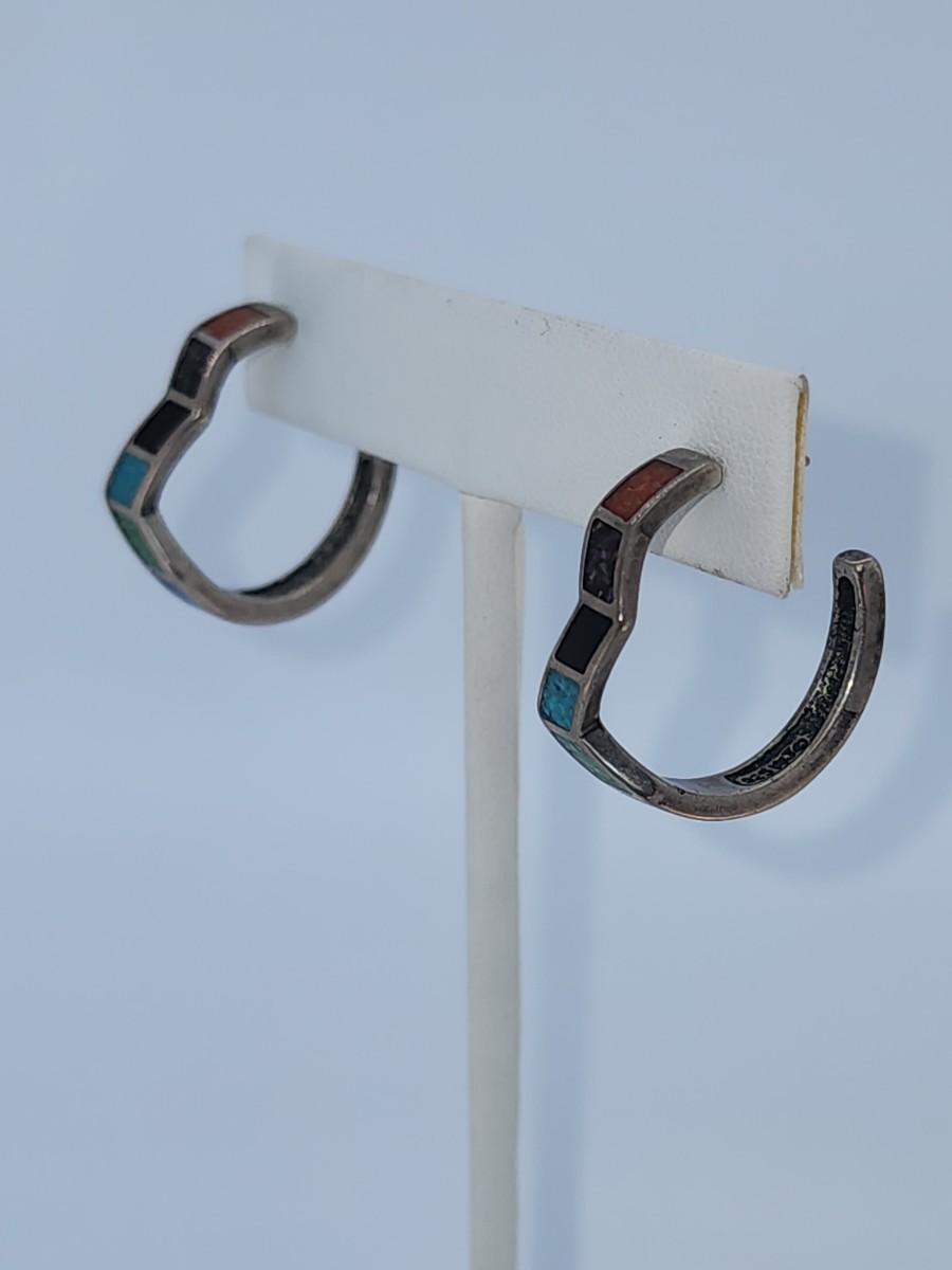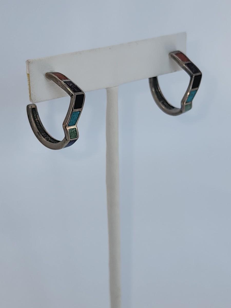 LOT 32:: Vintage Inlaid Turquoise and Coral Sterling Zig Zag Cuff and Inlay Sterling Zig Zag Pierced Earrings