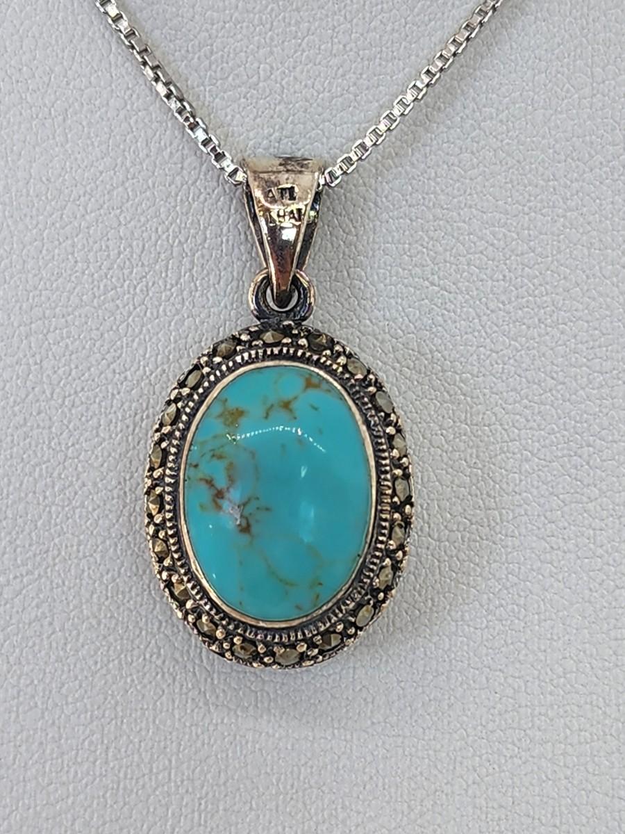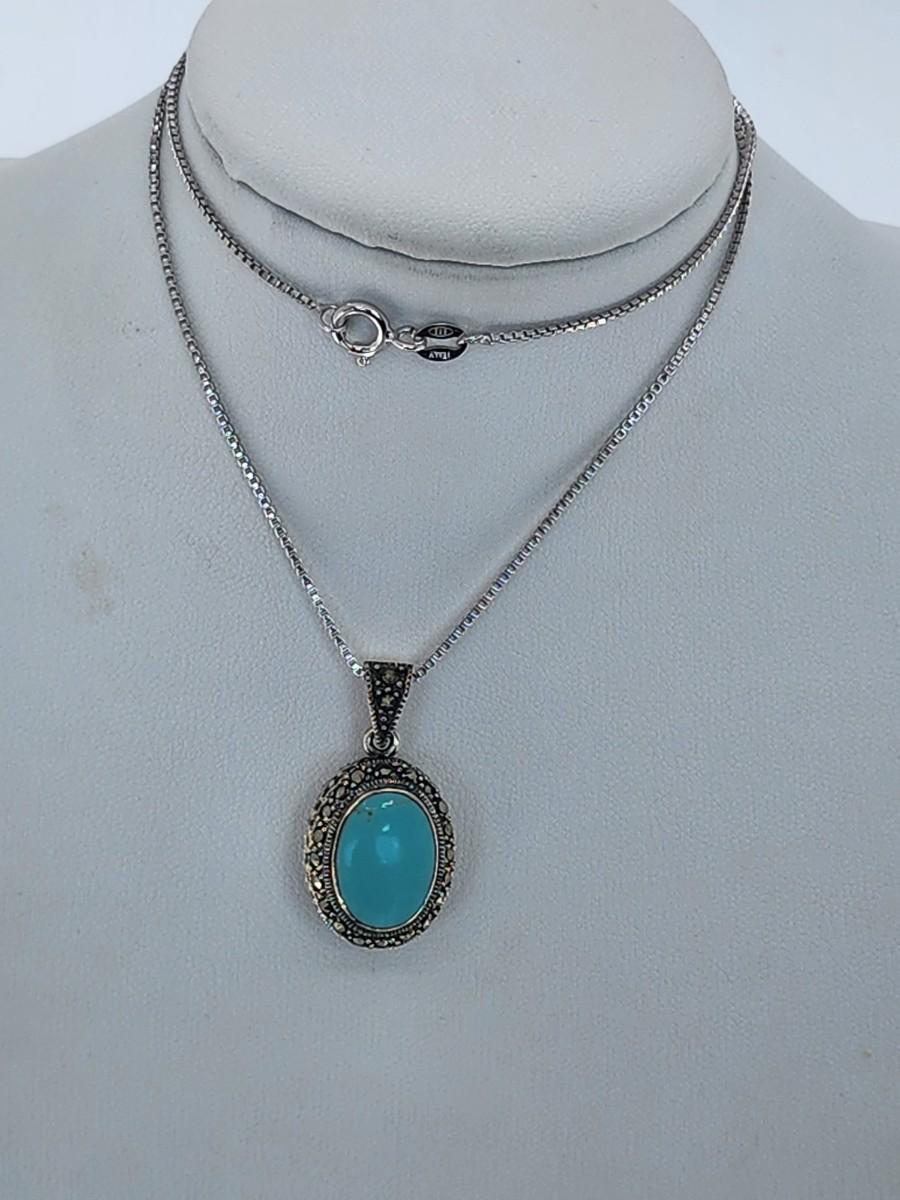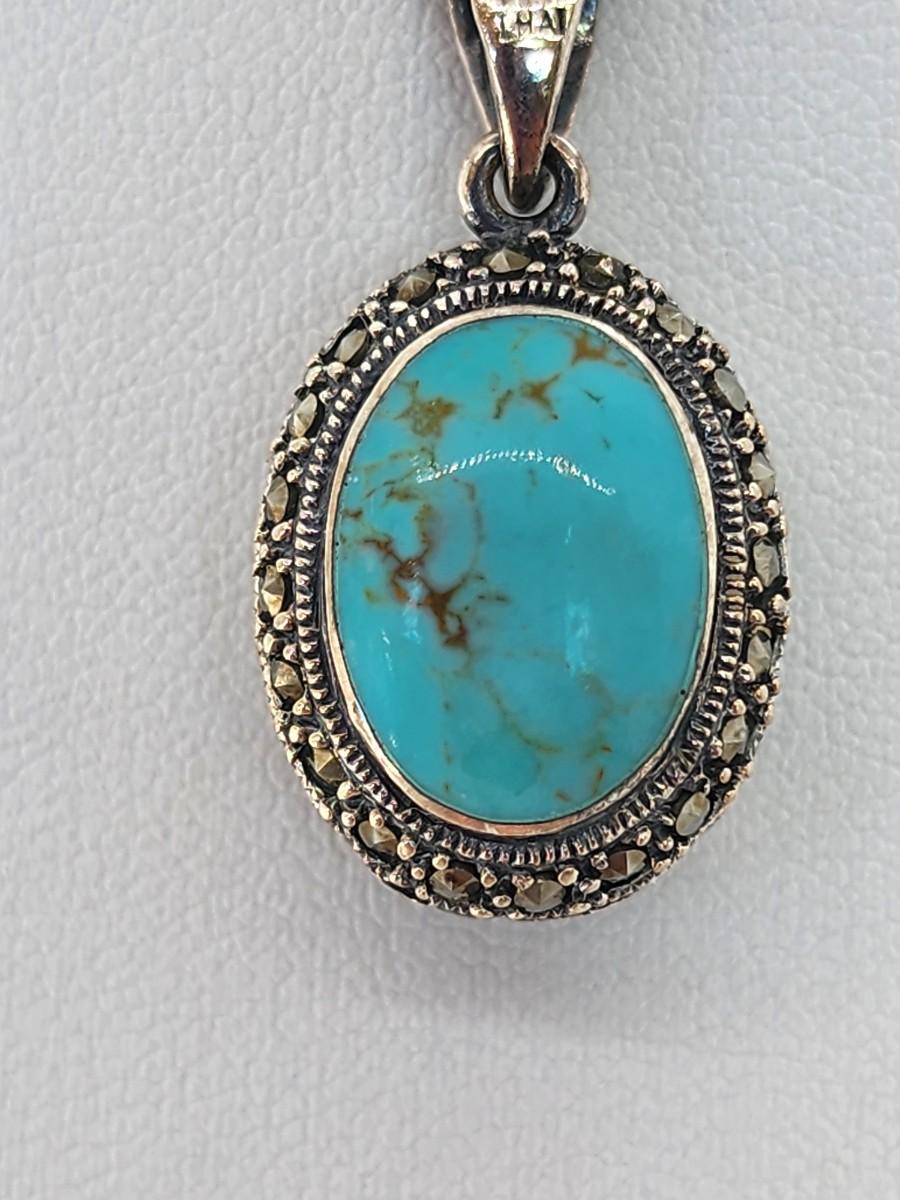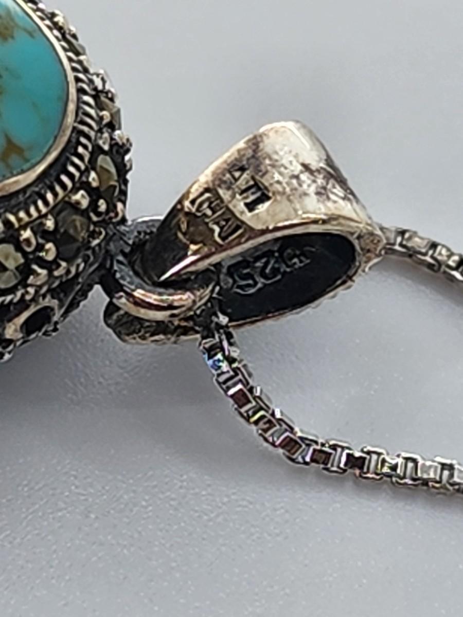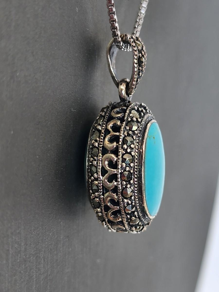 LOT 34:: Sterling Turquoise and Marcasite double sided pendant on 16" L 925 Italy chain