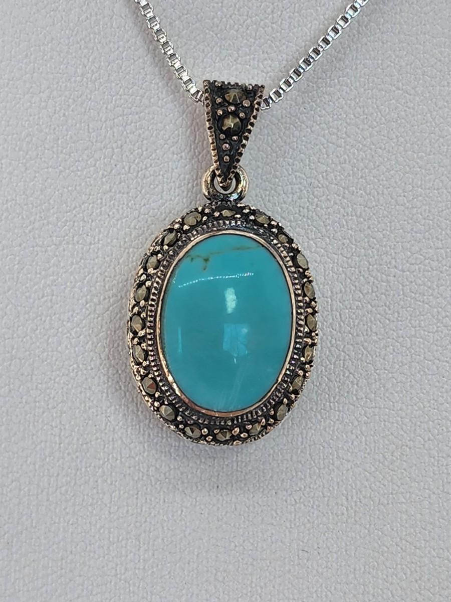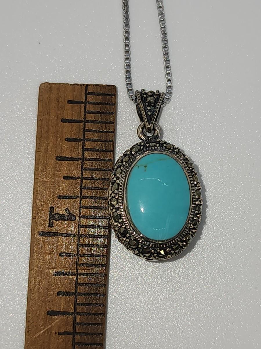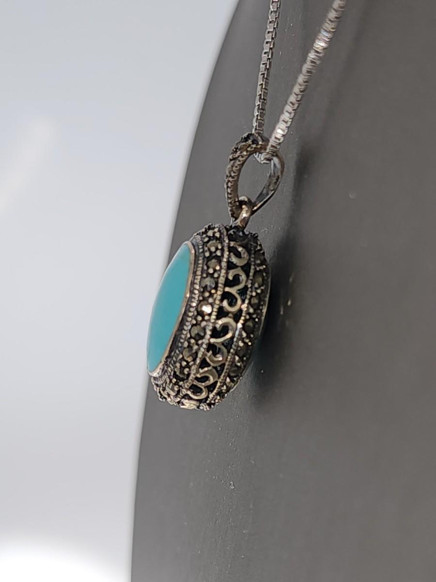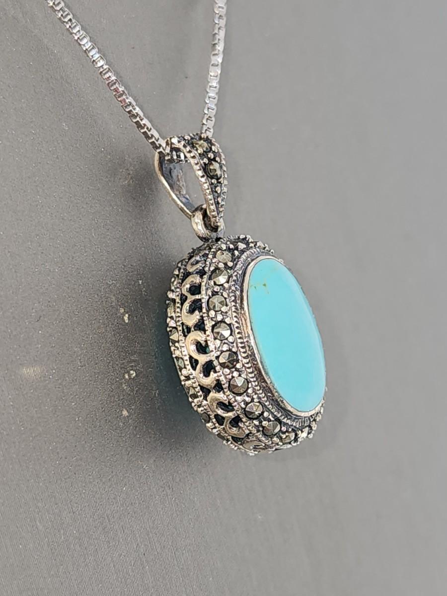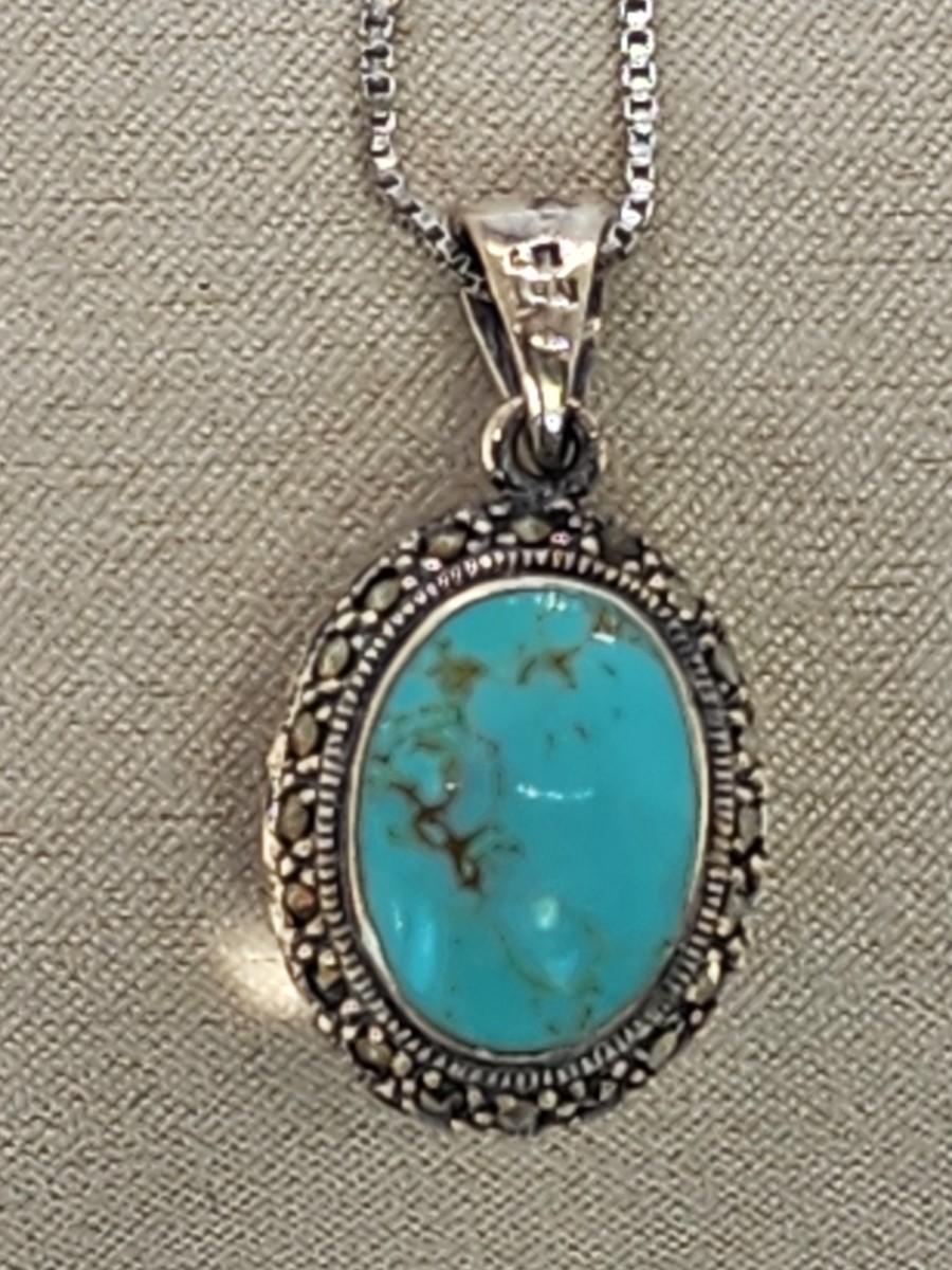 LOT 34:: Sterling Turquoise and Marcasite double sided pendant on 16" L 925 Italy chain