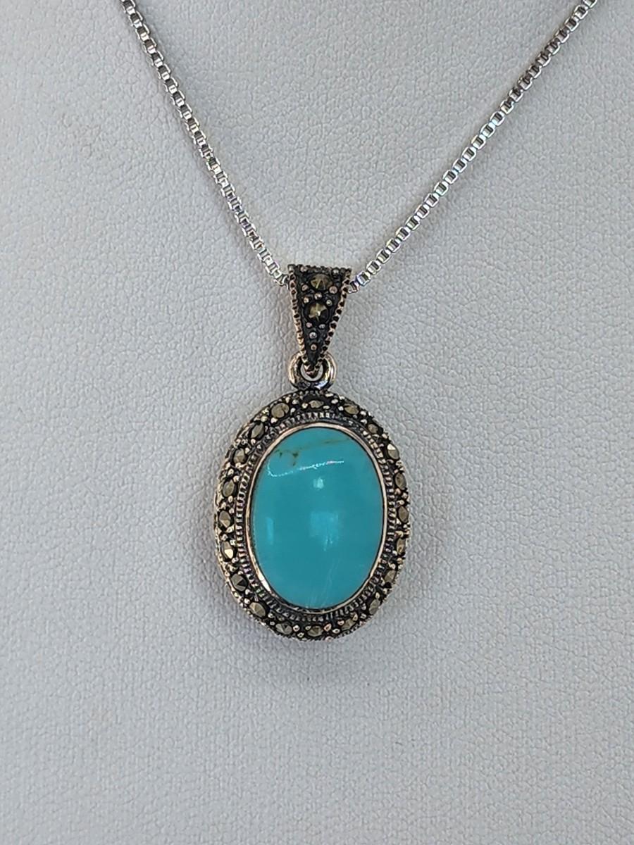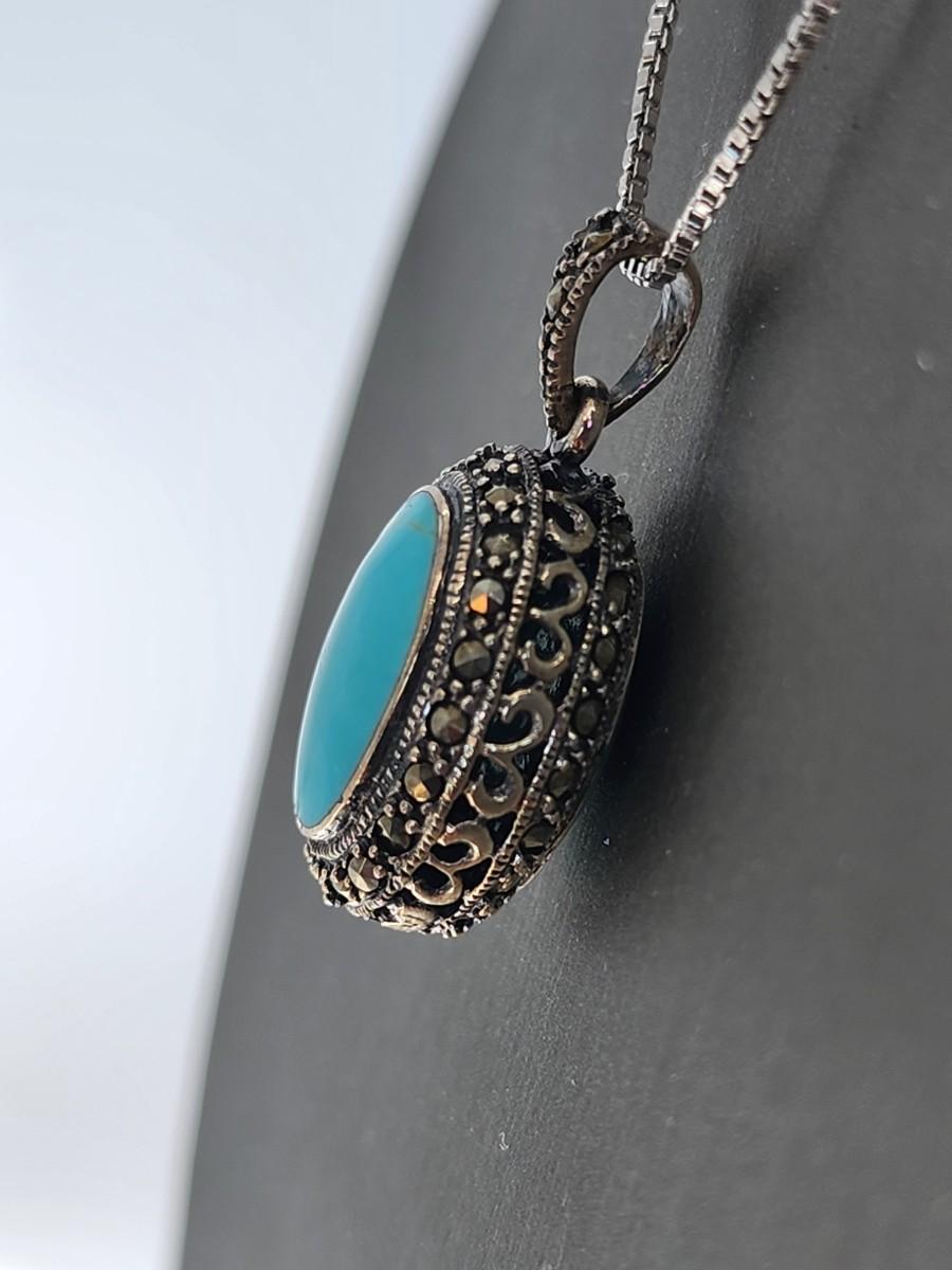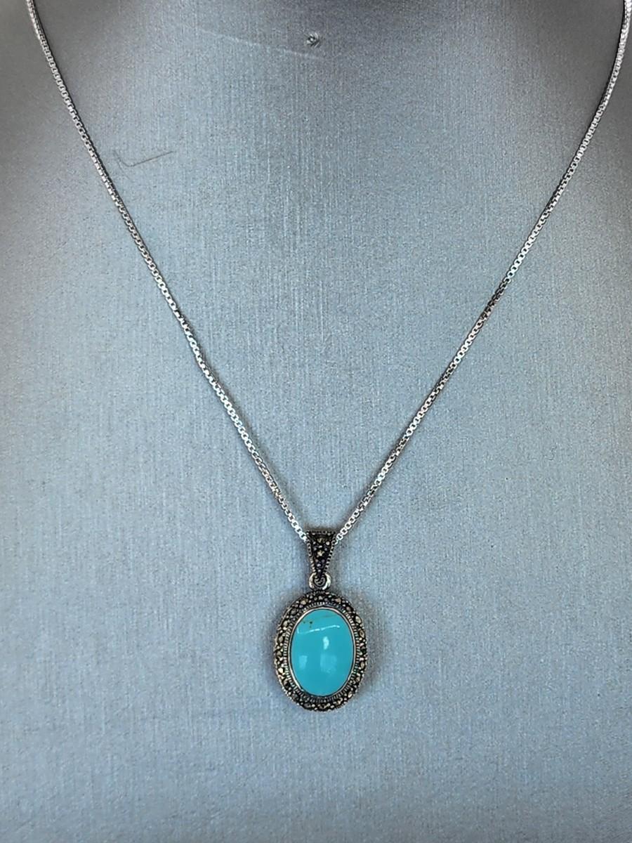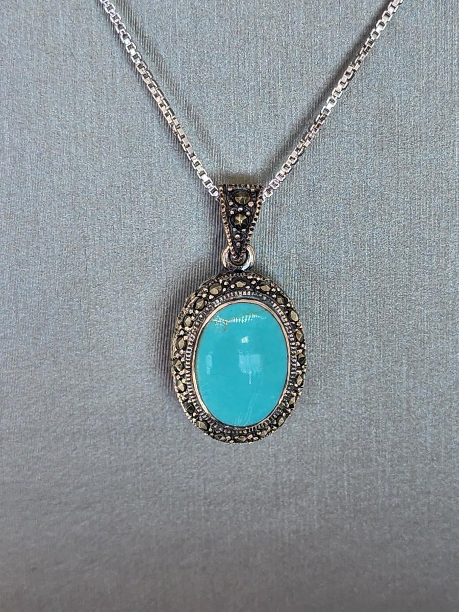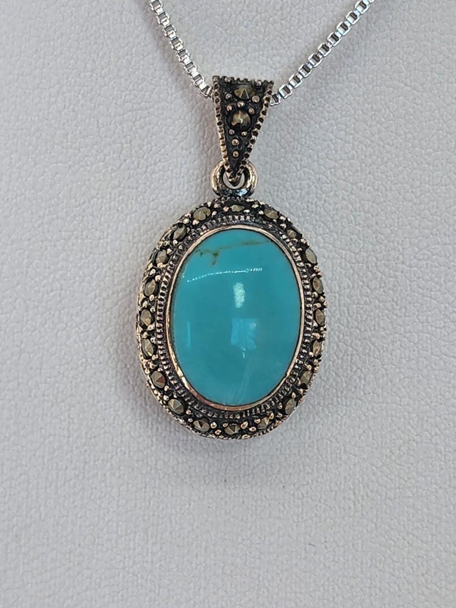LOT 34:: Sterling Turquoise and Marcasite double sided pendant on 16" L 925 Italy chain