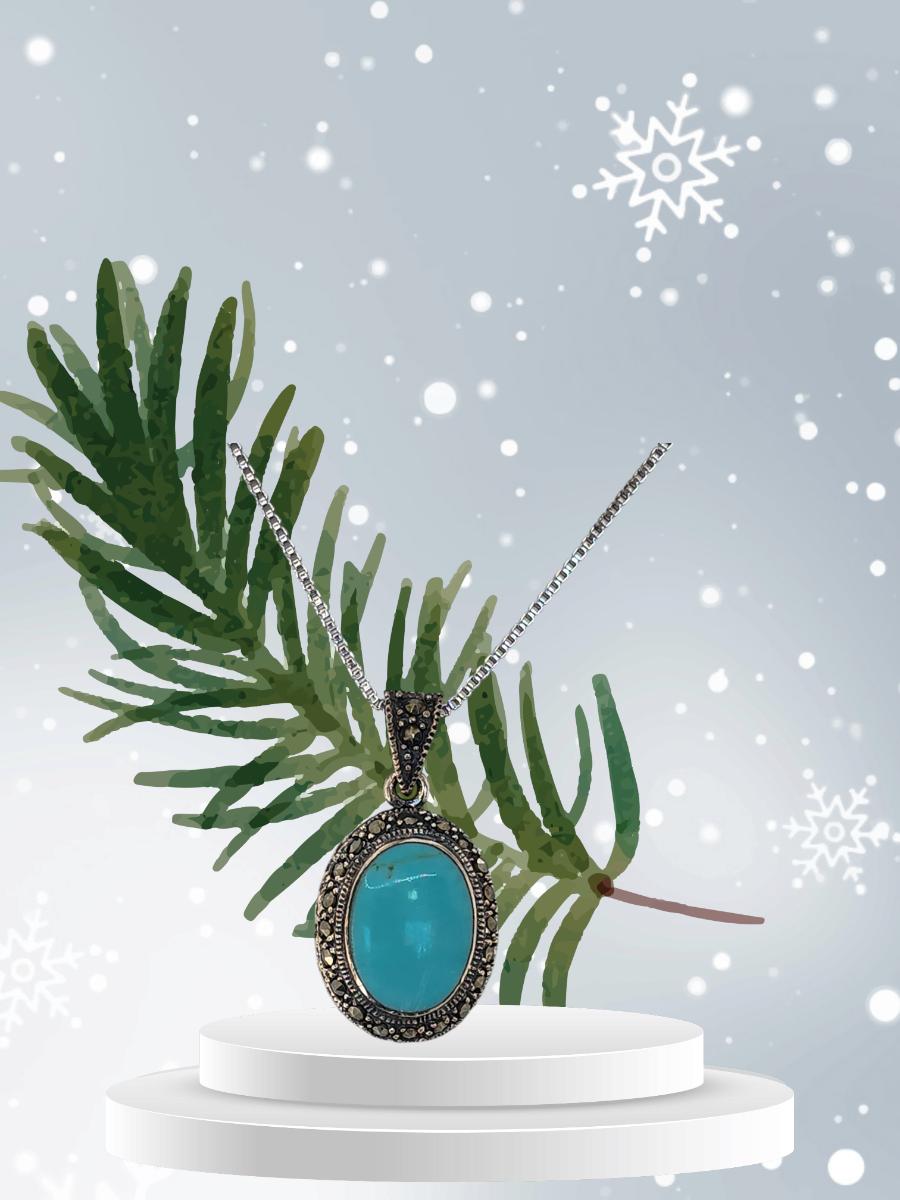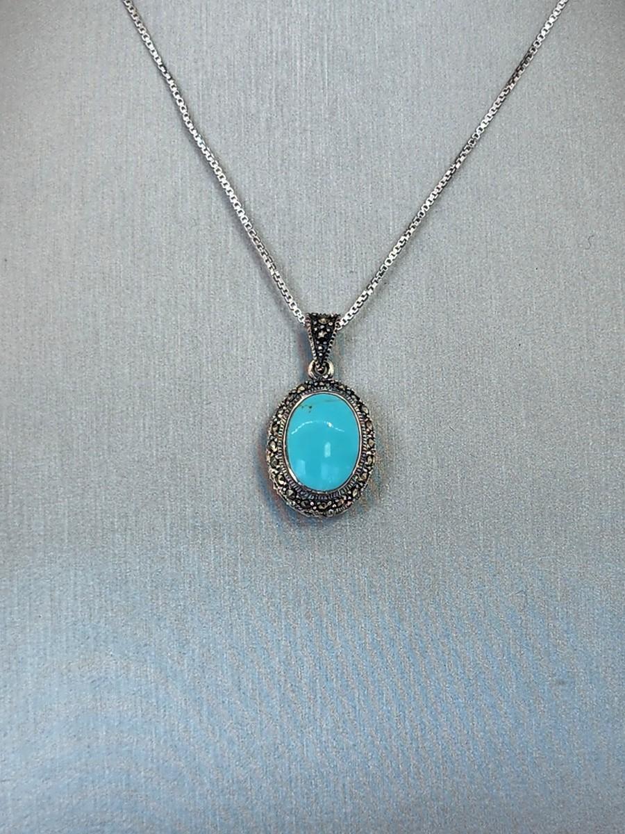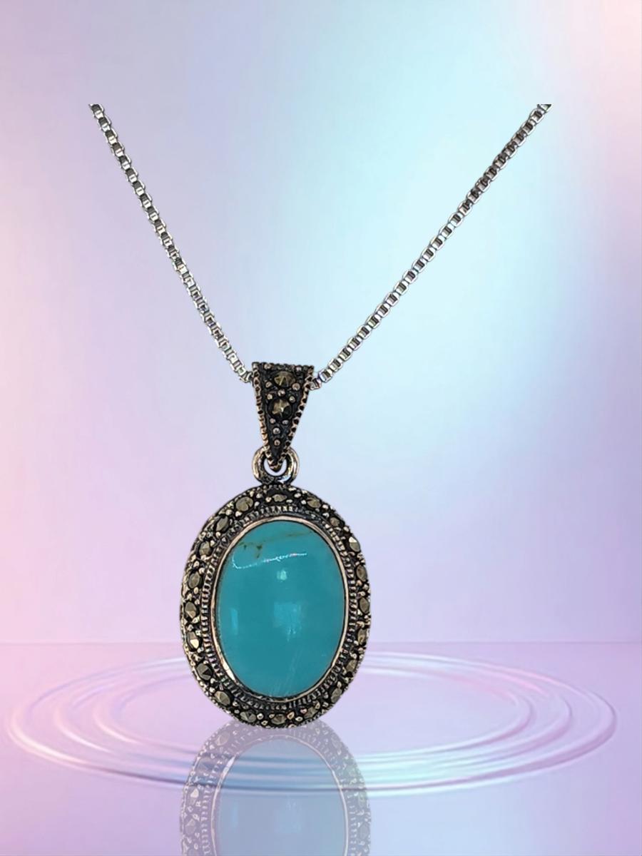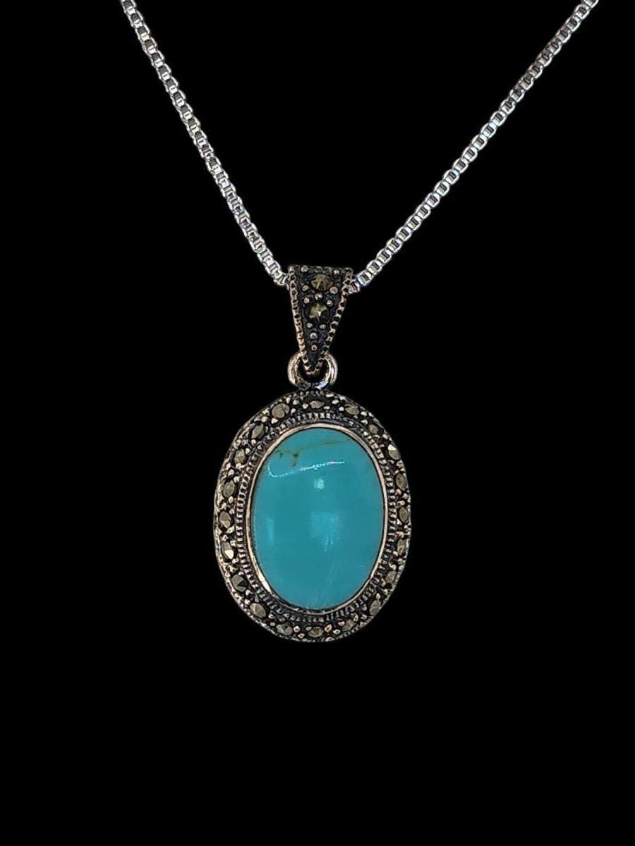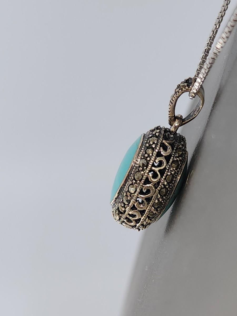 LOT 34:: Sterling Turquoise and Marcasite double sided pendant on 16" L 925 Italy chain