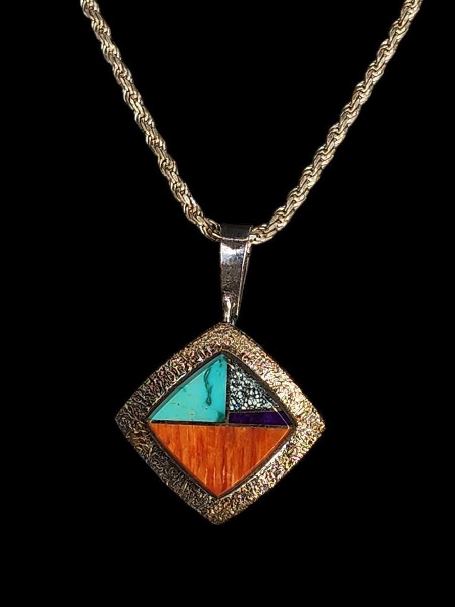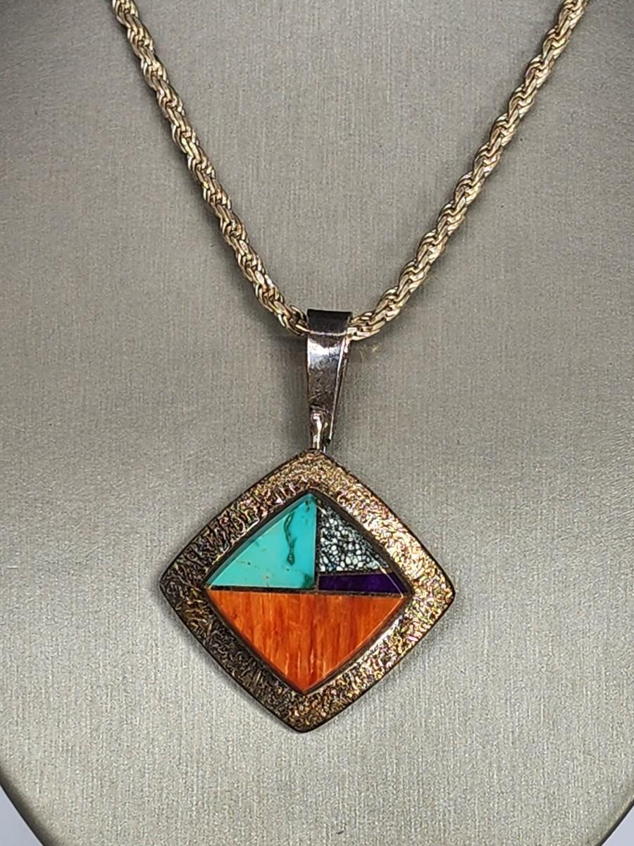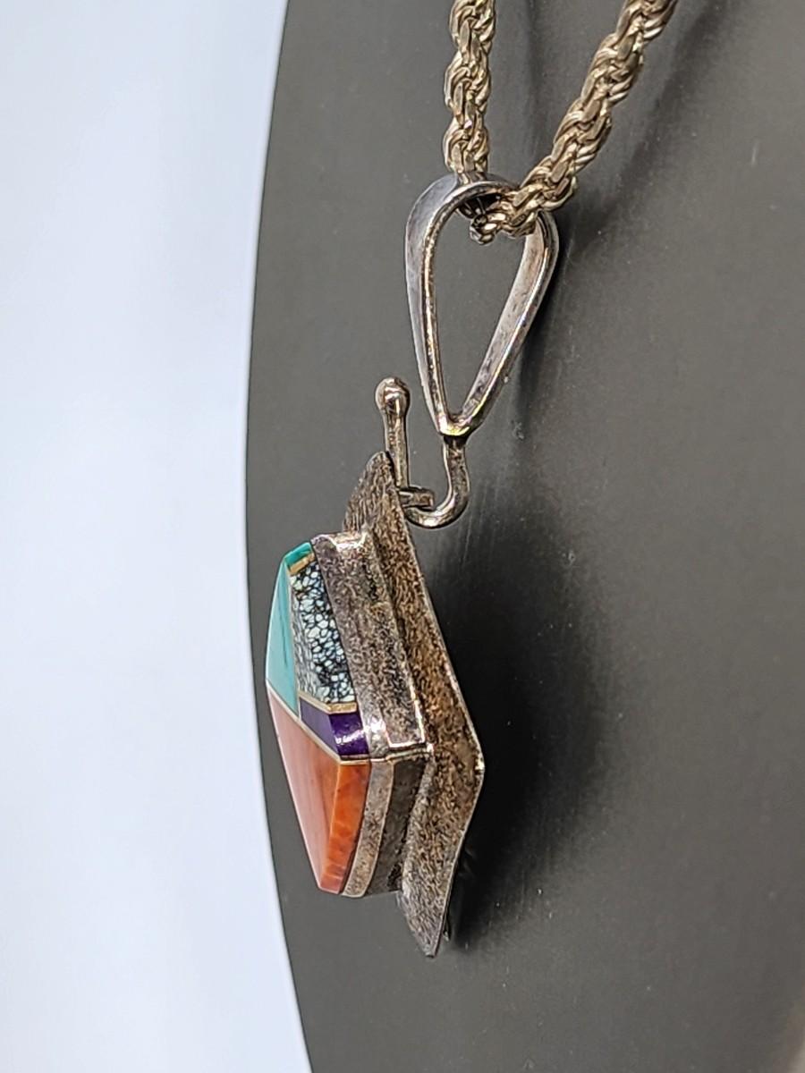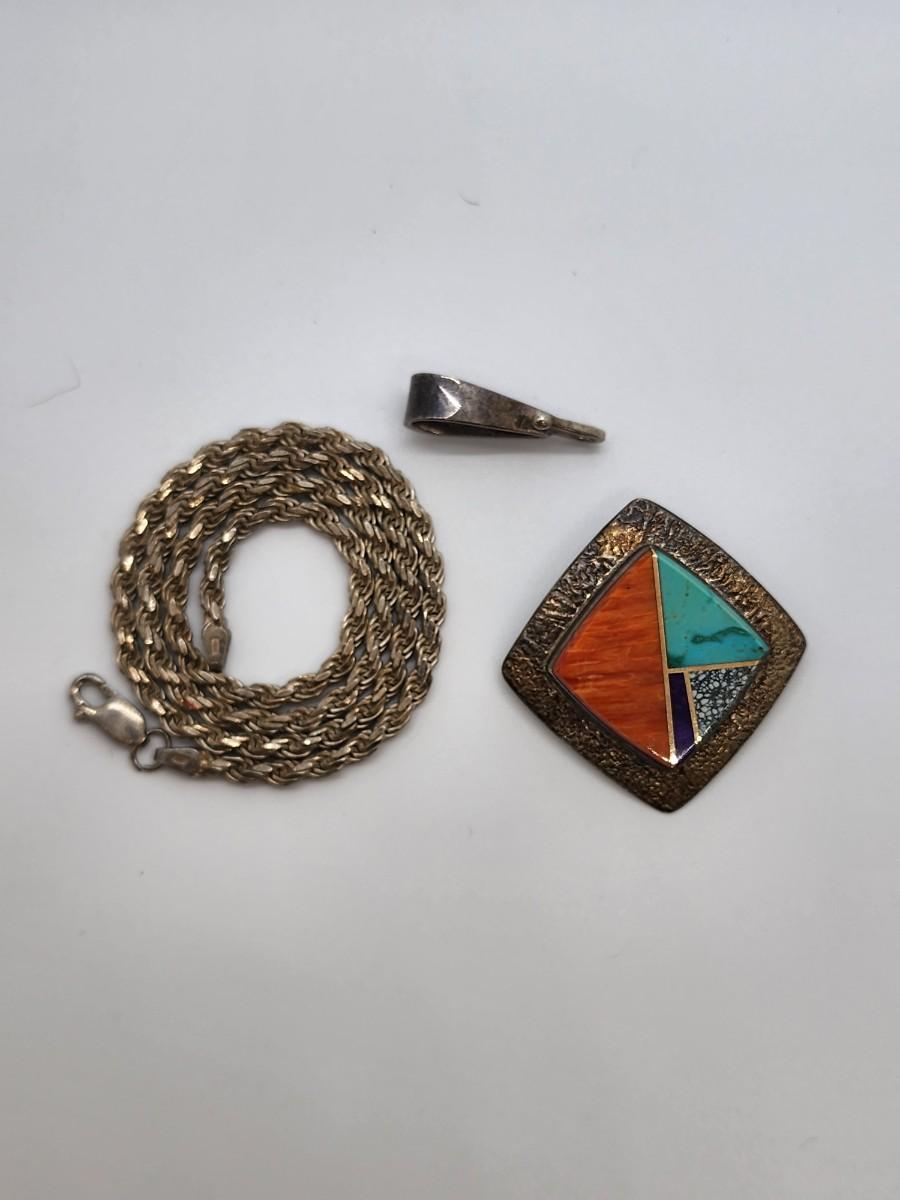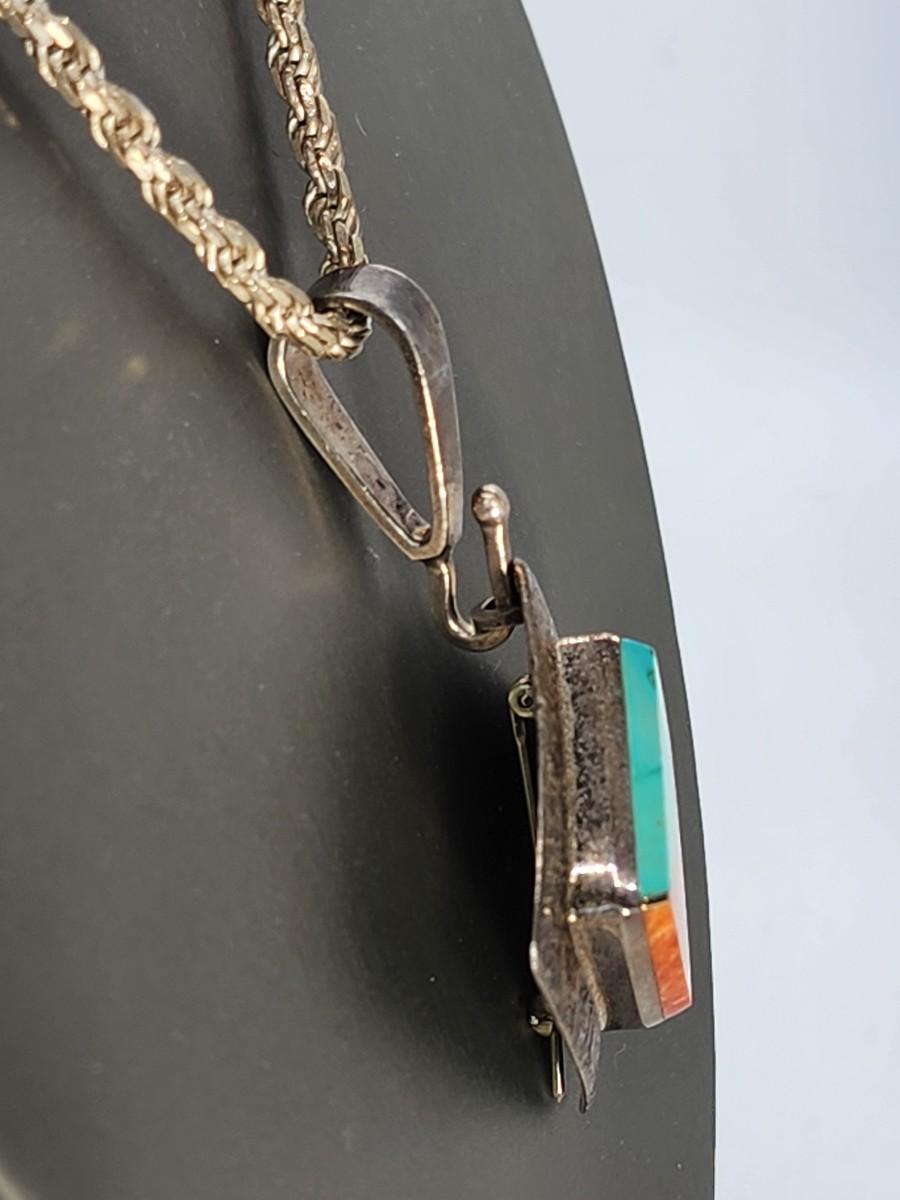 LOT 36:: Vintage Beautiful Inlaid Turquoise and other gemstones Pendant/Brooch with removable Bail and a thick 18"L Chain 925 Italy
