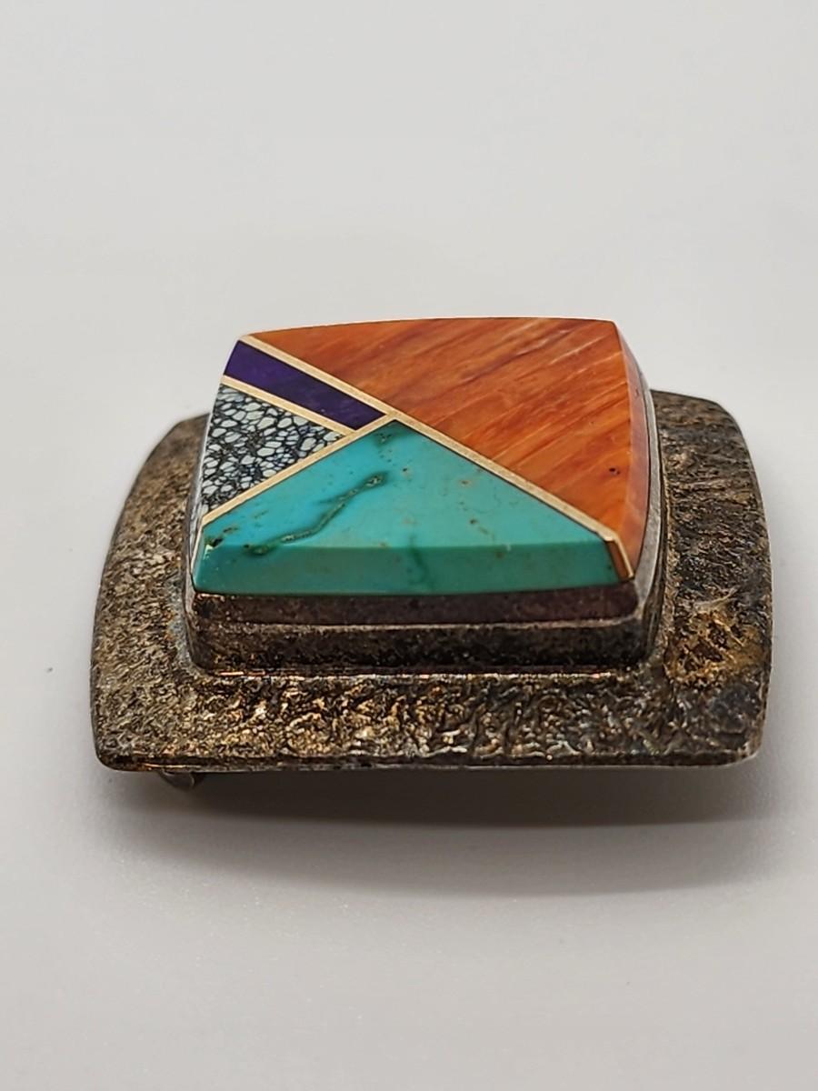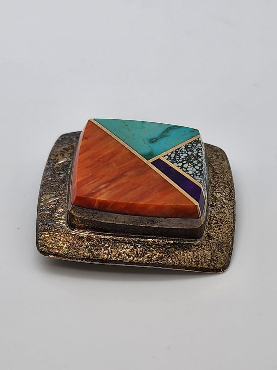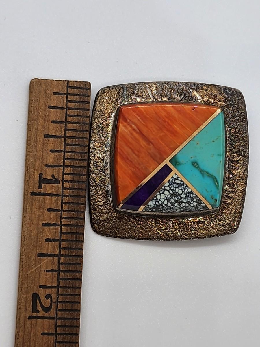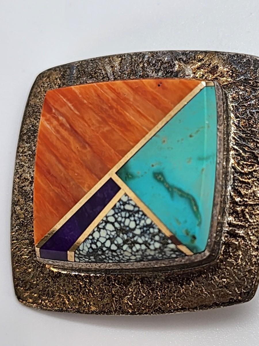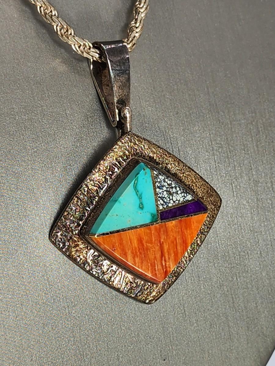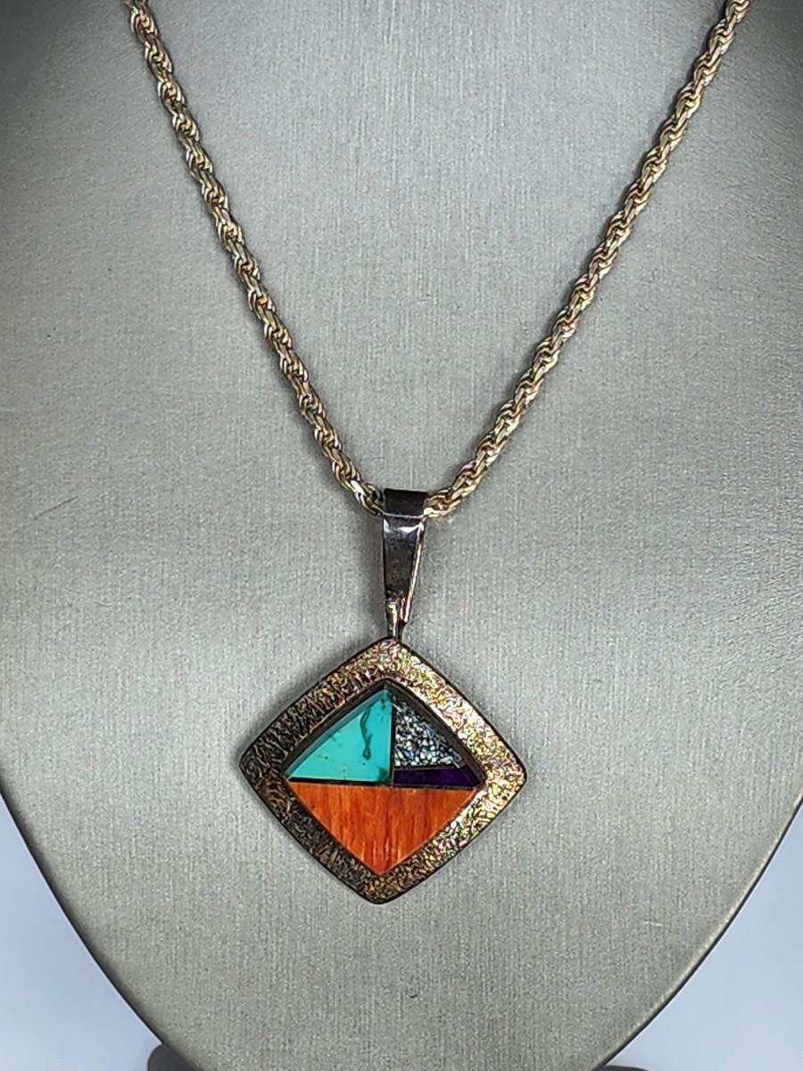 LOT 36:: Vintage Beautiful Inlaid Turquoise and other gemstones Pendant/Brooch with removable Bail and a thick 18"L Chain 925 Italy