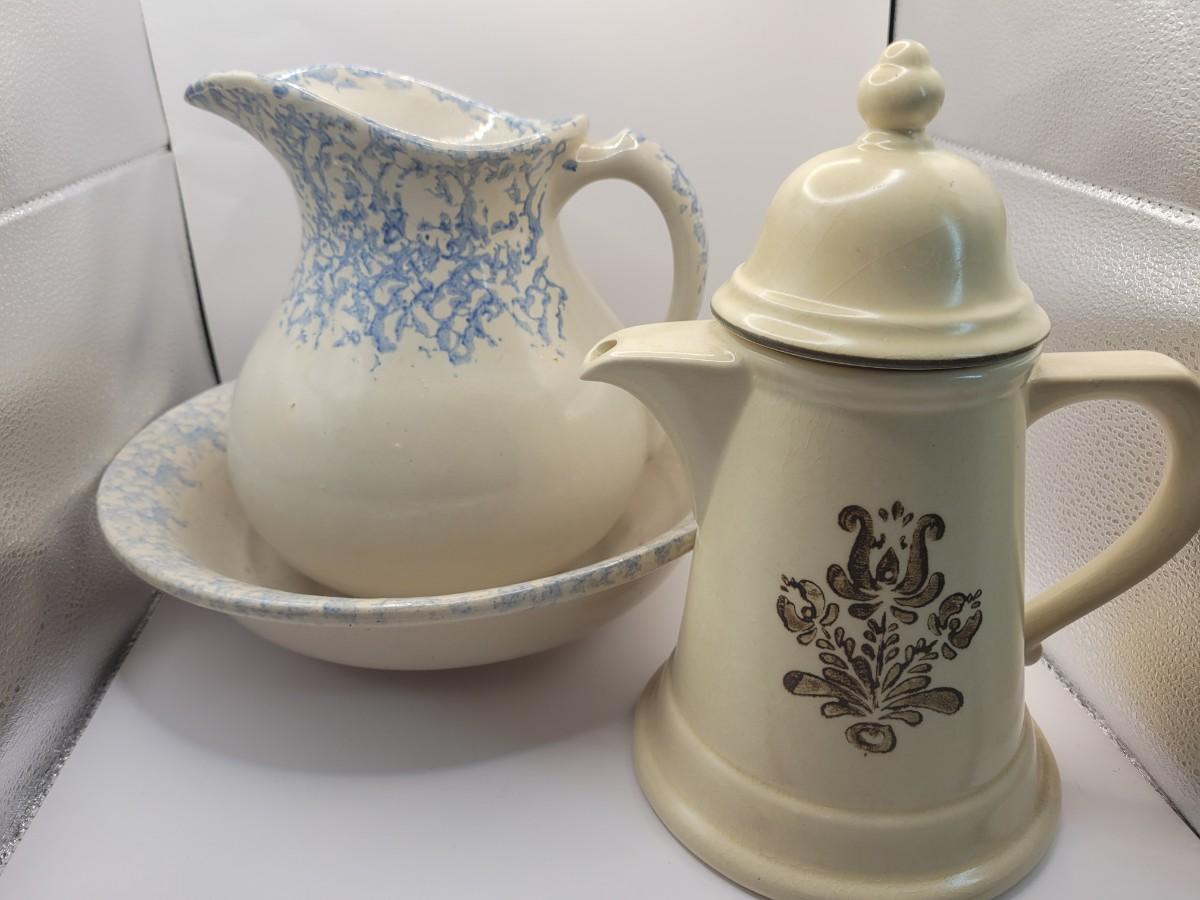 LOT:: 59 Pfaltzgraff Teapot & Roseville Pottery Wash Basin & Pitcher