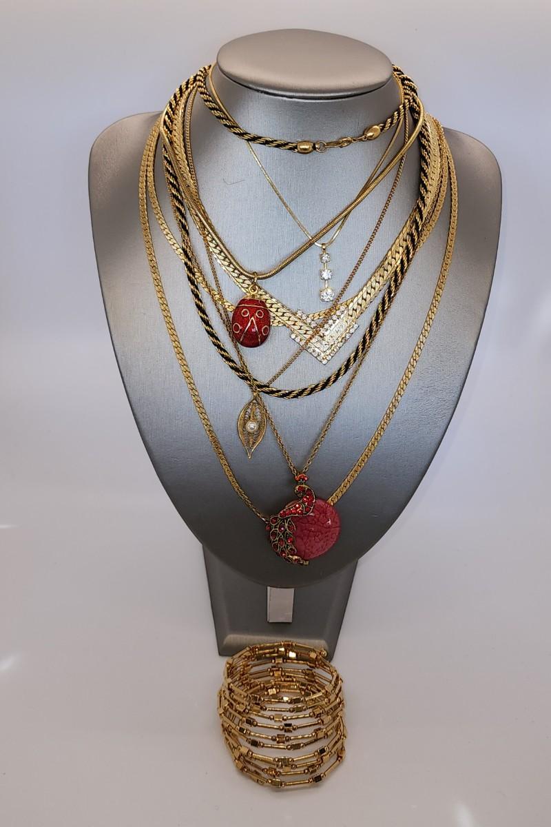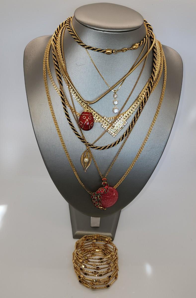 LOT:: Fashion Necklaces and a long gold tone wrap bracelet, featuring Trifari Chain and more