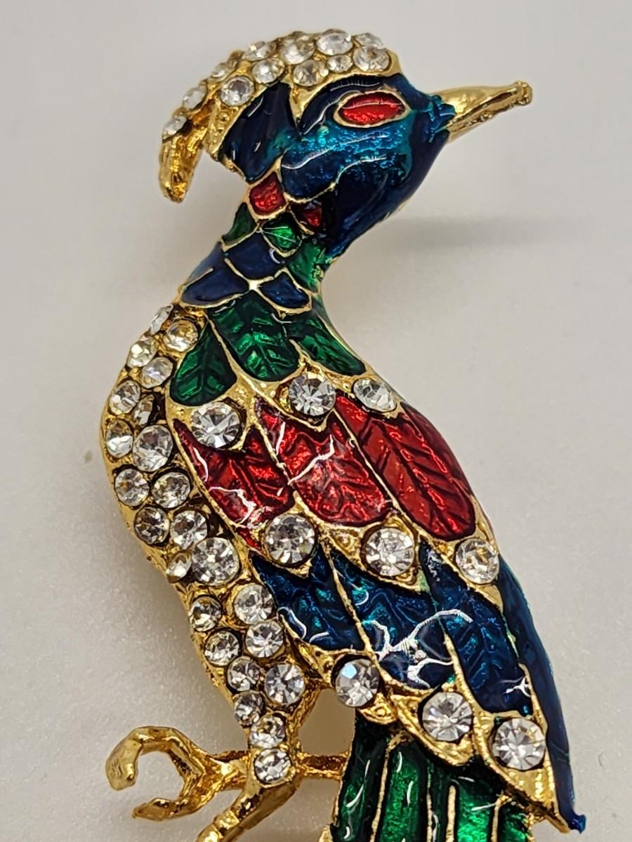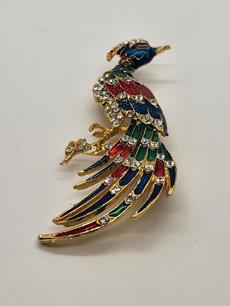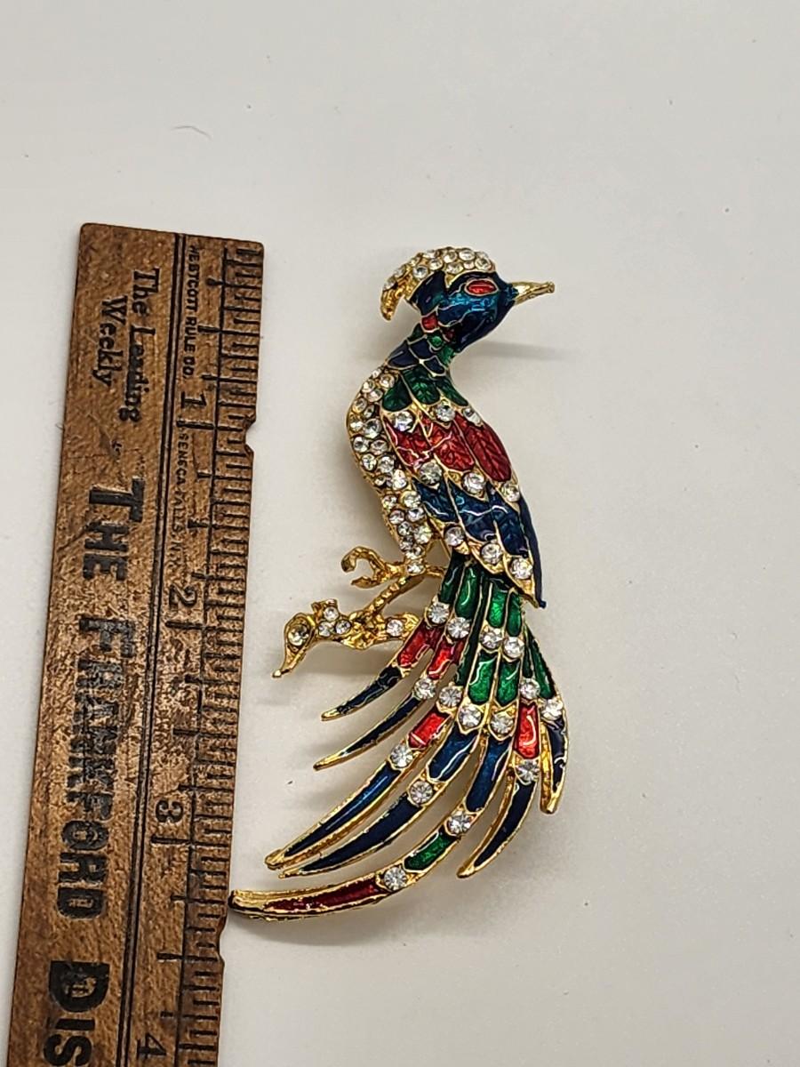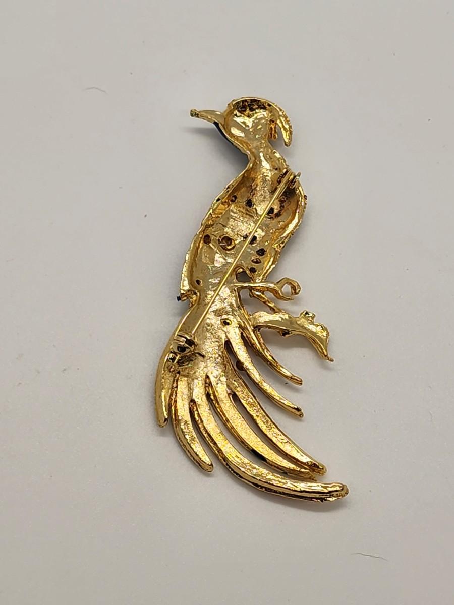 LOT 103:: Huge Goldtone Bird Of Paradise Brooch Pin Rhinestones Enamel Red Blue Green