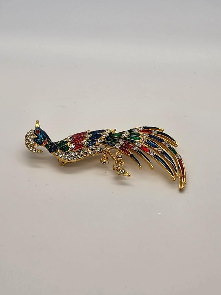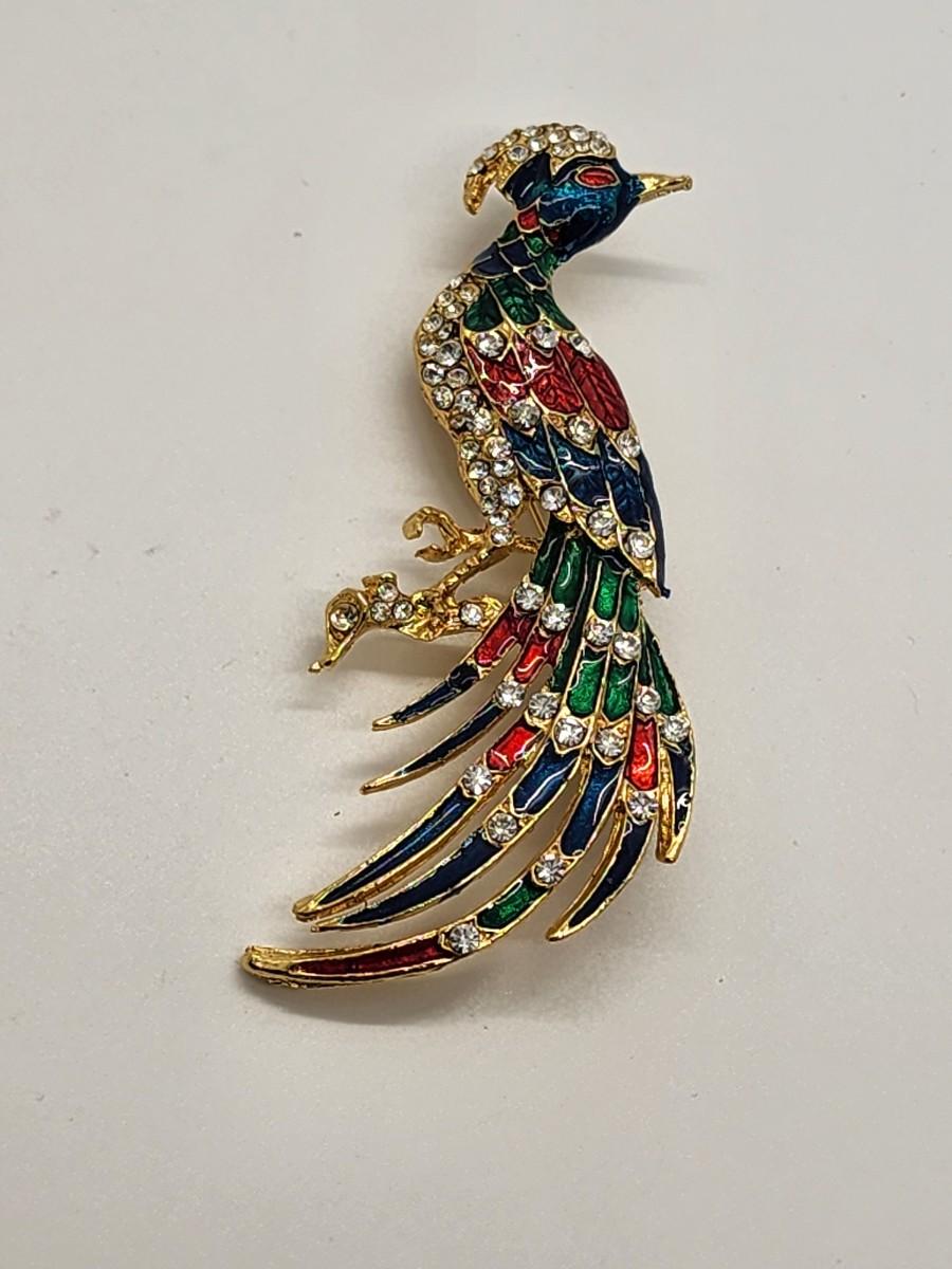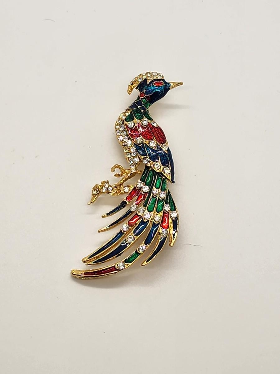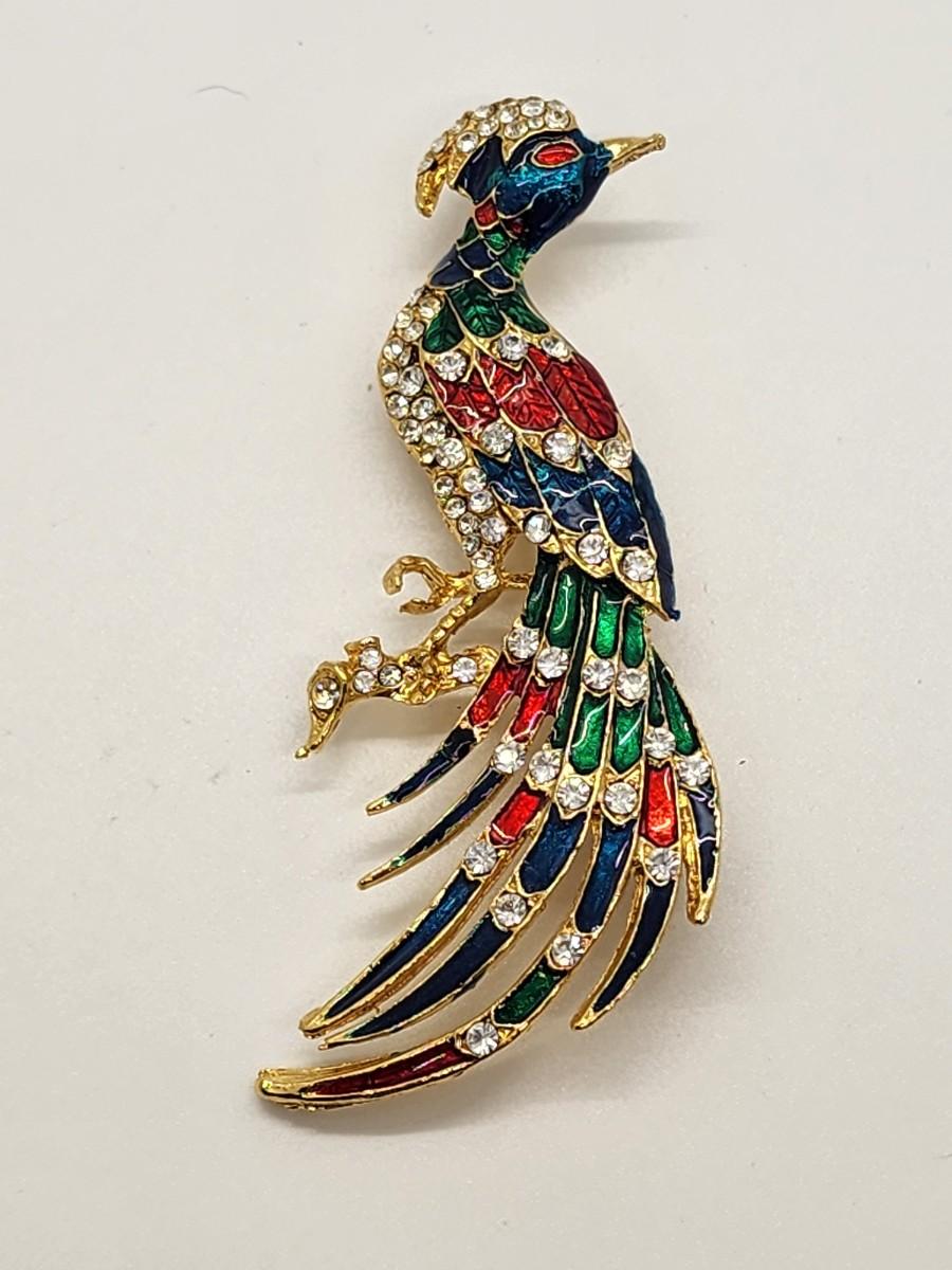 LOT 103:: Huge Goldtone Bird Of Paradise Brooch Pin Rhinestones Enamel Red Blue Green