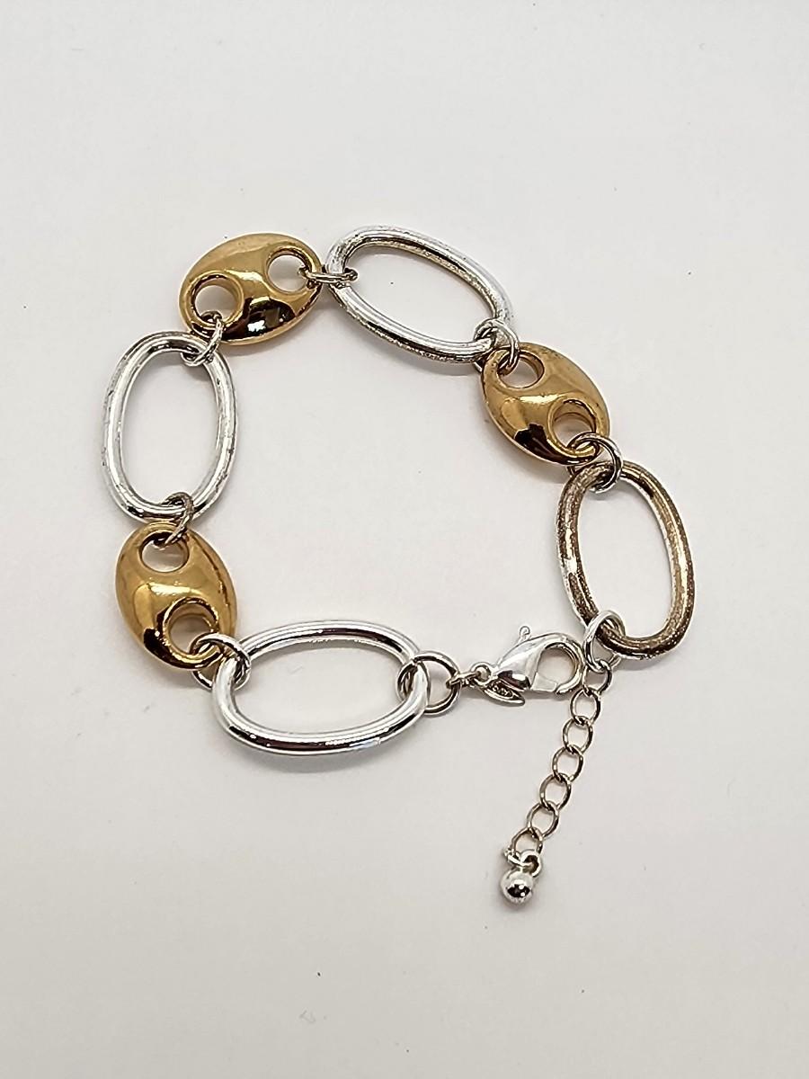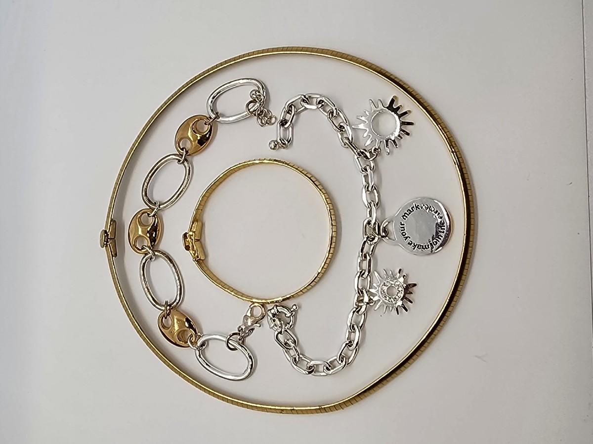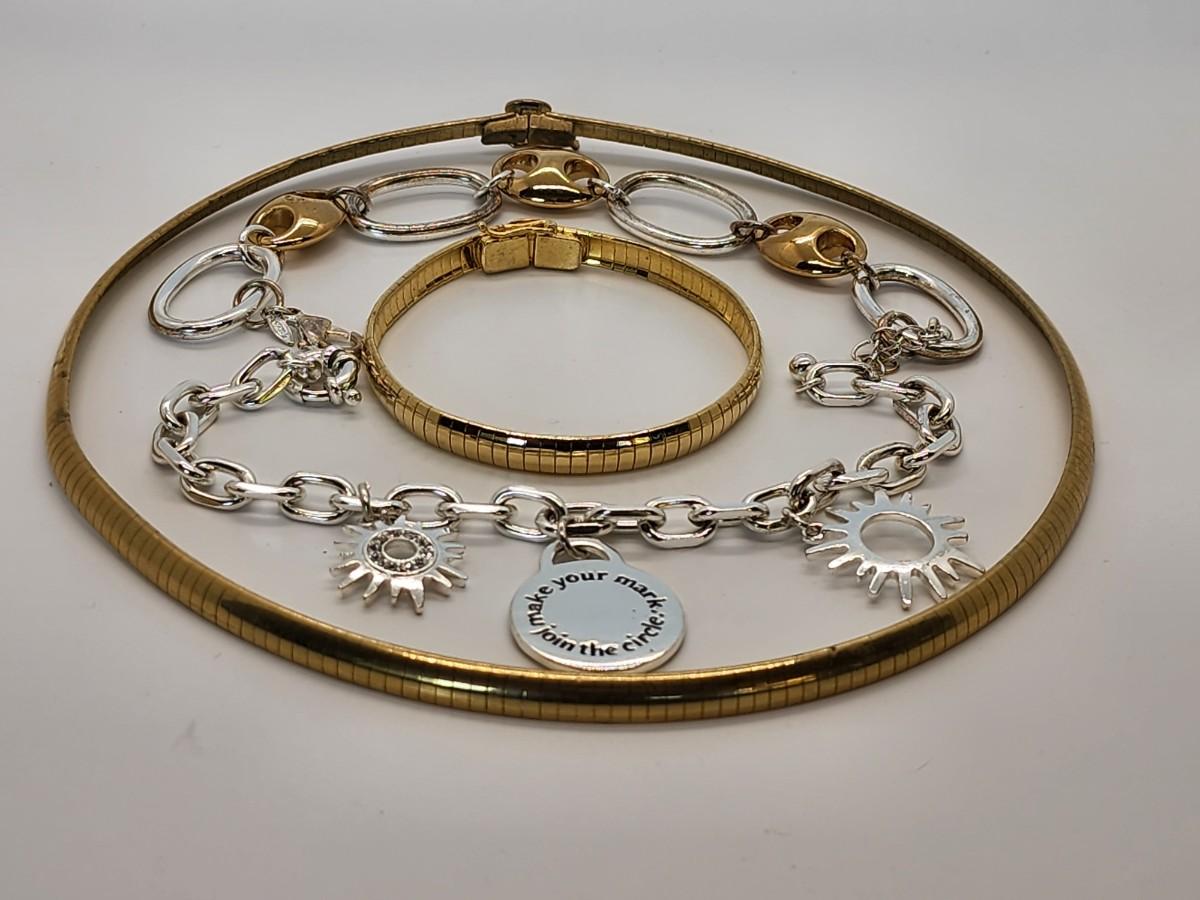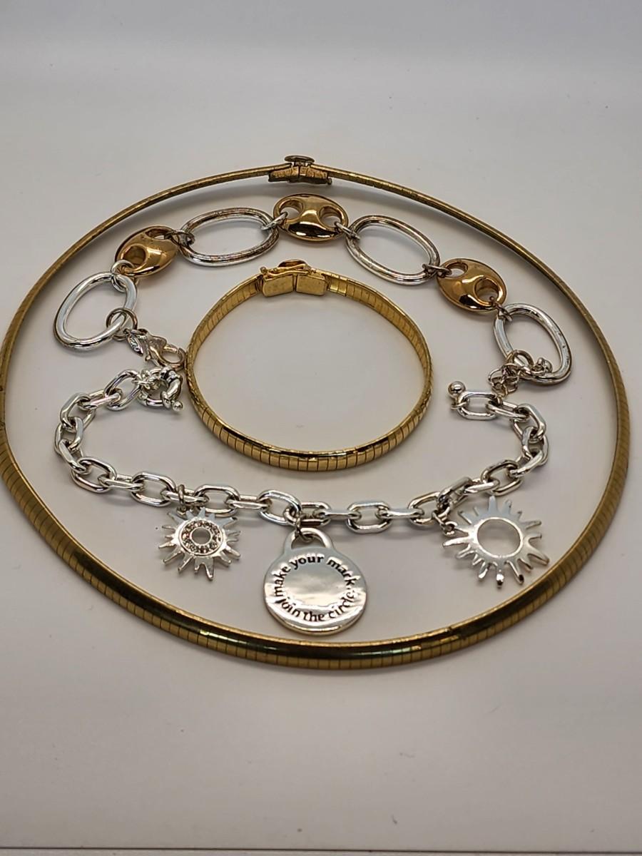 LOT 104:: Vintage 18" L Goldtone Collar Necklace and 7" L Bracelet Set and 2 more bracelets