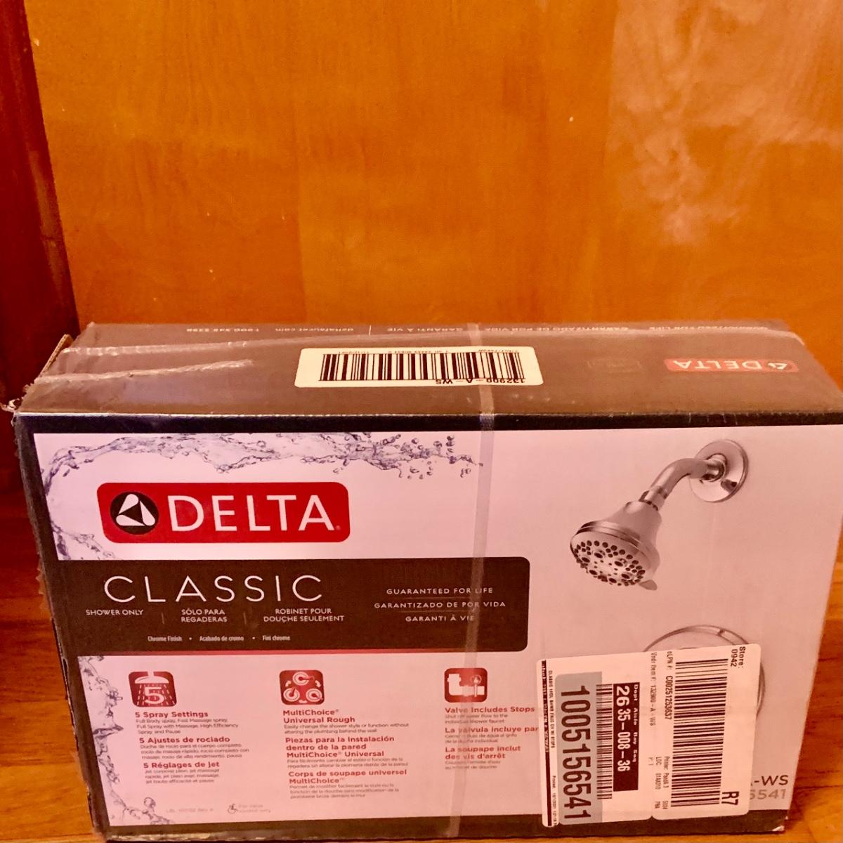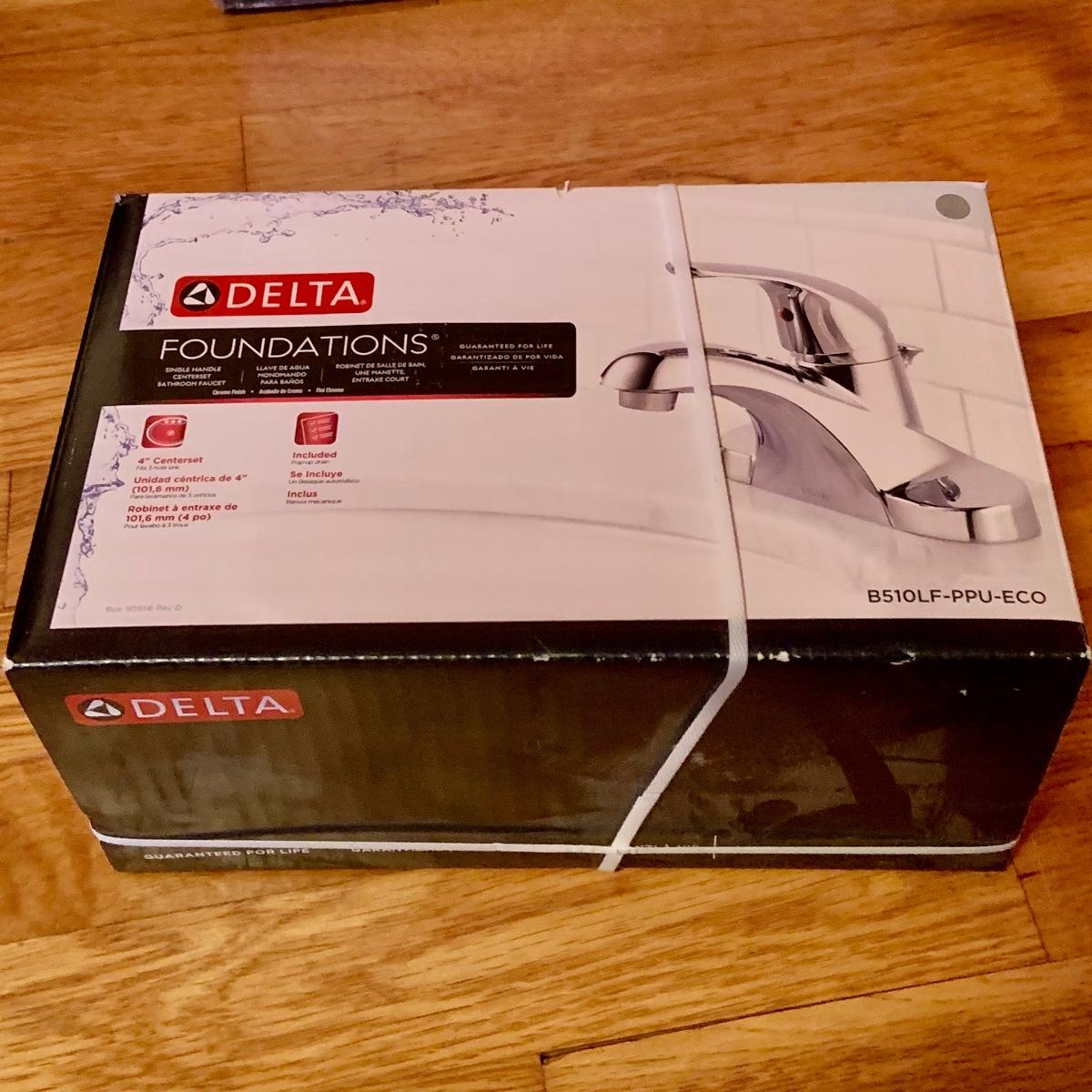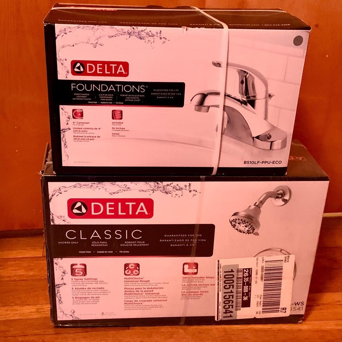 LOT57:: Delta Foundations Single Handle Bathroom Faucet Model B510LF-PPU-ECO In Unopened Box adn Delta Classic Shower Head In Opened Box