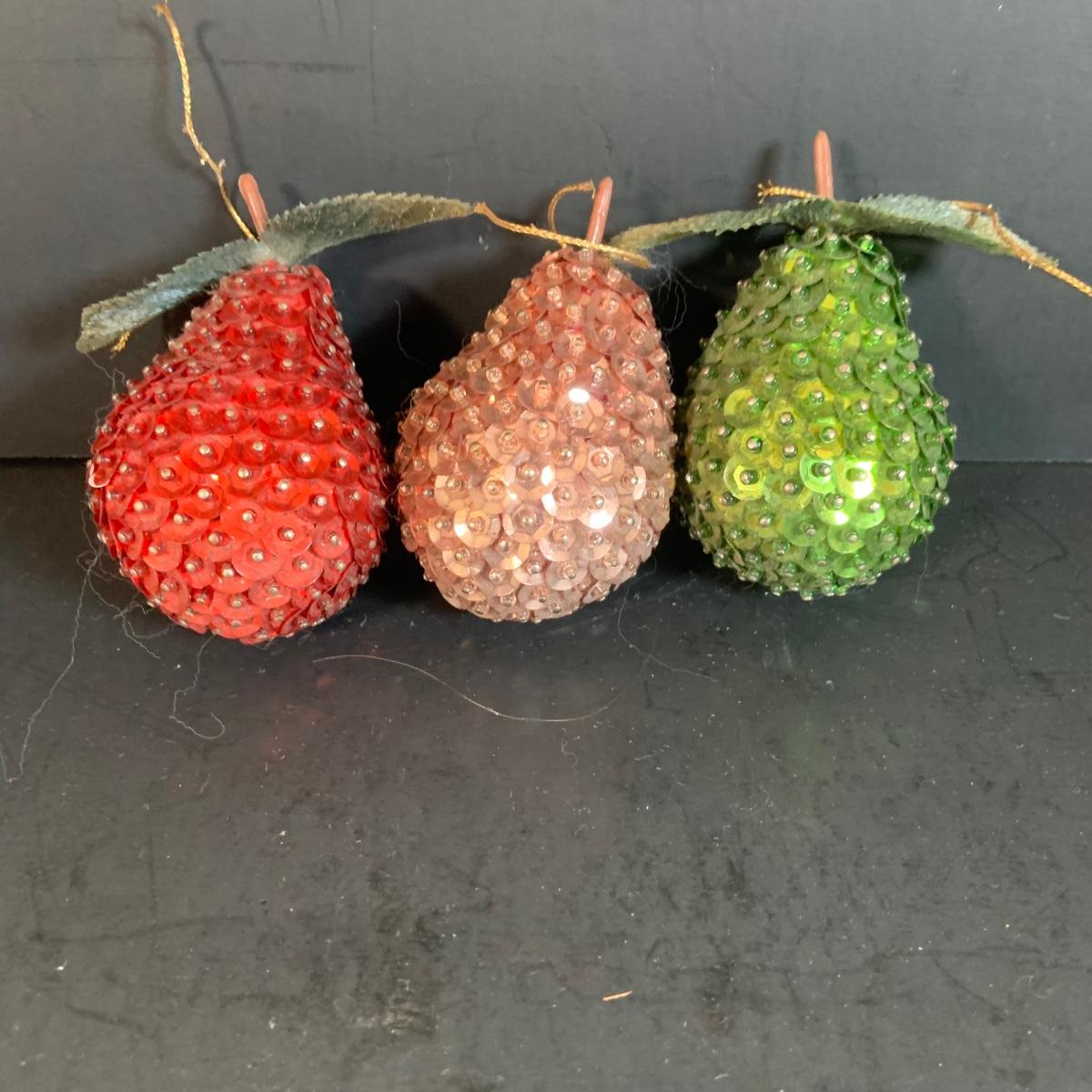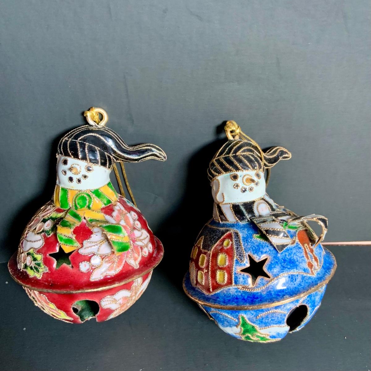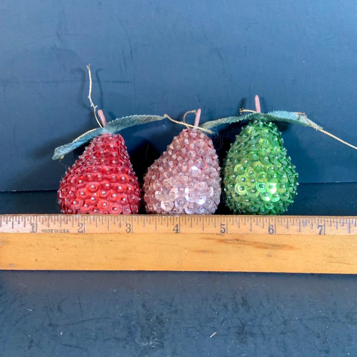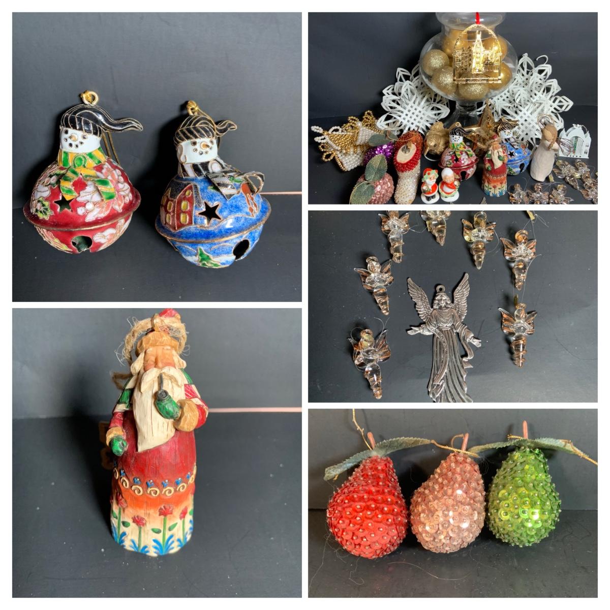 LOT:71: Cloisonne Snowman Sleigh Bells, Jim Shore Santa Ornament, Mid Century Push Pin Sequin Fruit Ornaments & Vintage Christmas Decorations
