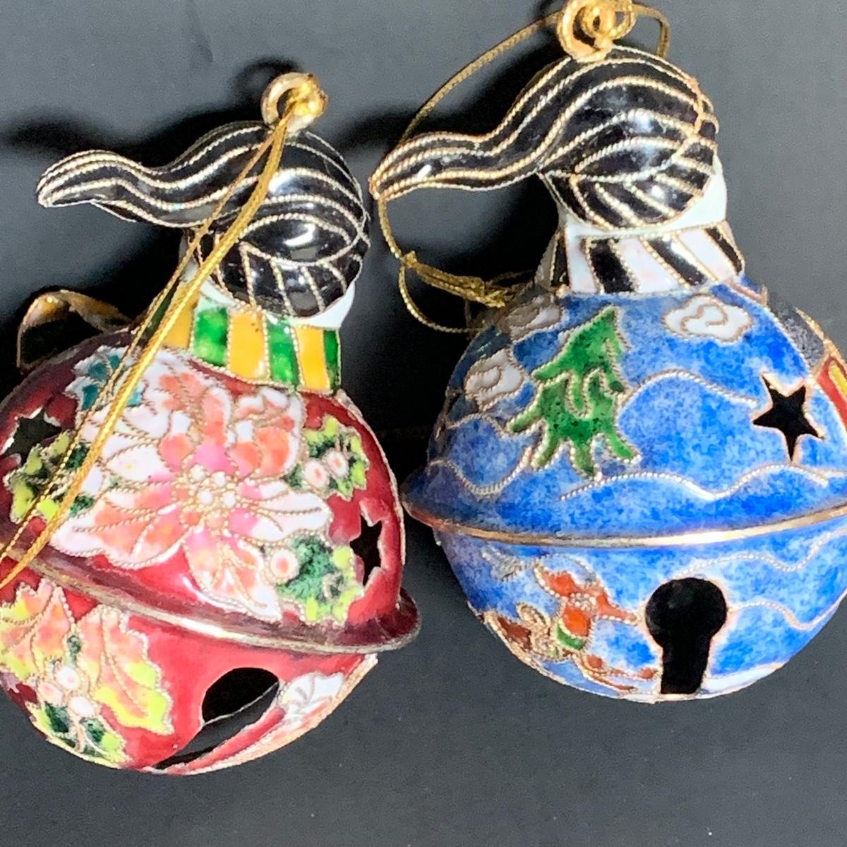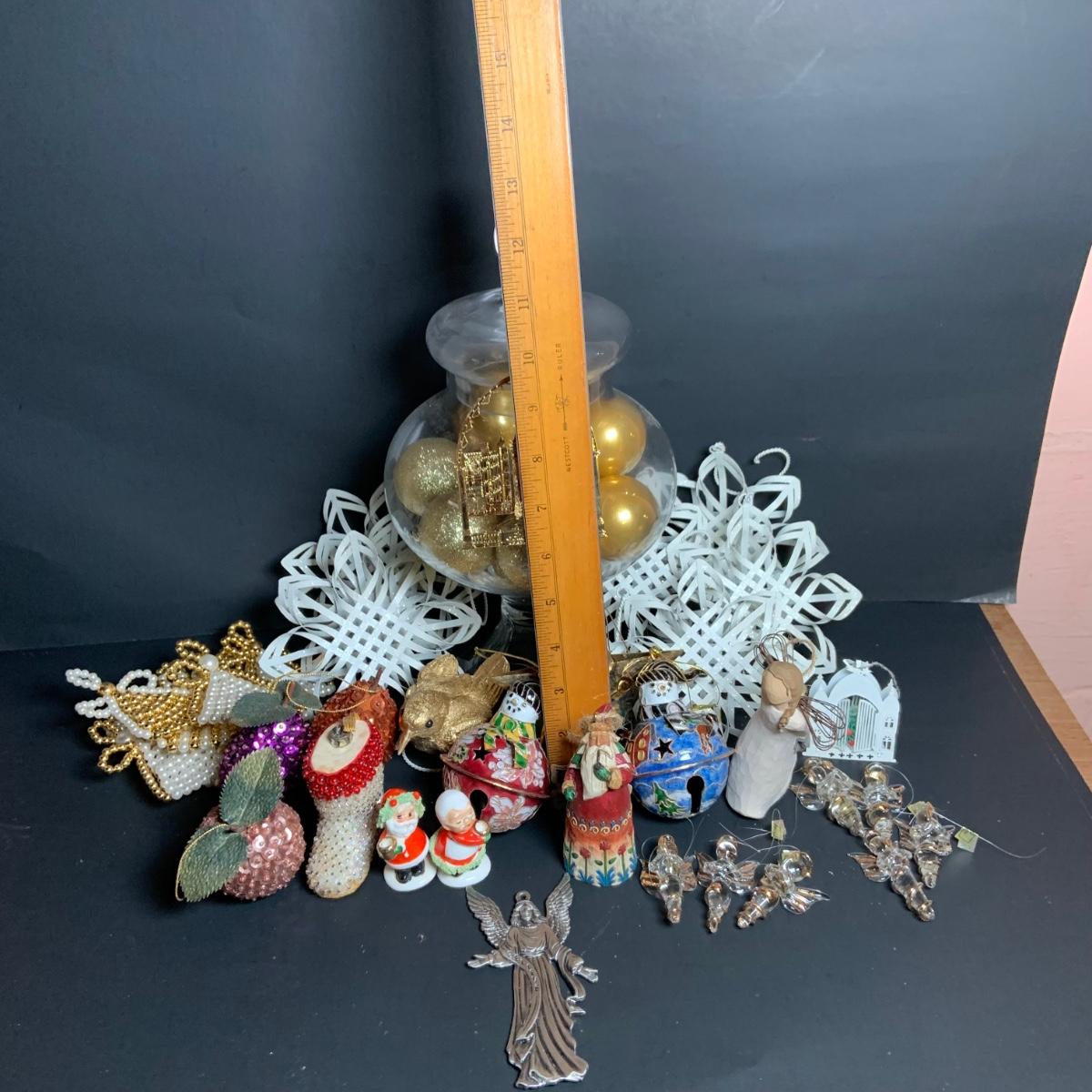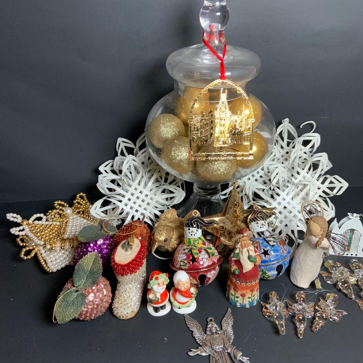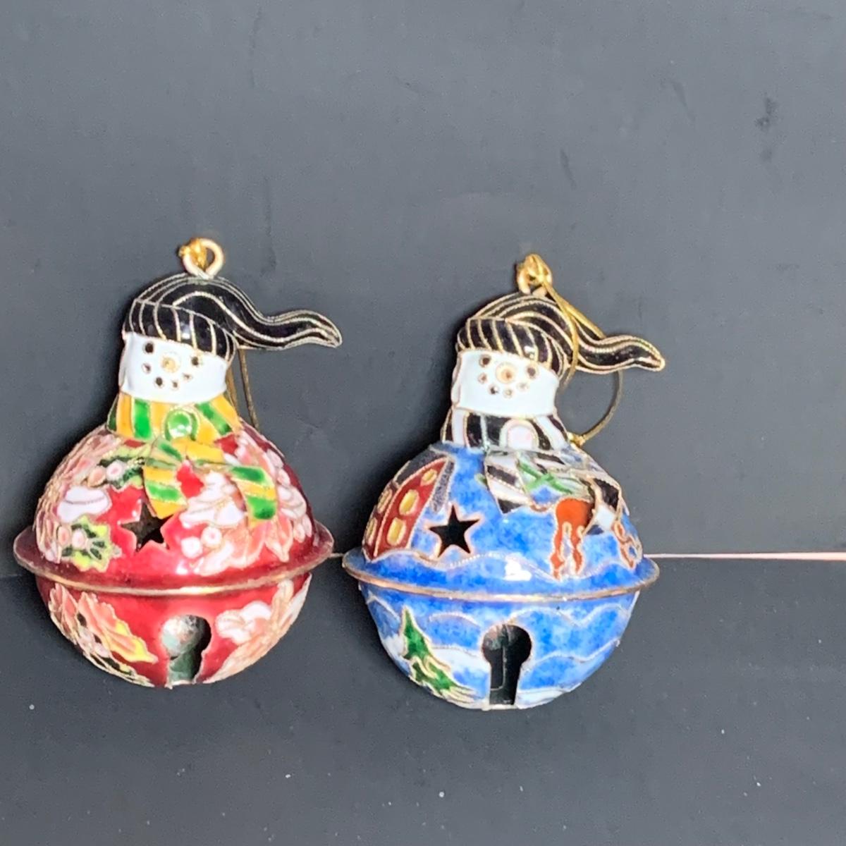 LOT:71: Cloisonne Snowman Sleigh Bells, Jim Shore Santa Ornament, Mid Century Push Pin Sequin Fruit Ornaments & Vintage Christmas Decorations