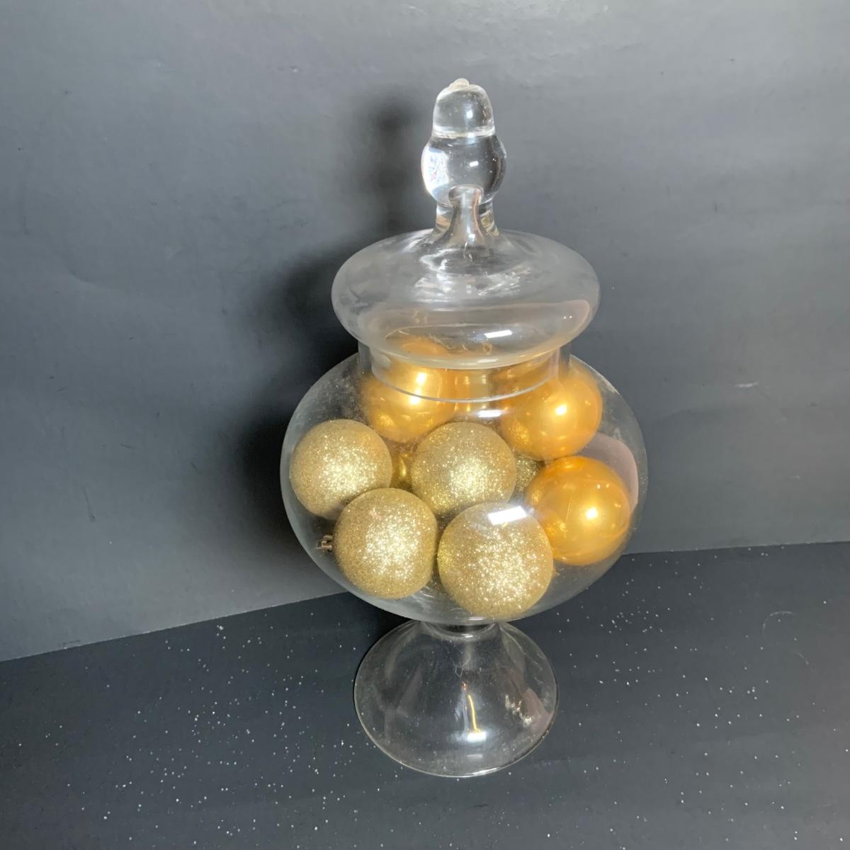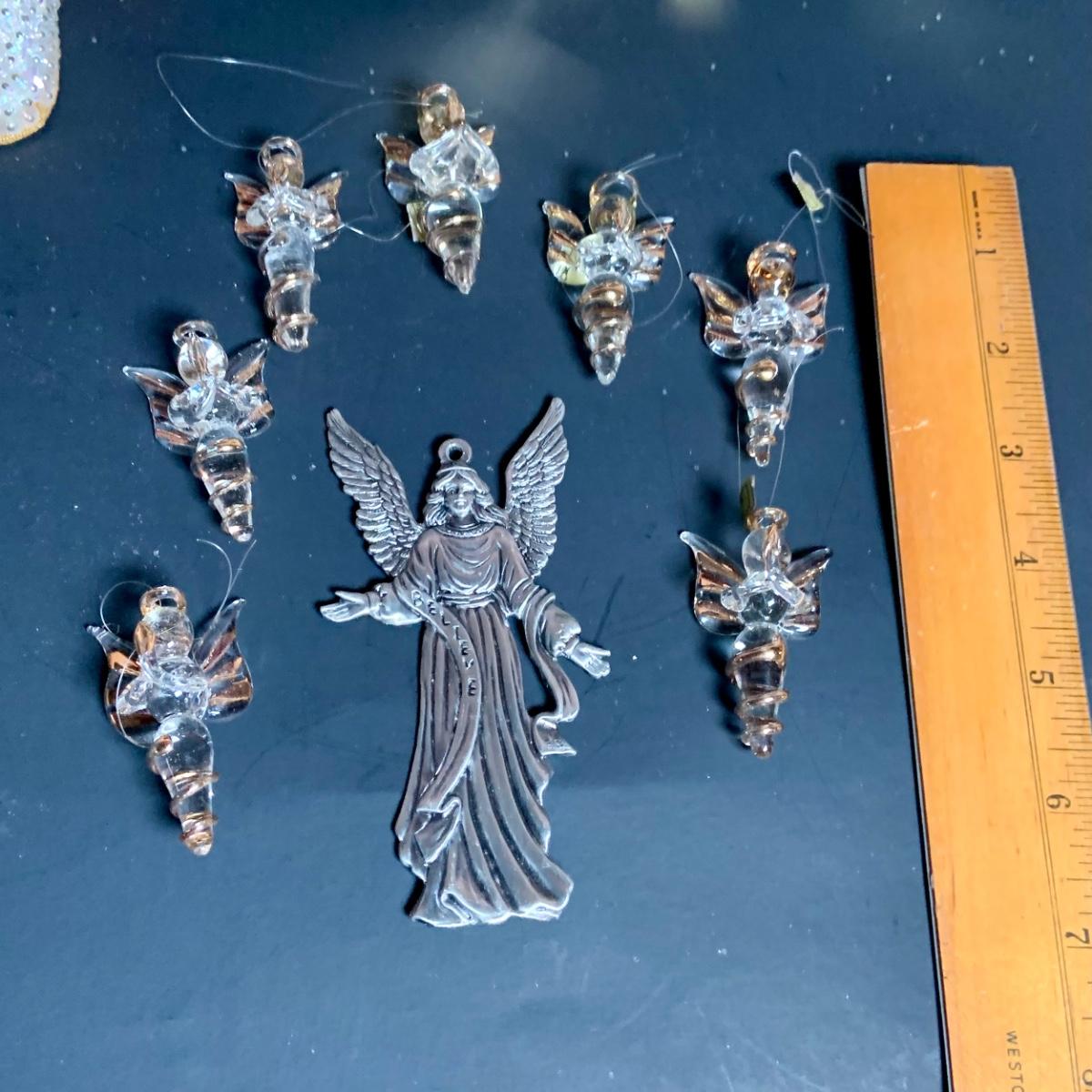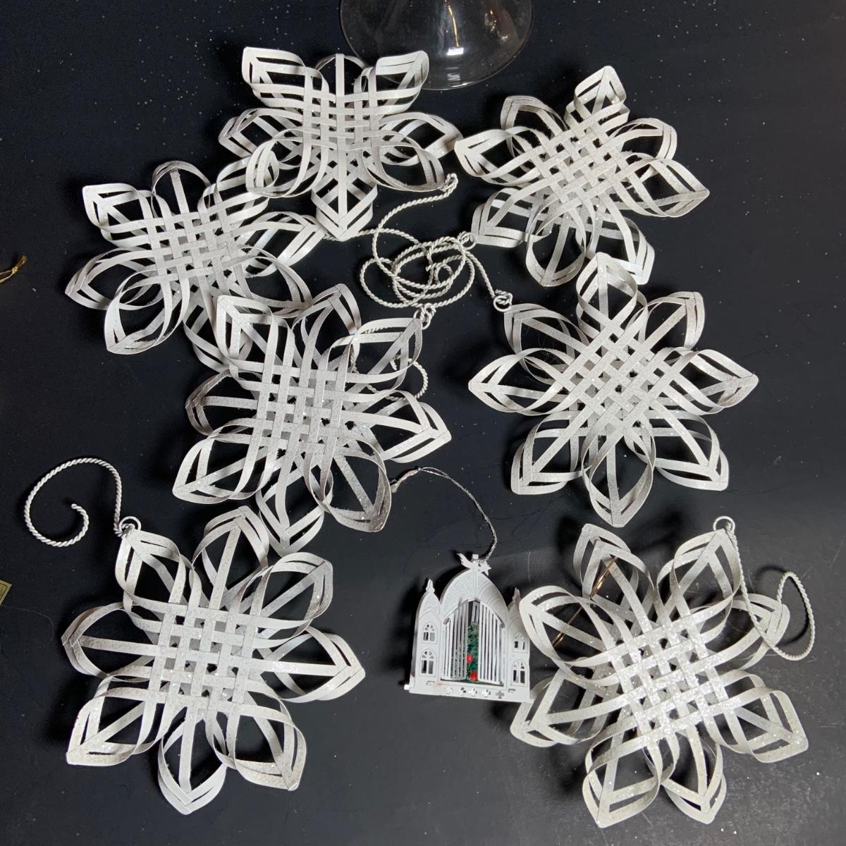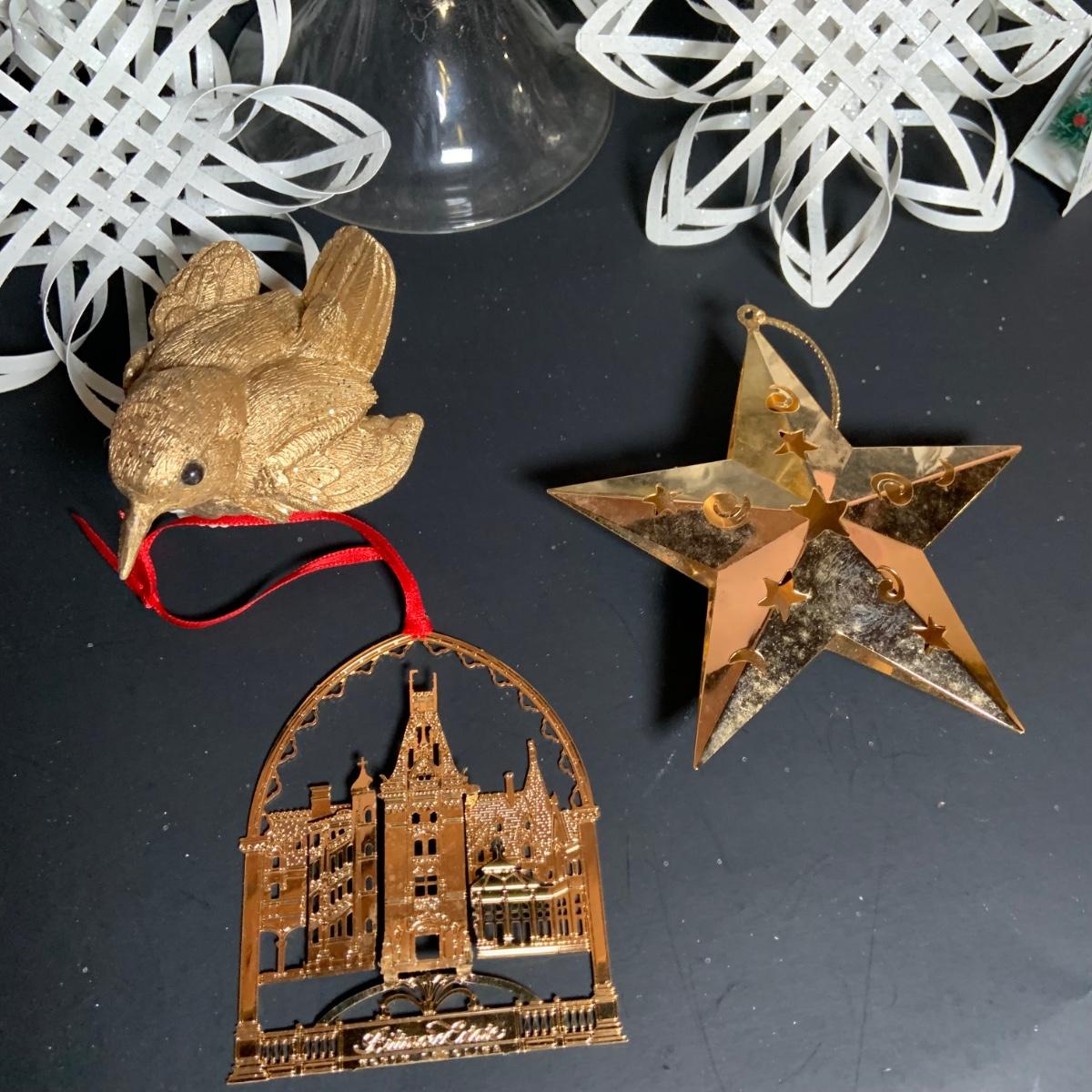 LOT:71: Cloisonne Snowman Sleigh Bells, Jim Shore Santa Ornament, Mid Century Push Pin Sequin Fruit Ornaments & Vintage Christmas Decorations